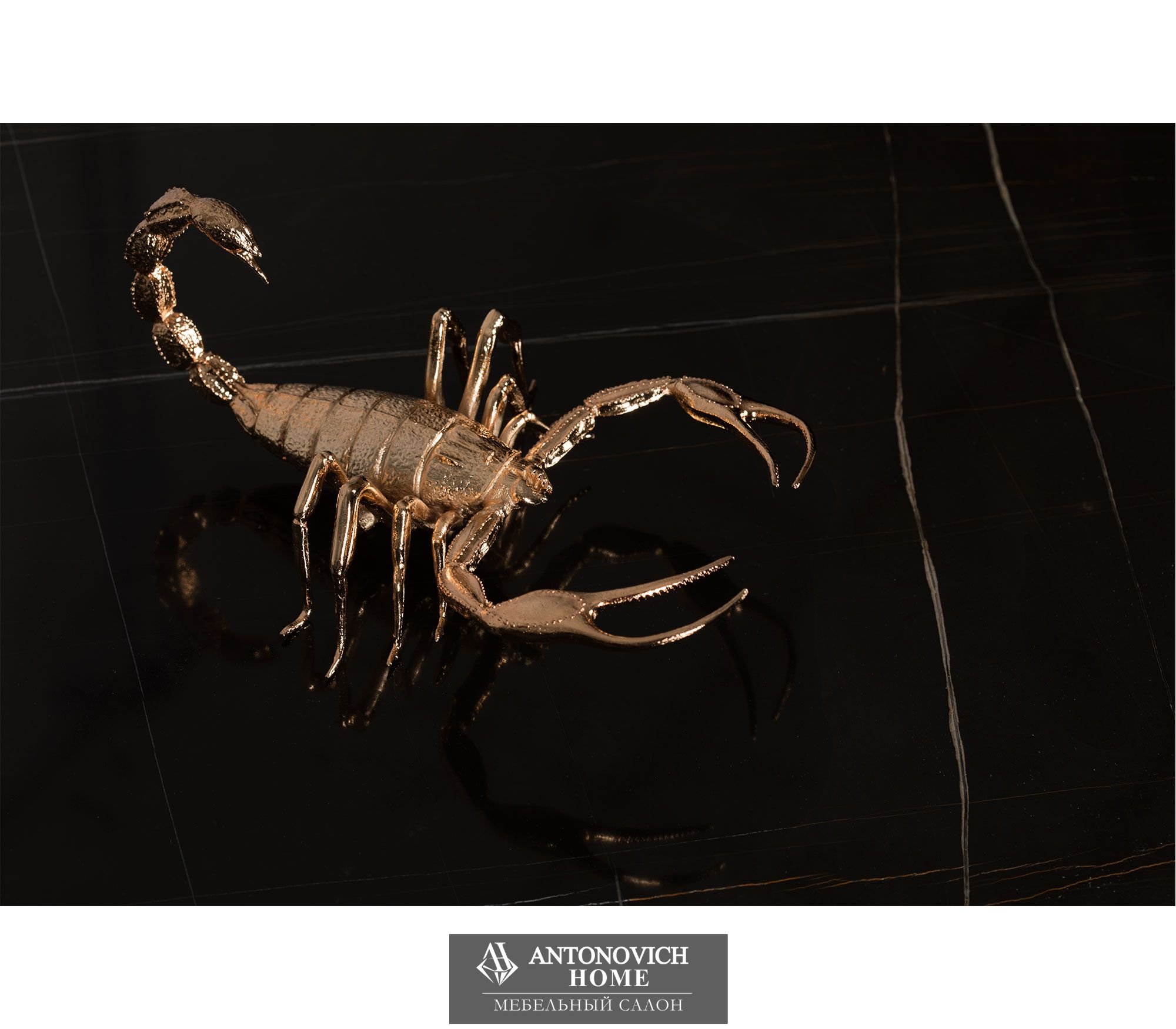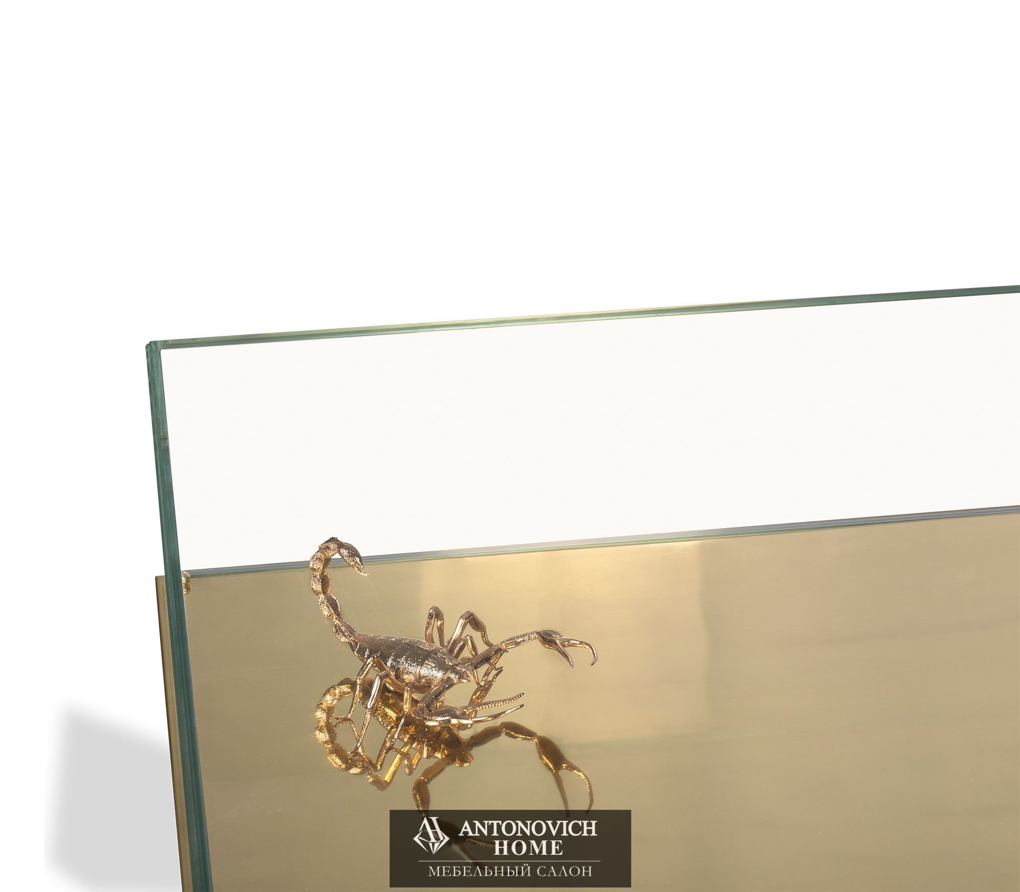 Журнальный стол состоит из двух фрагментов, отделанных зеркалом и благородным мрамором и украшенных присутствием золотых существ.