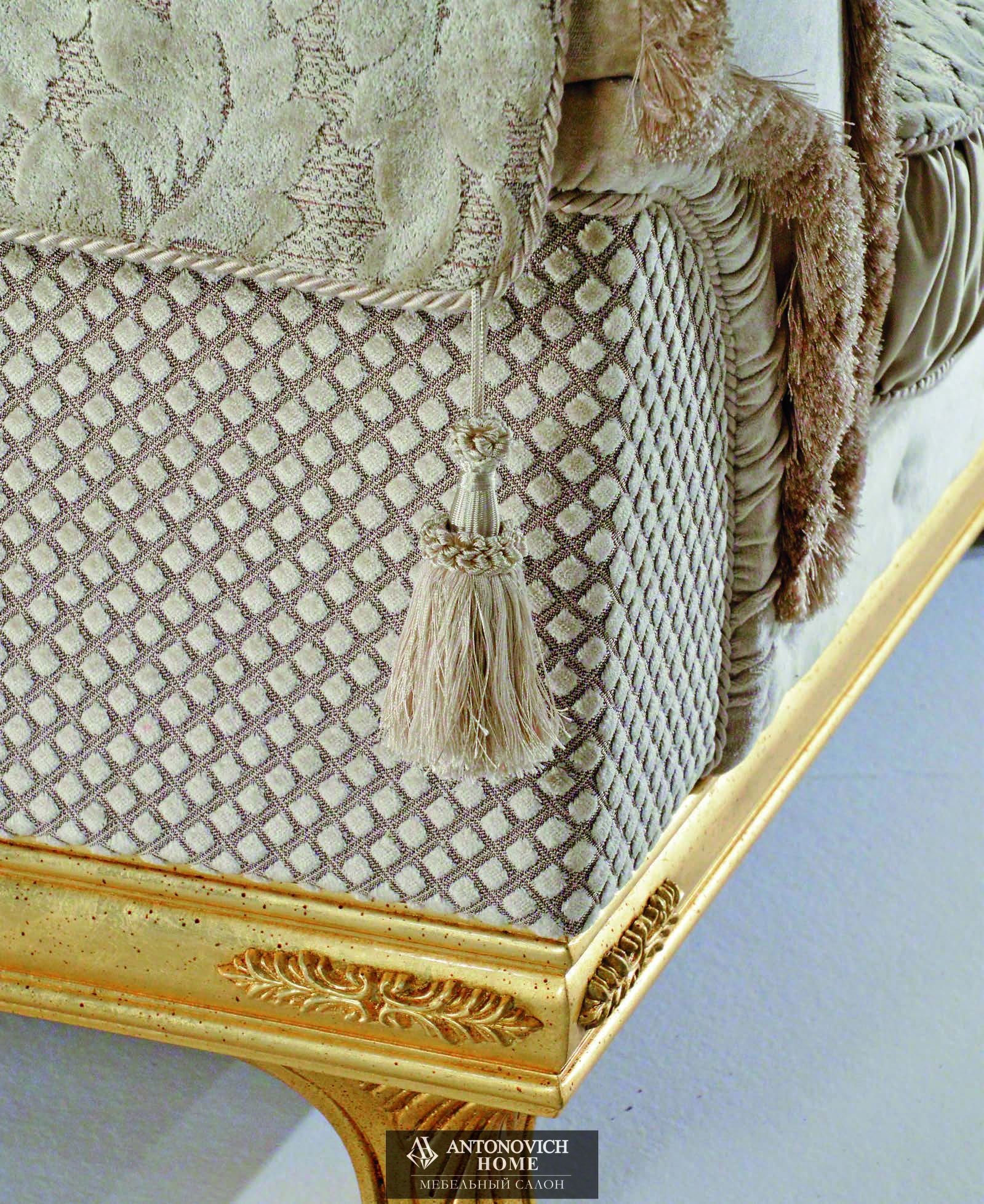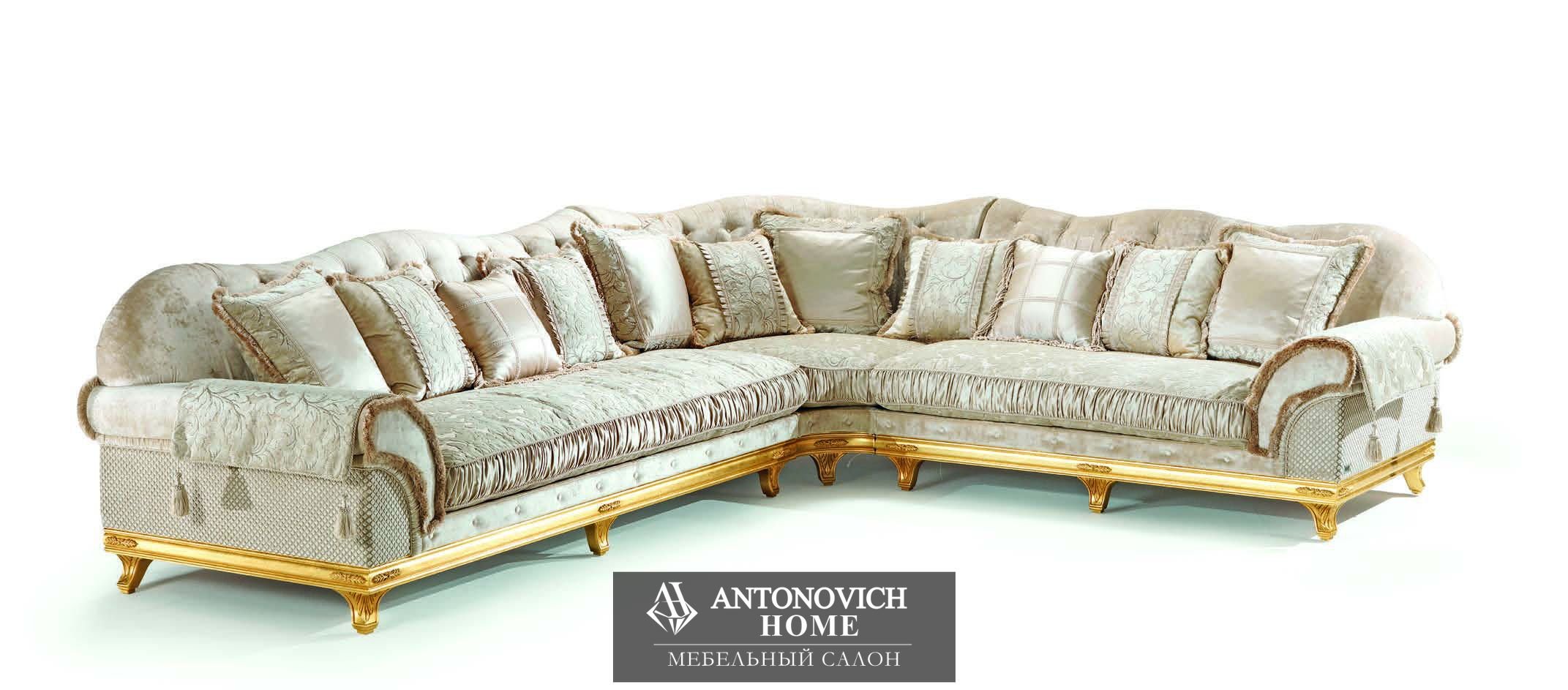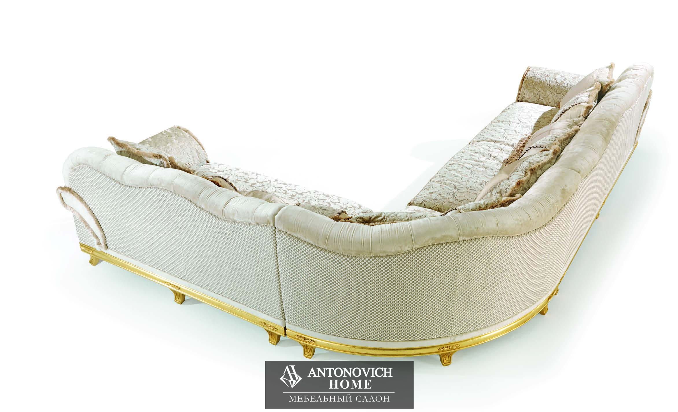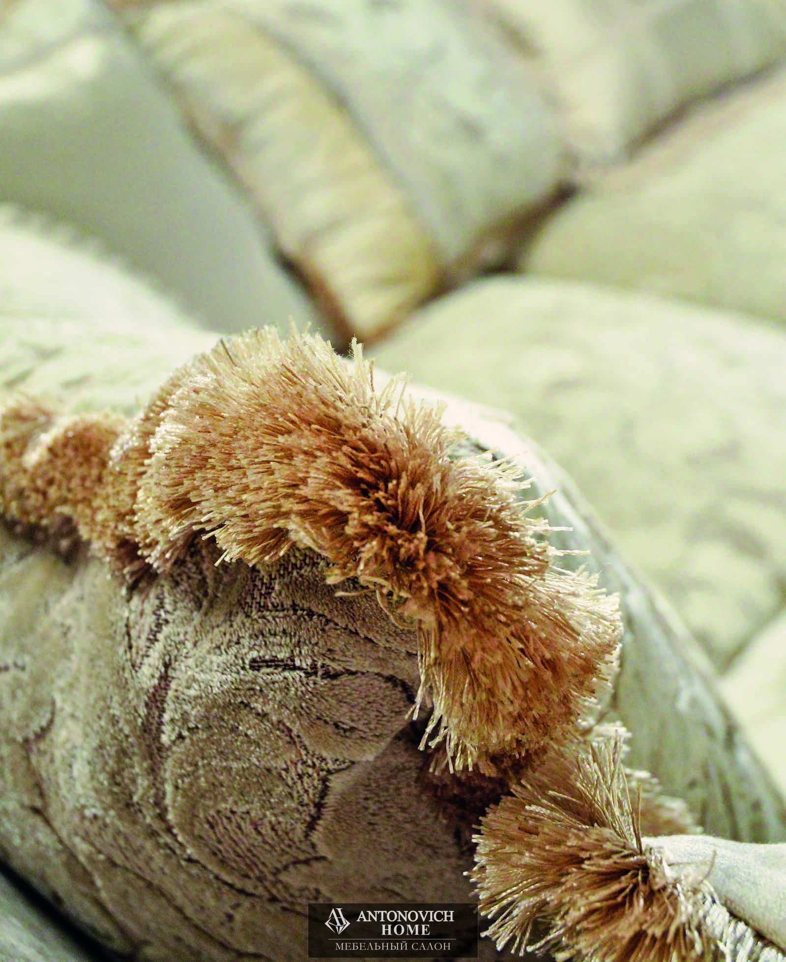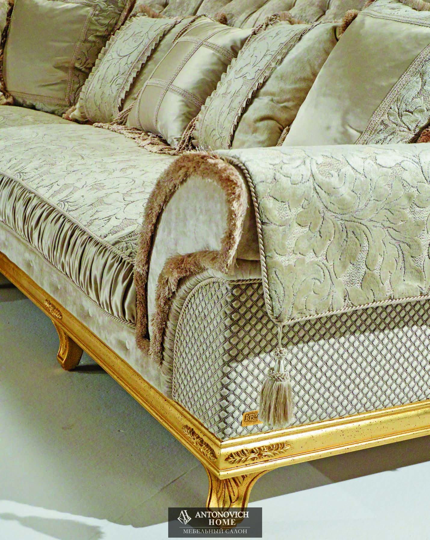 Диван с частично съемными чехлами. Каркас из елового дерева и многослойной фанеры из тополя со вставками из бука. Набивка из недеформируемого пенополиуретана с разными уровнями плотности. Двусторонние подушки сиденья с набивкой из гусиного пуха и пружинами с системой SUPER-SOFTSYSTEM. Чехлы для подлокотников, боковые подушки и основание из букового дерева входят в стандартный комплект поставки. Можно выбрать отделку бахромы и классического декоративного шнура. Отделка из золота или серебра листа с выбором высокой цене. По этой модели существует также вариант диван-кровати, в комплект поставки которой входят электросварная сетка и пружинный матрас выс. 12 см.