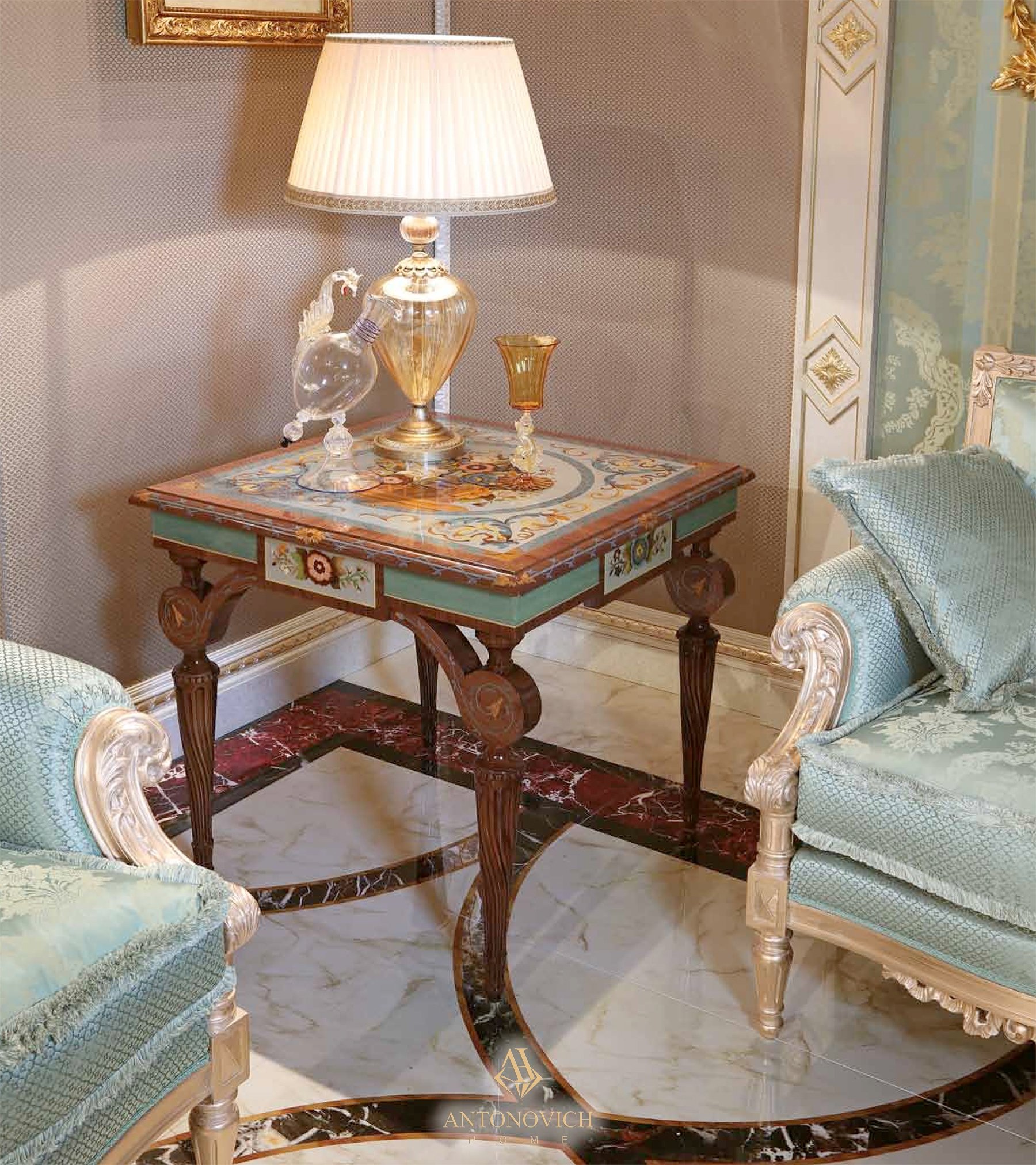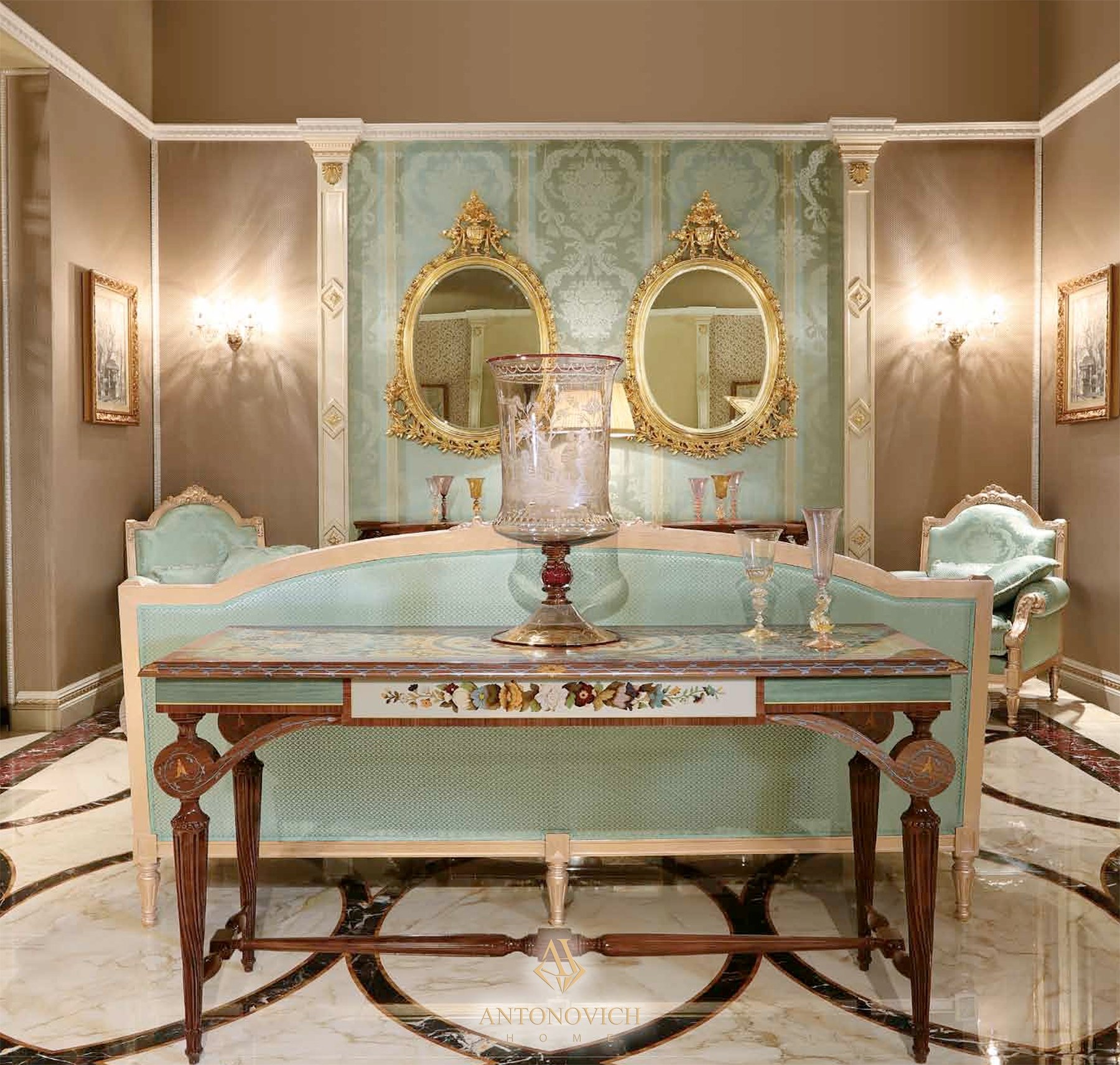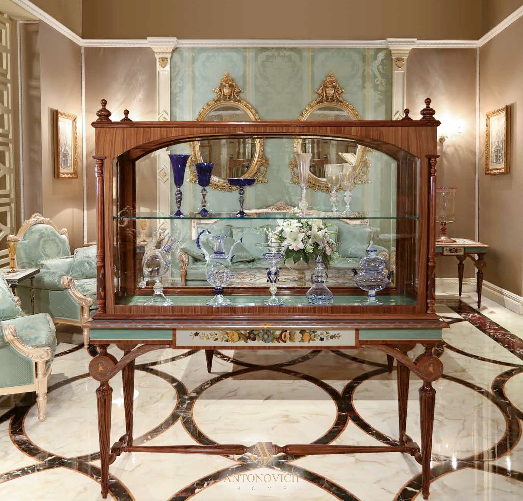 В коллекции мебели для гостиной Diantha культура итальянской школы мебельного производства, богатая цветами и тонами, трёхмерными инкрустациями, изысканным деревом и красивыми украшениями ручной работы, такими как перламутр — проявляется в прекрасных предметах мебели.