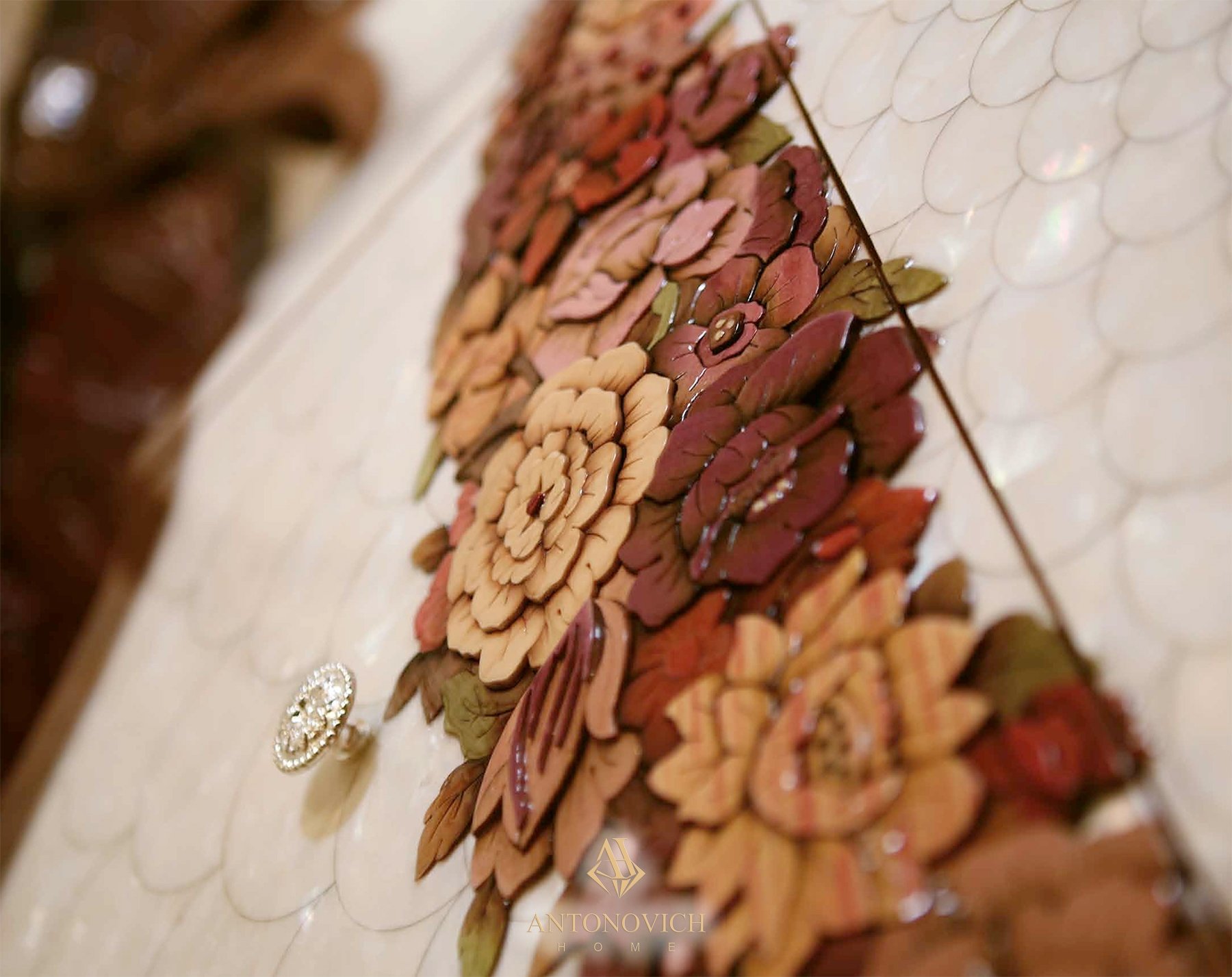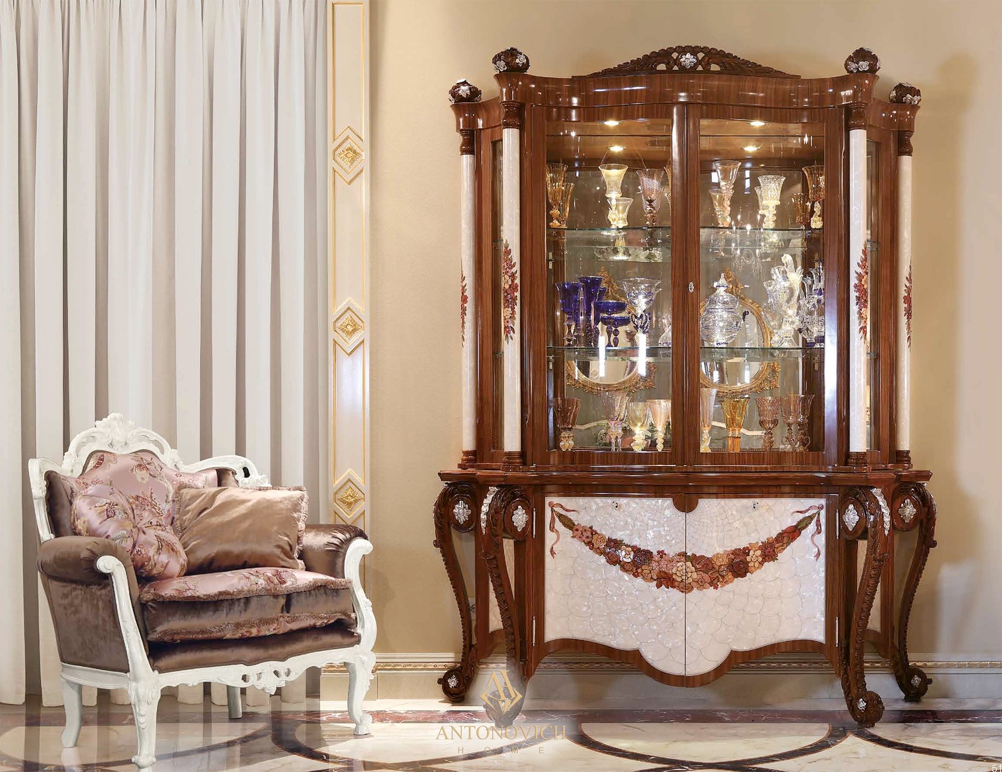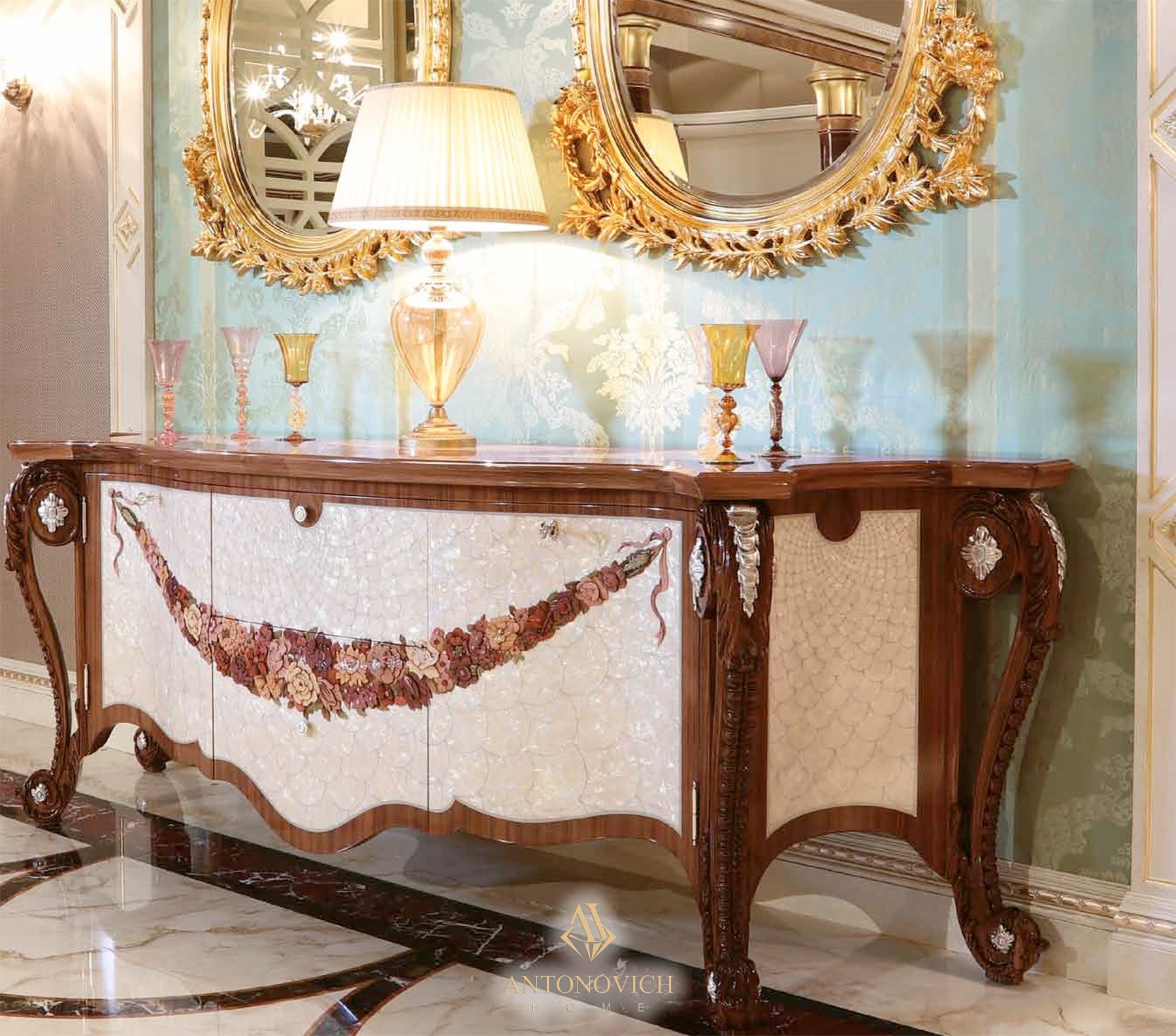 Классические и вневременные линии, сочетающиеся с перламутровыми и рельефными вставками, создают роскошные и стильные эффекты, где каждый предмет мебели сияет красотой.