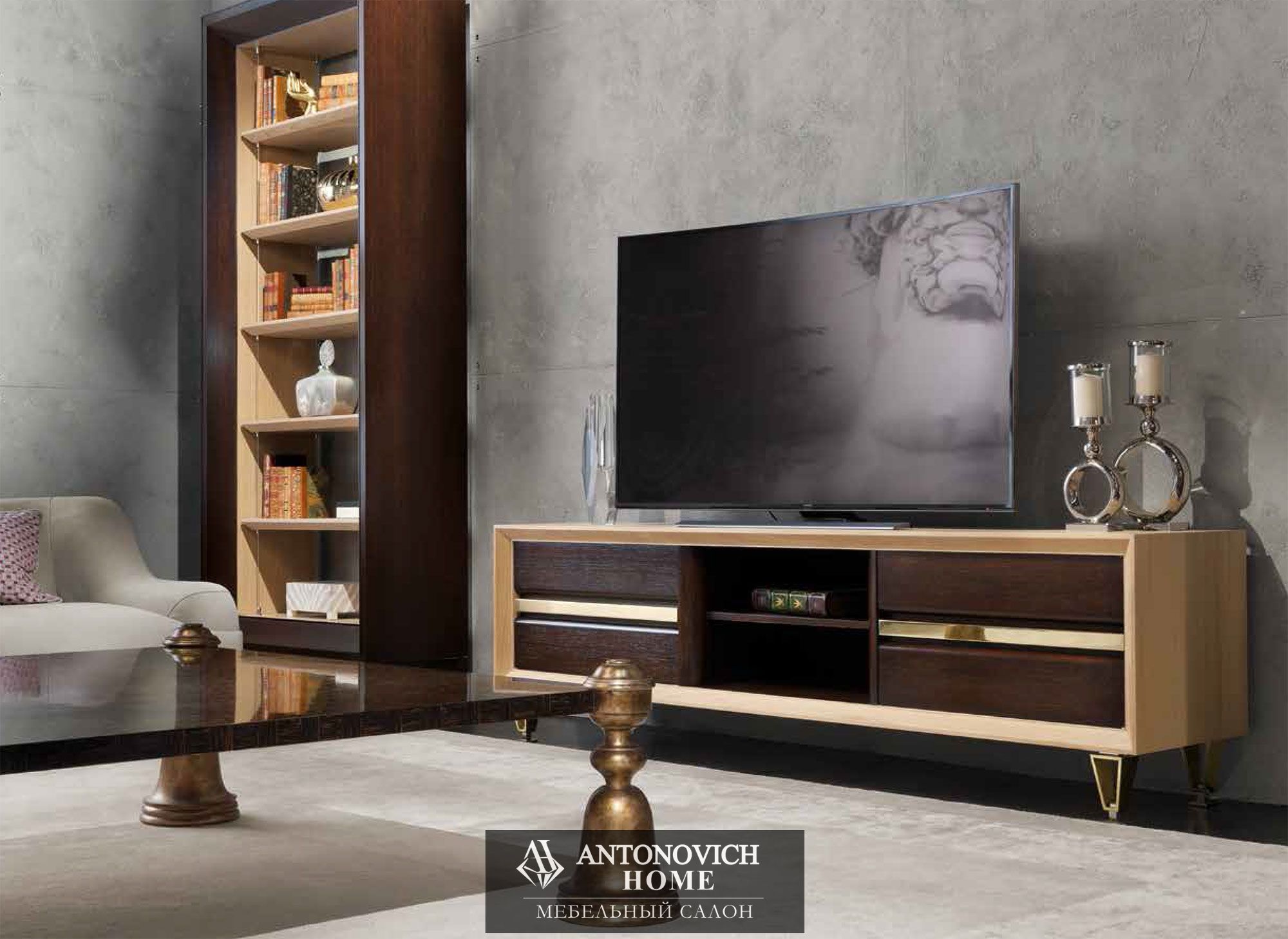 ТВ тумба с рамой из дуба и ящиками. Ножки из латуни и хромированных деталей.
