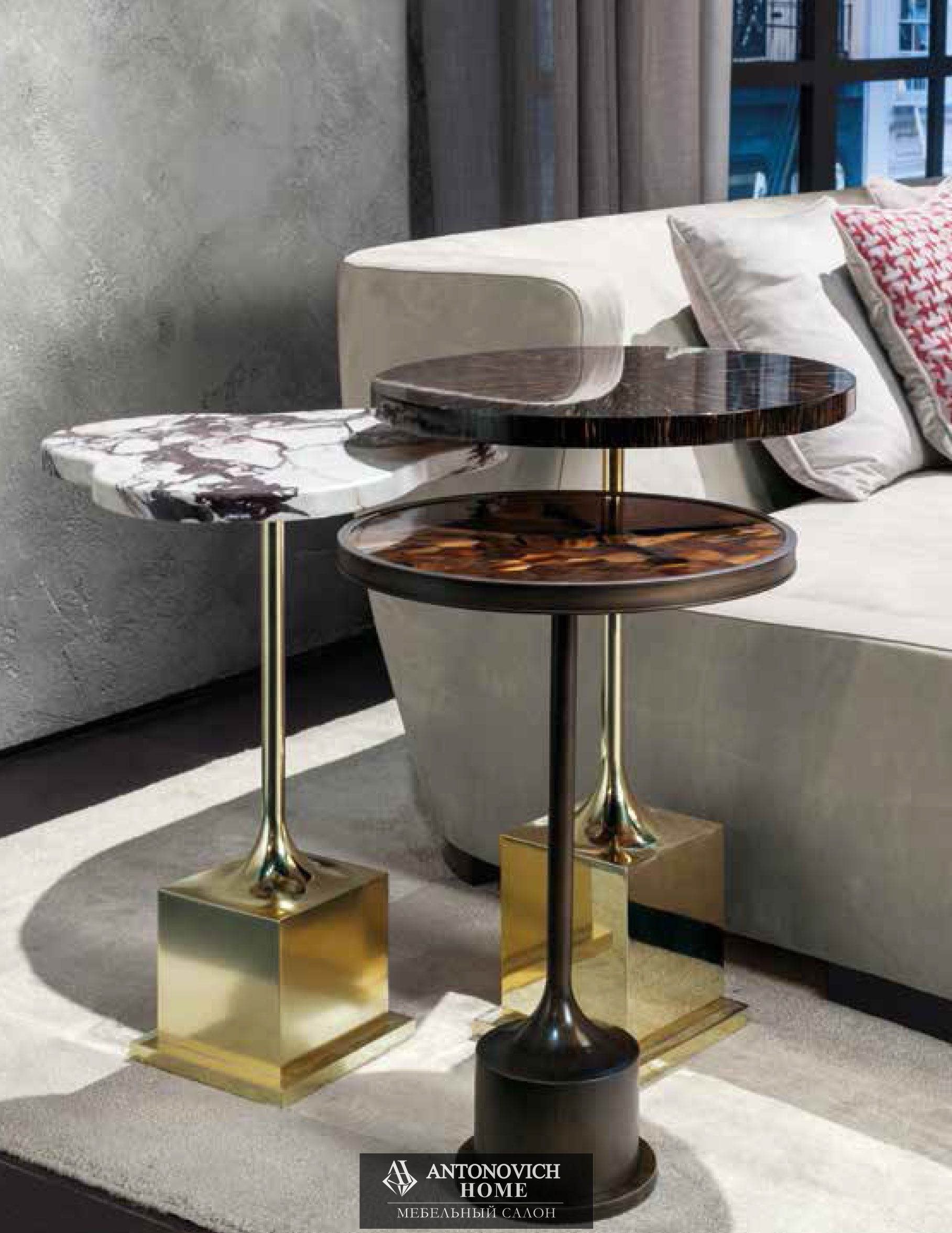 Три столика с пальмового дерева, мрамора и рога сверху. Ножки из латуни и бронзы. Латунный геридон с мраморной брекчией.