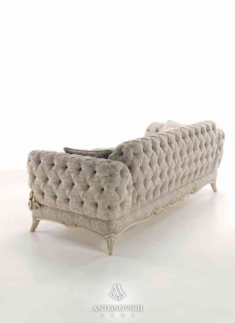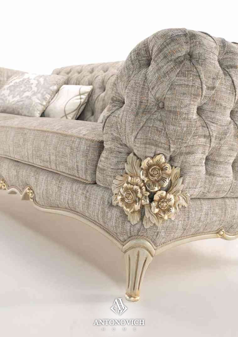Трехместный диван. Декорирован резьбой. Спинка и подлокотники обиты в технике капитоне. Возможны другие варианты отделки и обивки.