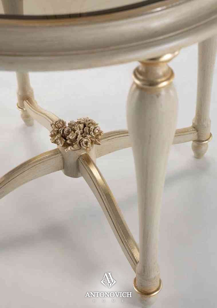Овальный журнальный стол со стеклянной столешницей. Декорирован резьбой. Возможны другие варианты отделки.