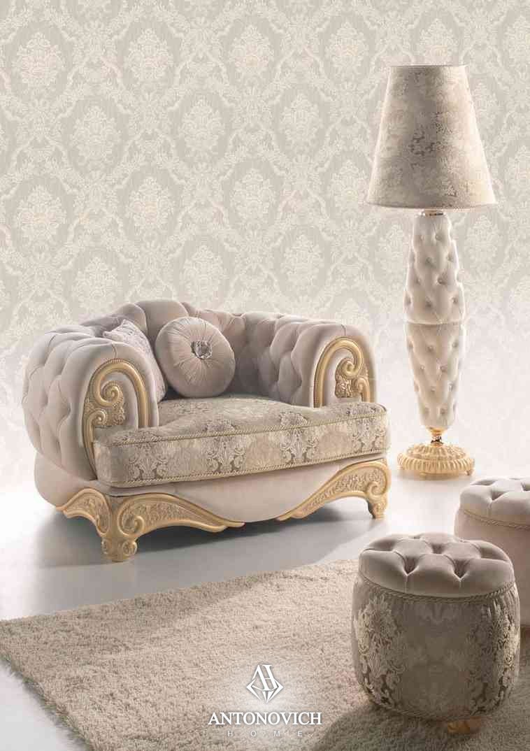 Кресло без подлокотников, с резным основанием. Спинка обита в технике капитоне. Возможны другие варианты отделки и обивки.