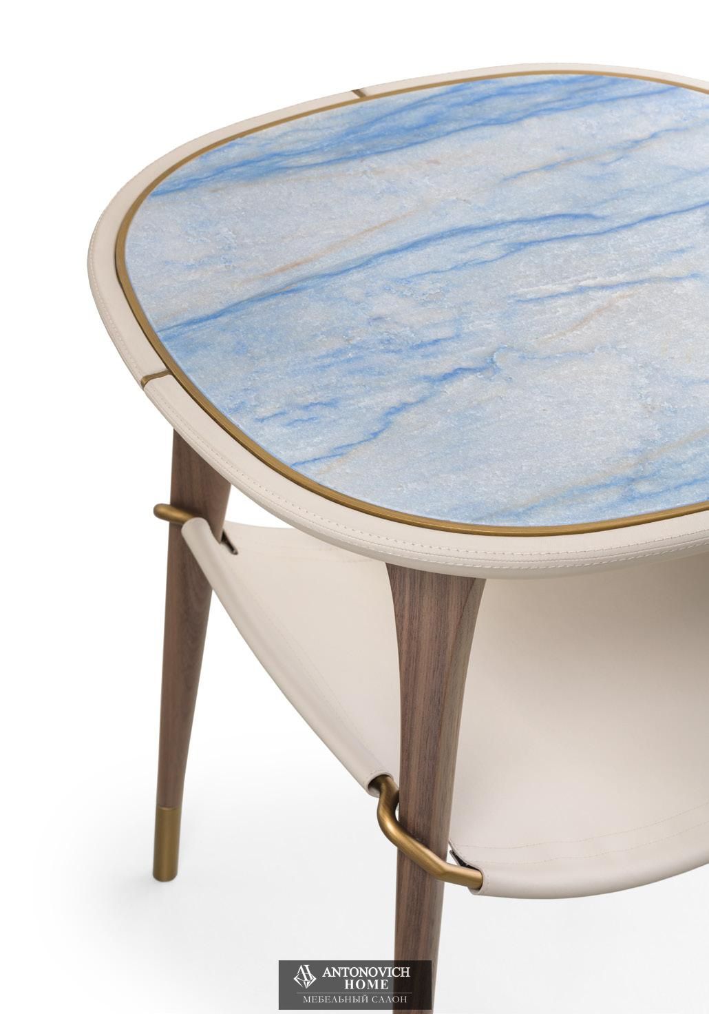 Кофейные столики могут быть с мраморной или деревянной столешницей. Бронзированное стекло, которое в низком столике являются частью столешницы, в высоком столике заменяется удобной полкой из кожи по запросу.