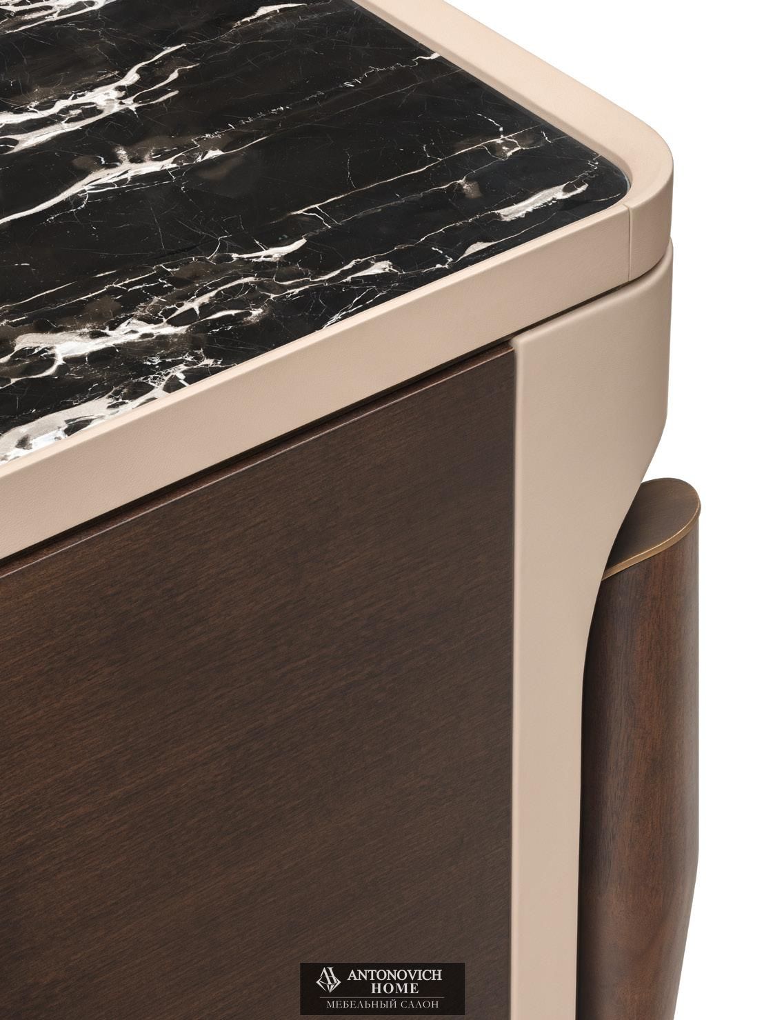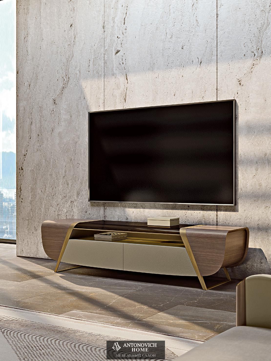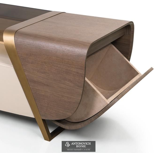ТВ тумба снабжена двумя фронтальными ящиками обшитыми кожей и двумя откидными ящиками в отделке деревом, над открытой нишей расположена поверхность из бронзированного стекла с закруглениями внешних краёв.
