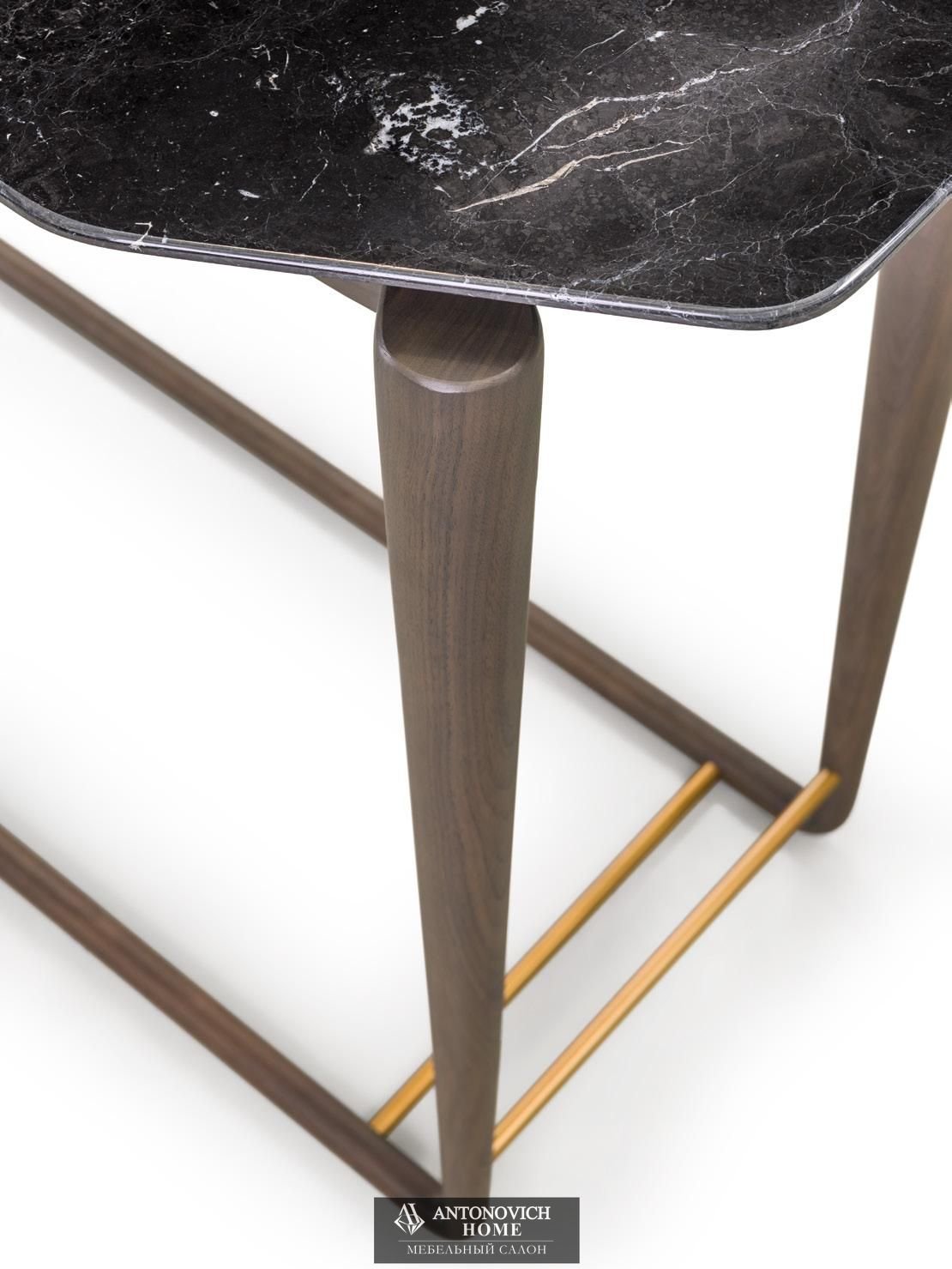Консоль создана из тонких и извилистых линий, с мраморной или деревянной столешницей с притупленными краями, всё вместе придаёт структуре лёгкости и изящности.