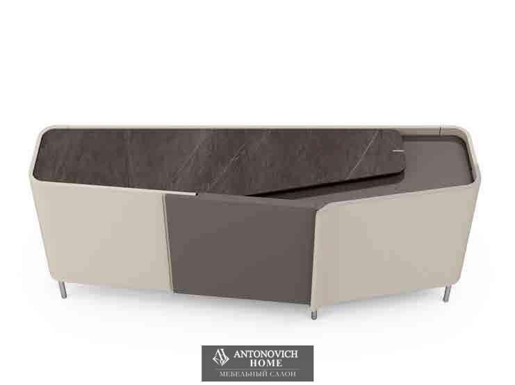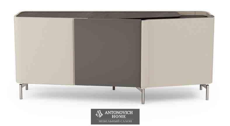 Пересечение слоев и пространств — характерная черта всей коллекции, явно заметная в полках или дверях шкафов. Например, в буфете изогнутые кожаные двери идут внахлест, а а верхняя часть из мрамора словно нависает над деревянной поверхностью.