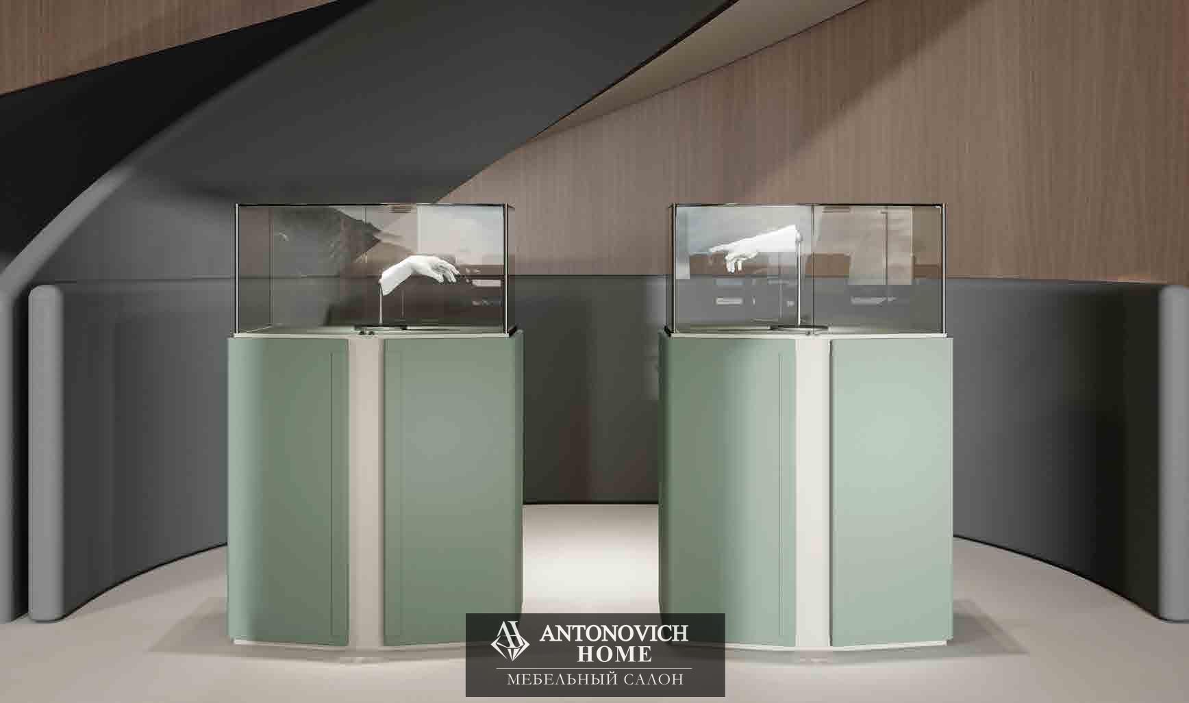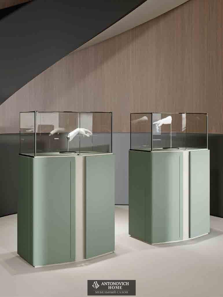 Кожаные дверцы витрины не располагаются впритык друг к другу, на поверхности стоит прозрачный короб, придающий витрине легкую невесомость.