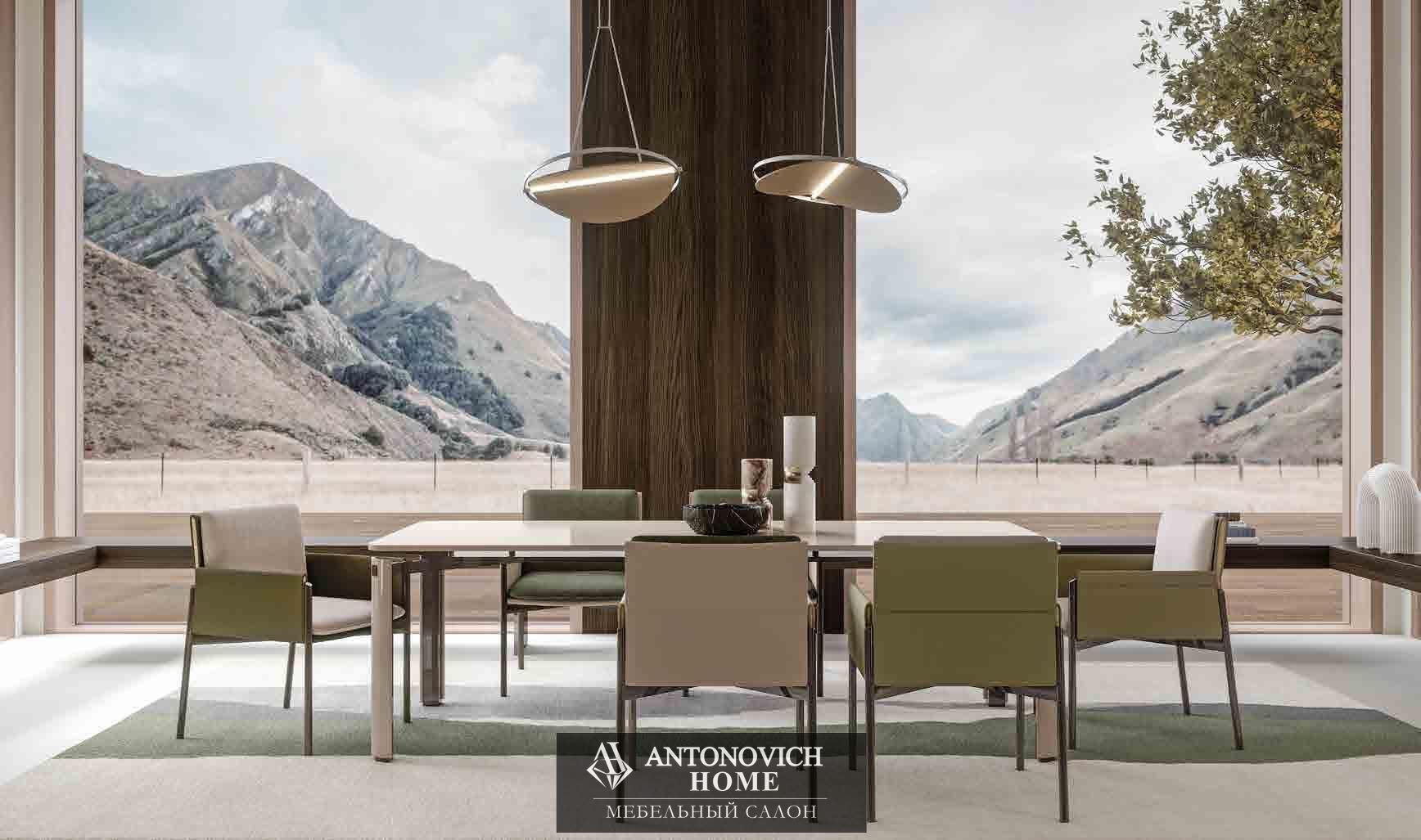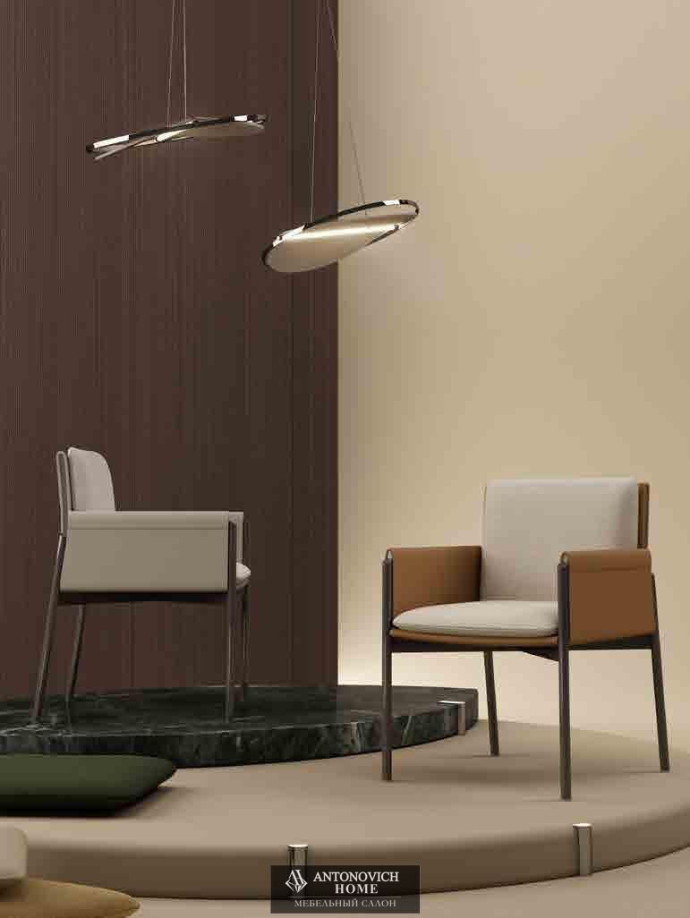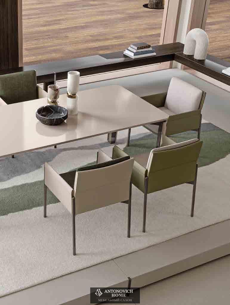 Невесомость, парение — идеальный синтез всей коллекции, который ярко проявляется в тонких ножках стульев и ножках столов лакированного металла.