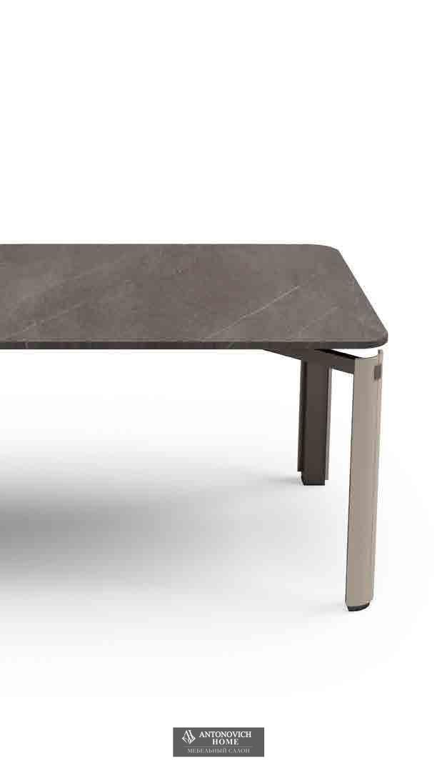 Структура кресел обита кожей или тканью с удобными подушками для спины и сиденья; у стола деревянные лакированные ножки, как и столешница, также доступен в мраморе.