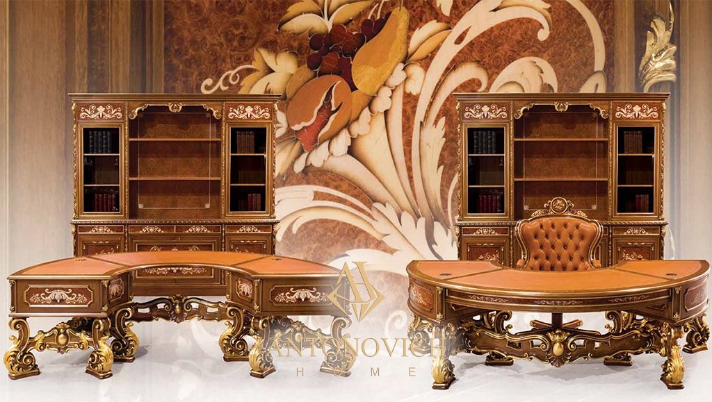 Итальянские кабинеты в классическом стиле Bazzi Interior Decoration очаровывают дорогой отделкой, выполненной вручную, изысканной инкрустацией ценными породами деревьев, украшением из резного декора, покрытым позолотой и изумительной художественной росписью.