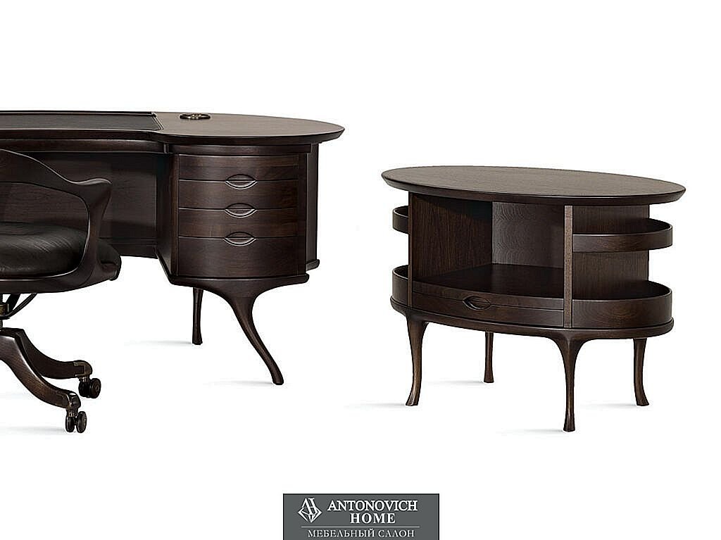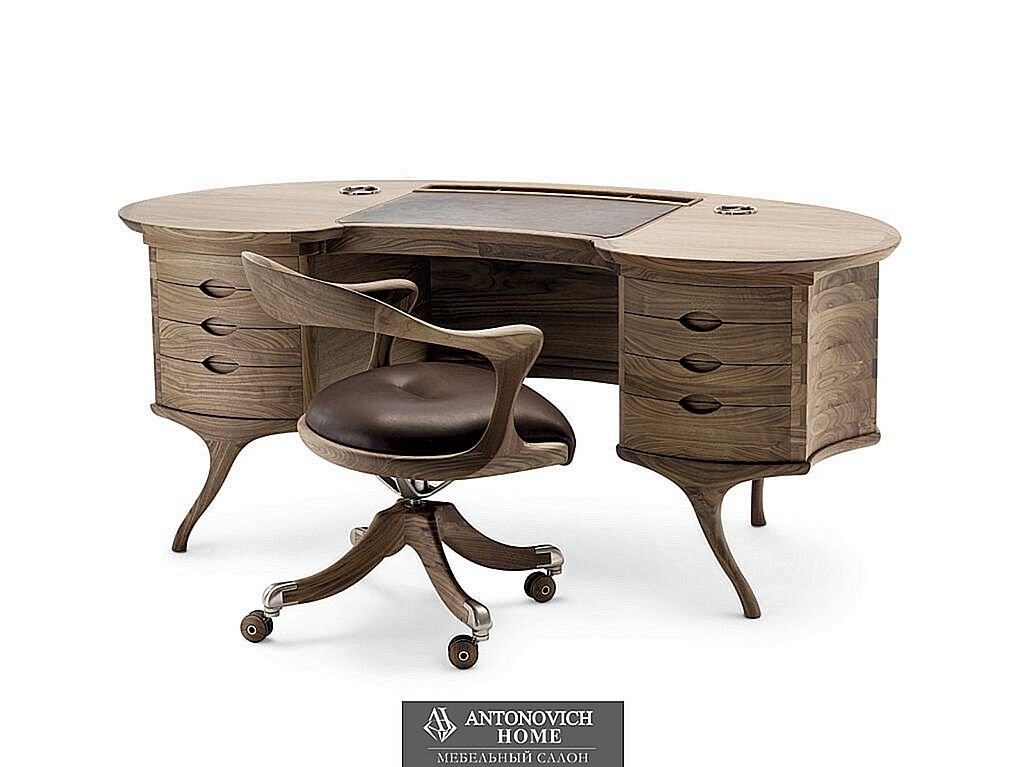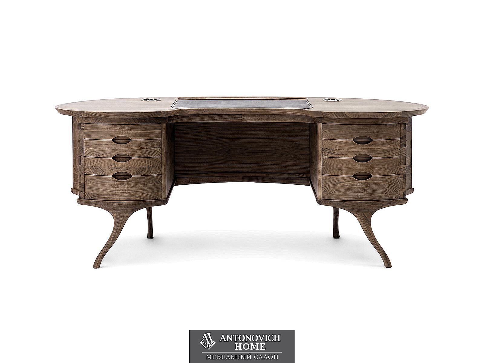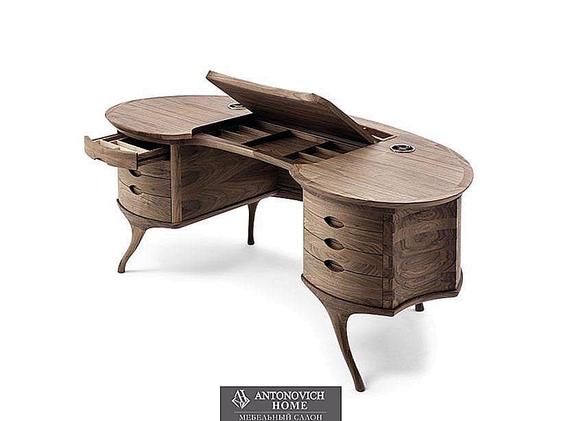 Письменный стол Bean из массива американского ореха, с 8 ящиками, первые два ящика с внутренними перегородками из массива клена, откидная верхняя часть с кожаной подушечкой, держатель для ручек и фурнитура из сатинированной никелевой латуни и центральный деревянный поднос. Приставной столик Little Bean из массива американского ореха, четыре боковых подноса, центральный ящик и выдвижная полка.