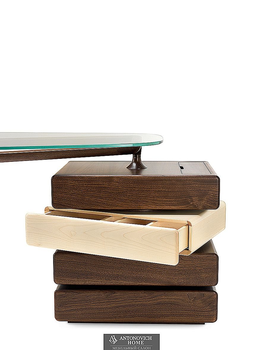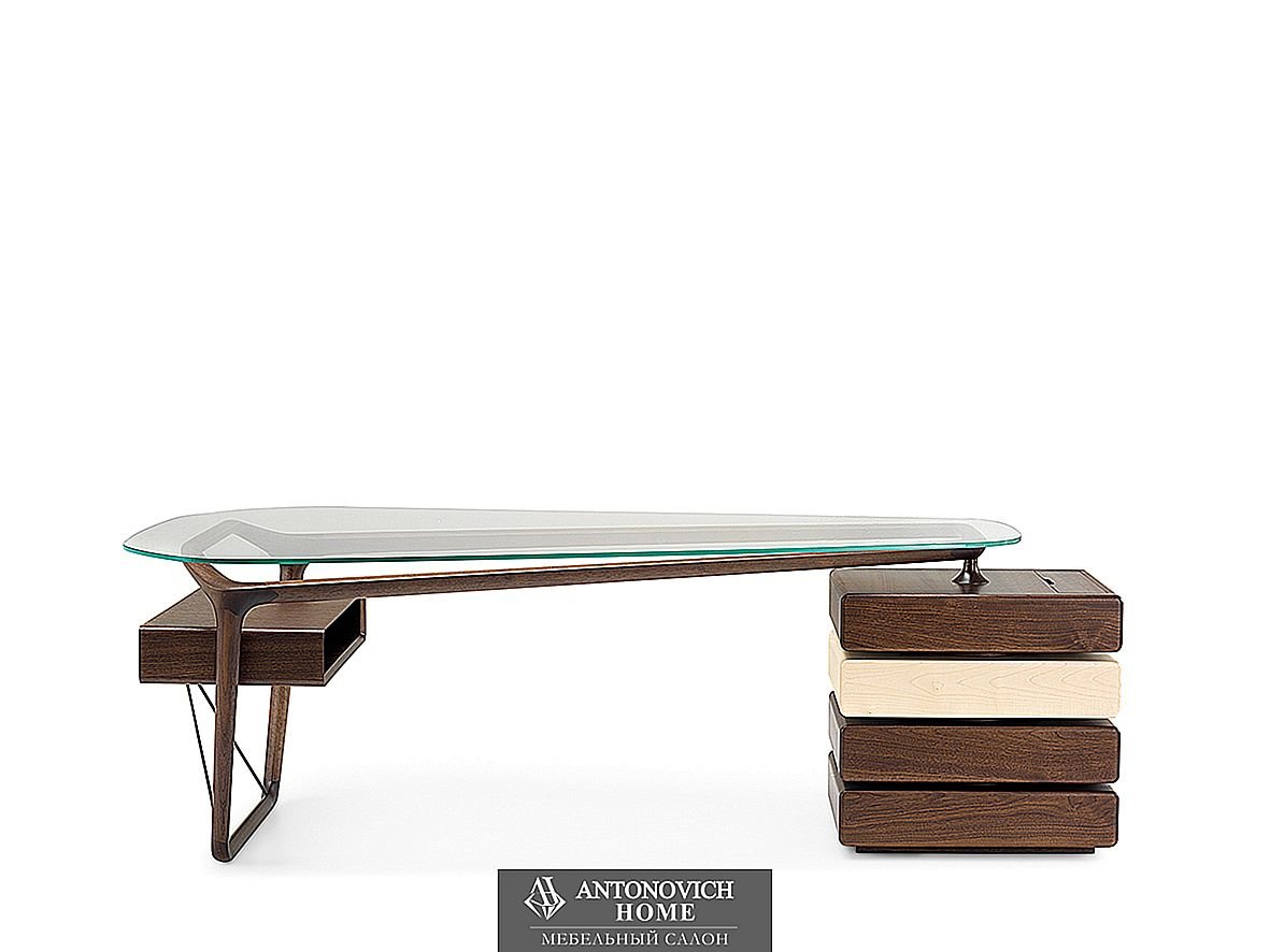 Письменный стол Omaggio фабрики Ceccotti Collezioni из массива американского ореха, ящик из фанеры (3 ящика из американского ореха / 1 поворотный ящик из клена), поднос из американского ореха, столешница из закаленного стекла толщиной 12 мм, сверхпрозрачная или дымчатая.