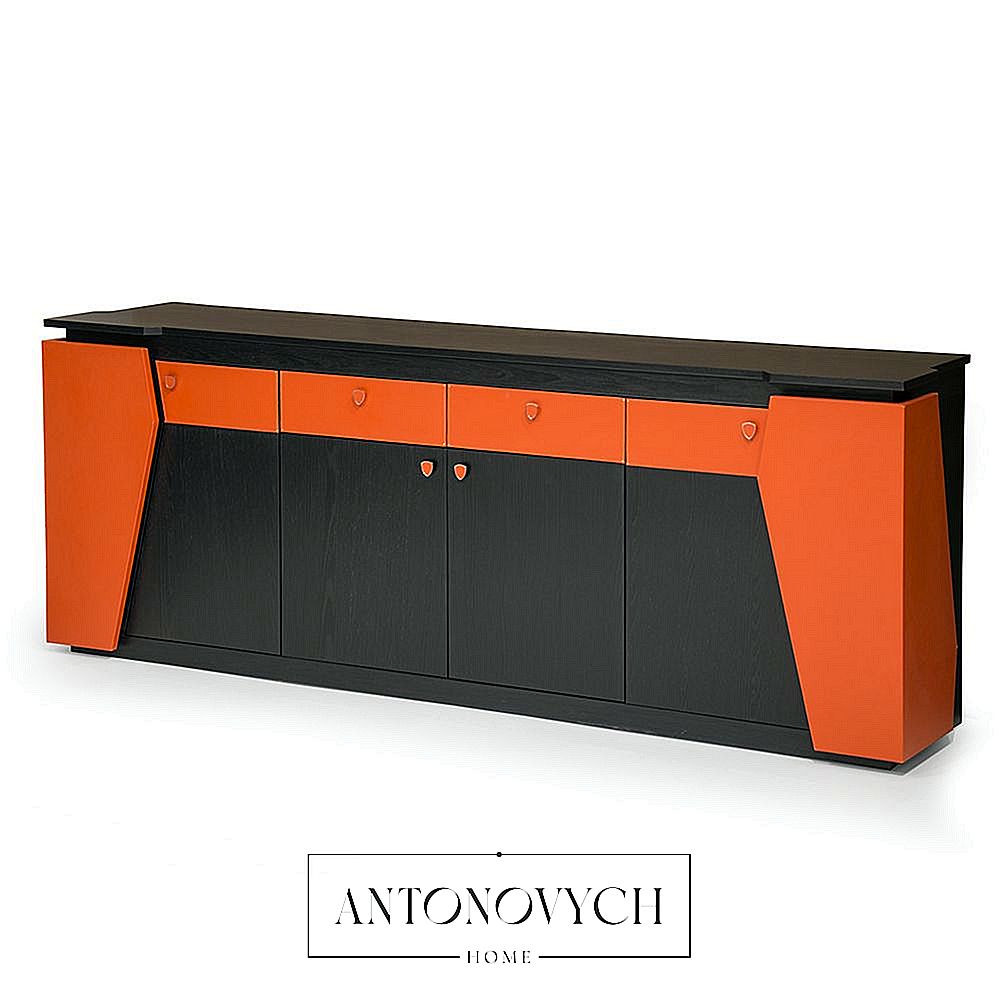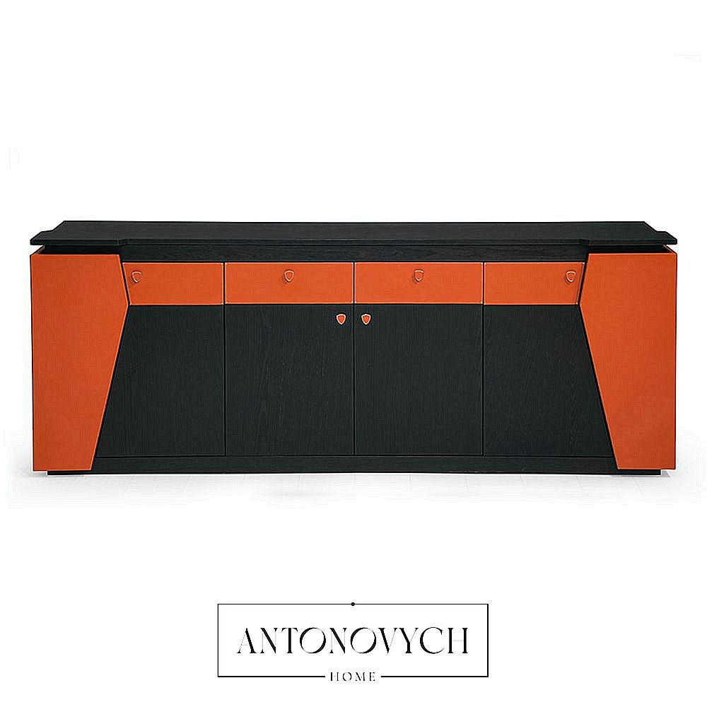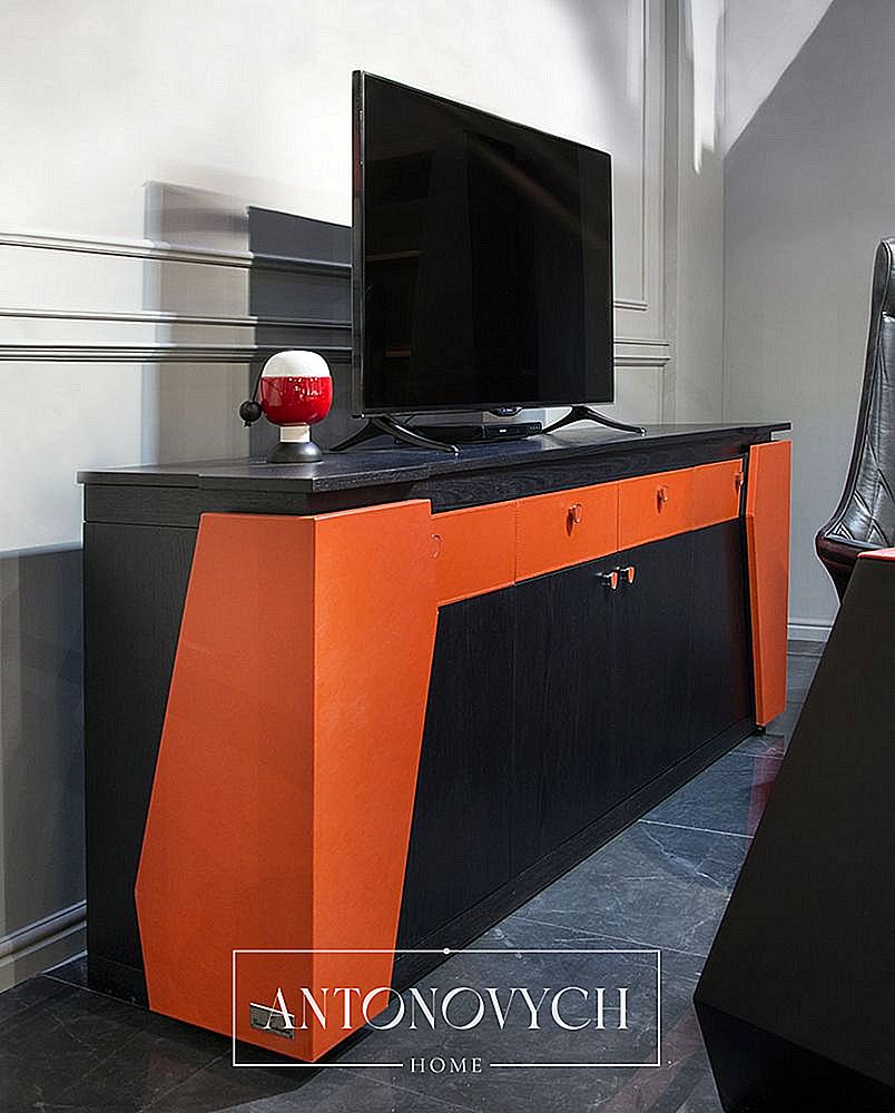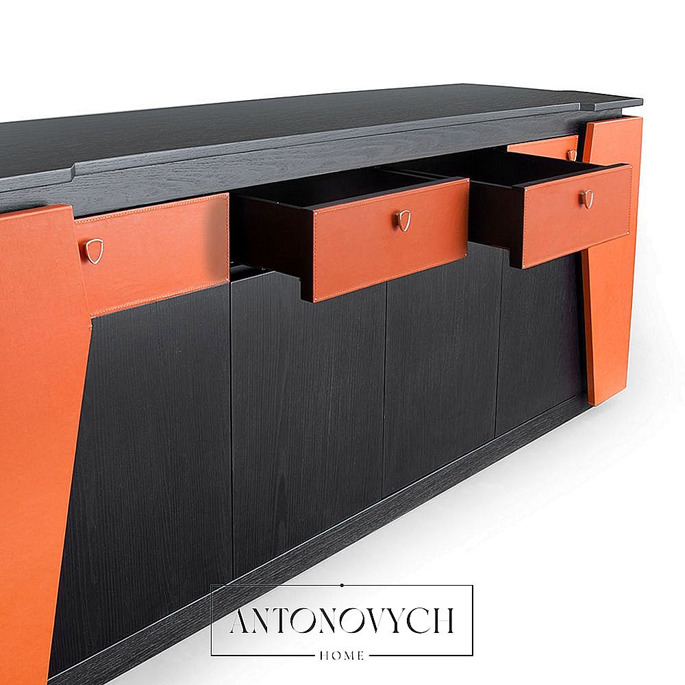 Тумба — топ из шпона Planked цв. черные открытые поры, столешница, ящики и боковины из кожи Daino col. Оранжевый, центральные ящики с ручкой TL цв. никель со вставками из кожи, фасады дверей и основание из шпона Planked цв. черный с открытыми порами, внутренняя часть и нижняя часть окрашены в черный матовый цвет.