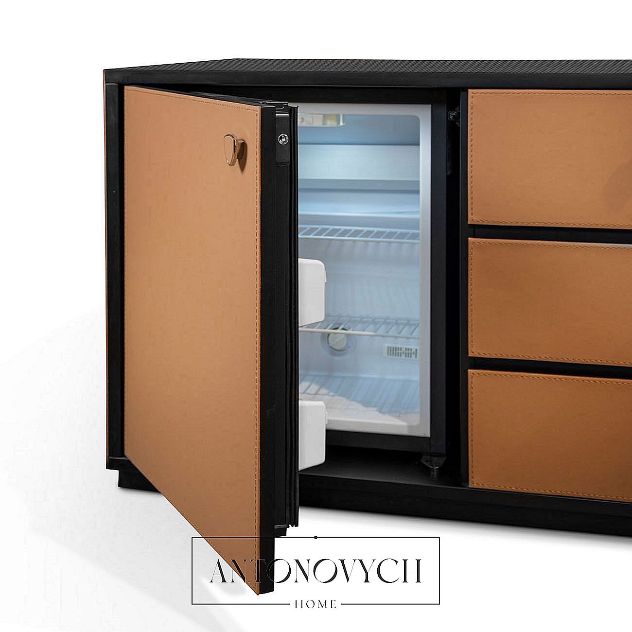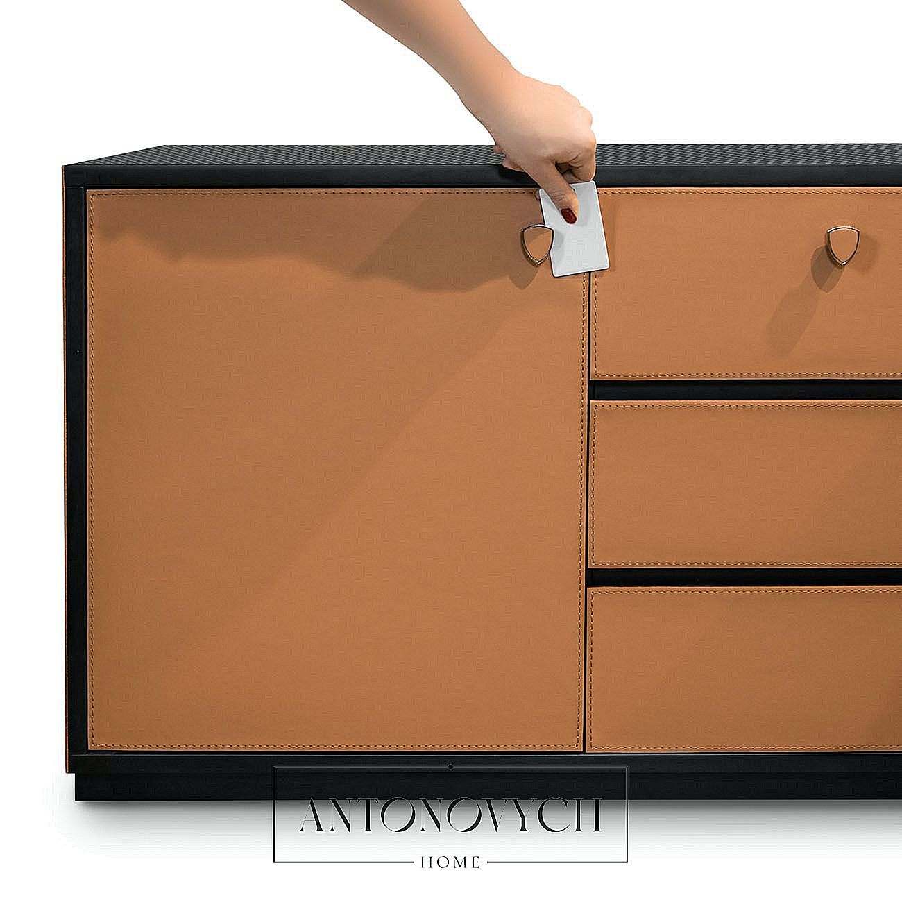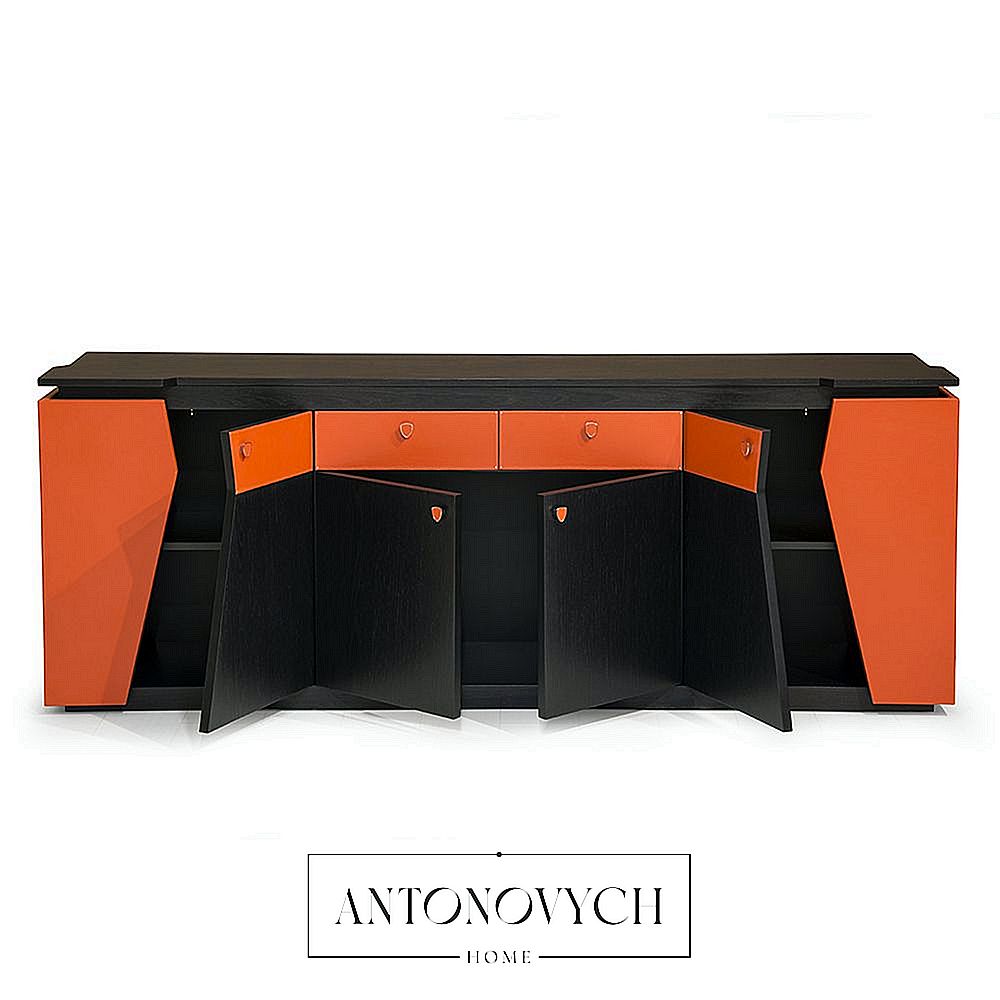 Тумба — топ из шпона Planked цв. черные открытые поры, столешница, ящики и боковины из кожи Daino col. Оранжевый, центральные ящики с ручкой TL цв. никель со вставками из кожи, фасады дверей и основание из шпона Planked цв. черный с открытыми порами, внутренняя часть и нижняя часть окрашены в черный матовый цвет.
