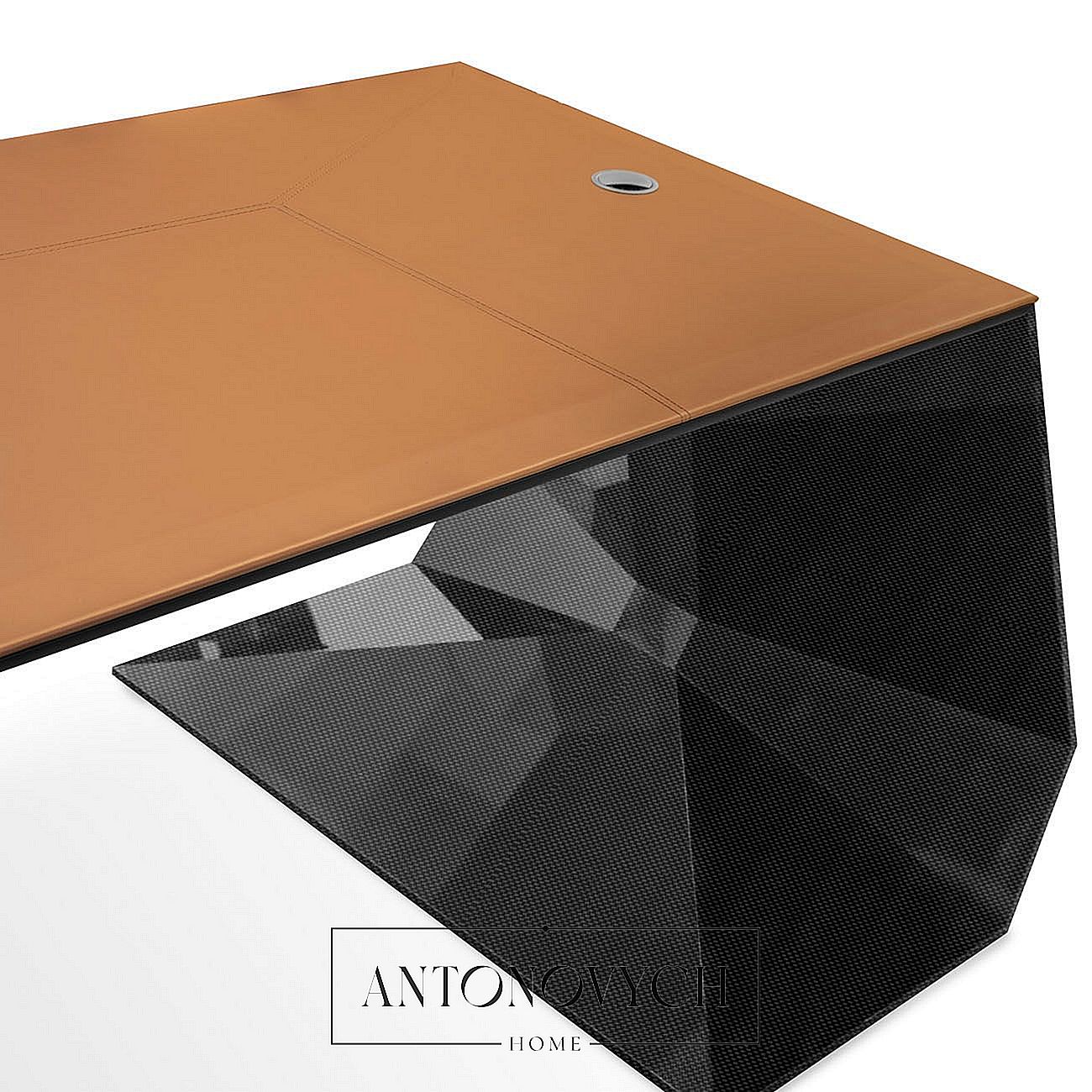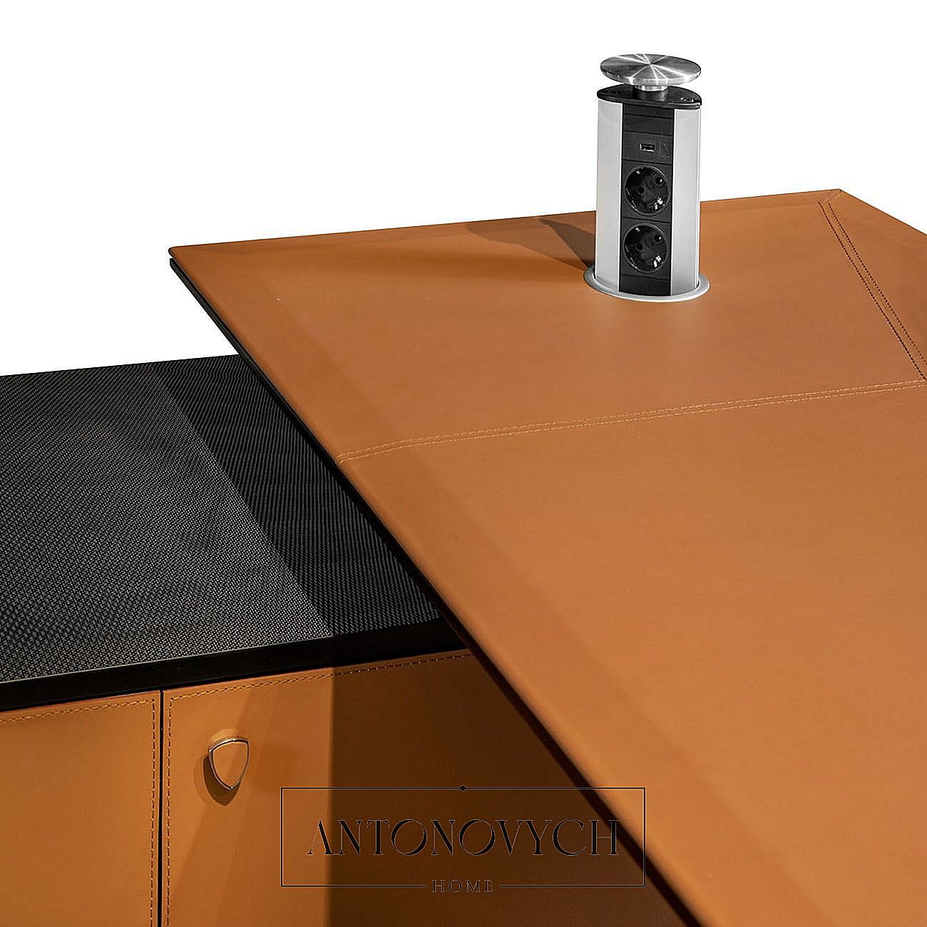 Письменный стол GT Supercarbon — пример кожевенного искусства. Cuoio col.Kestral Tan с прострочкой тон в тон, верхняя часть боковины, основание и ножка стола из углеродного волокна, ручки из никелевого щита с кожаными вставками, металлический логотип TL col.nickel и красный щиток. Опции: мультиштекер, настольный кабельный порт, сейф, скрытое отверстие холодильника со значком.