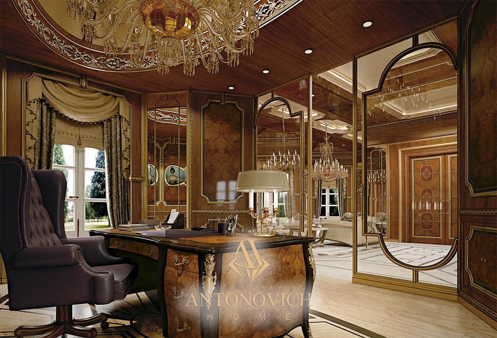 В дневной части виллы Pregno создала просторную гостиную с обеденной зоной, где применяются светлые тона, отбеленный кап и детали из патинированного сусального золота, пышный джентльменский клуб, в котором главную роль несомненно играют стеновые панели, созданные специально для этой коллекции, целиком облицовывающие стены и потолок интерьера.