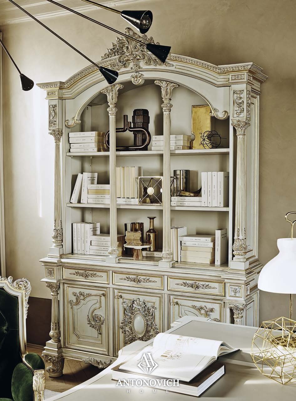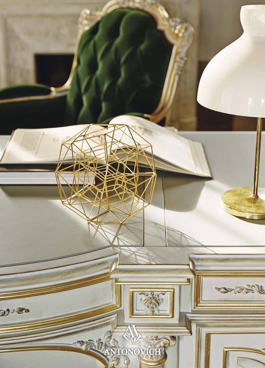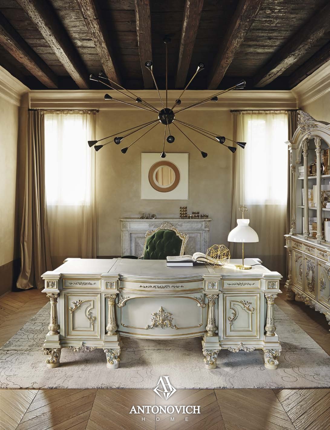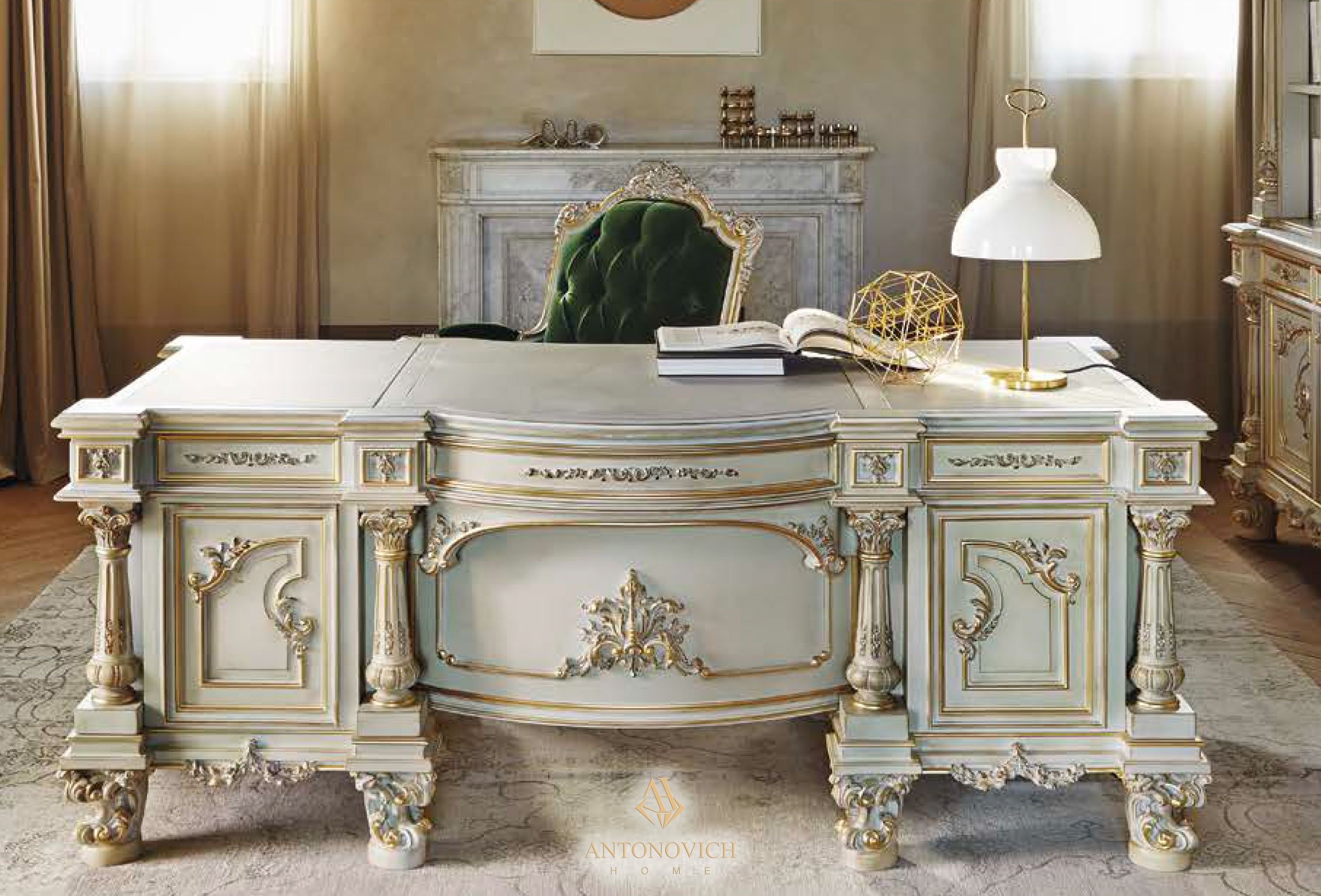 Комплект мебели для кабинета в классическом стиле от фабрики SILIK — это коллекция Giove. Книжный шкаф открытый с 3 ящиками и 3 створками, и с внутренними деревянными полками. Письменный стол с 8 боковыми ящиками и 1 центральным ящиком, поверхность стола отделана кожей. Директорское вращающееся и регулируемое кресло, спинка с простёжкой «капитонне».