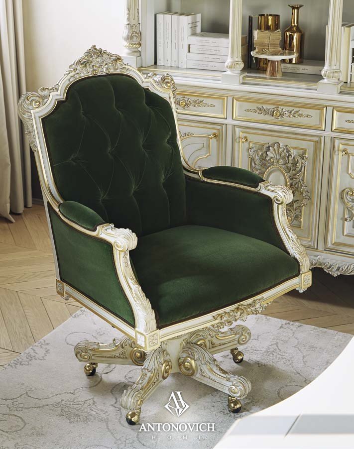 Комплект мебели для кабинета в классическом стиле от фабрики SILIK. Книжный шкаф открытый с 3 ящиками и 3 створками, и с внутренними деревянными полками. Письменный стол с 8 боковыми ящиками и 1 центральным ящиком, поверхность стола отделана кожей. Директорское вращающееся и регулируемое кресло, спинка с простёжкой «капитонне».