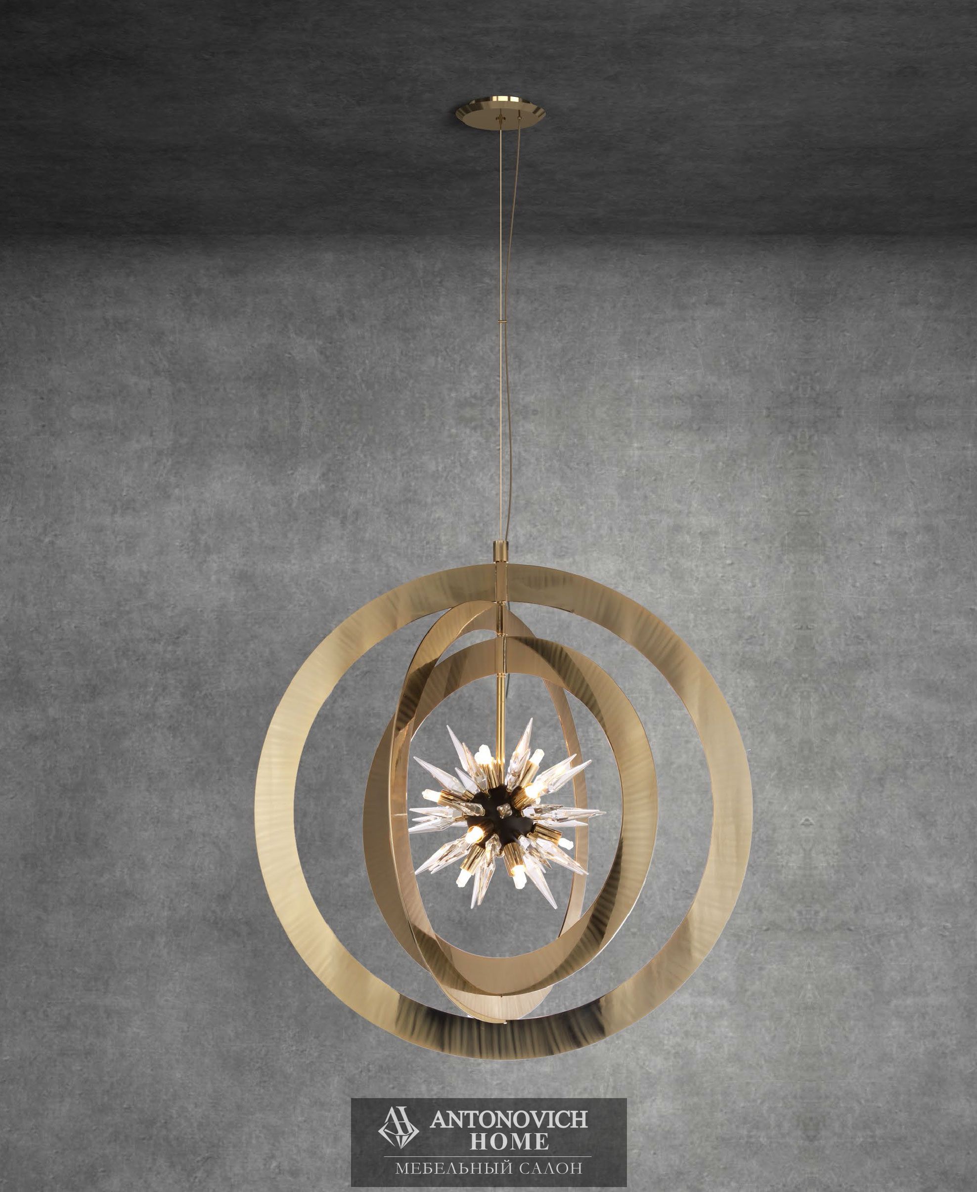 Свет, исходящий из сферы латуни в центре рисунка, переливается сквозь выступающие кристаллы Сваровски, окруженные вращающимися открытыми медными кругами.