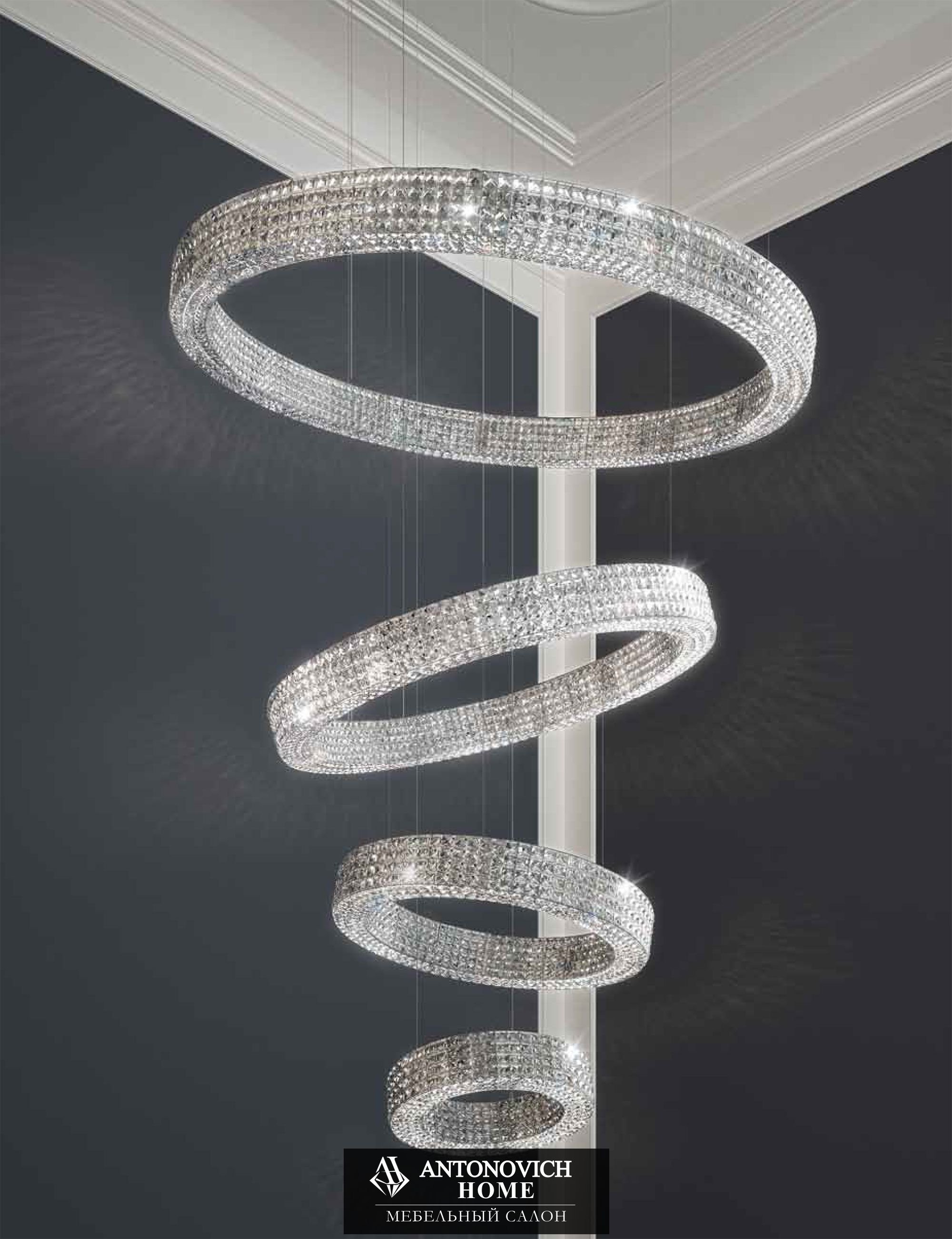 Композиция из люстр. Структура люстр выполнена из стальных обручей, декорированных хрустальными кристаллами.