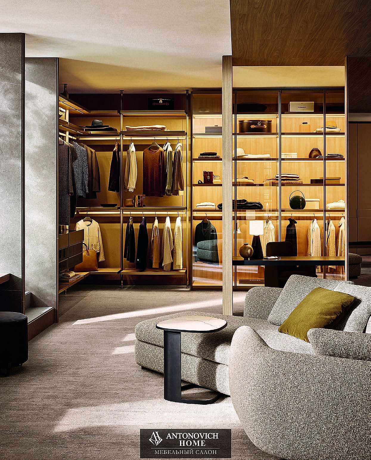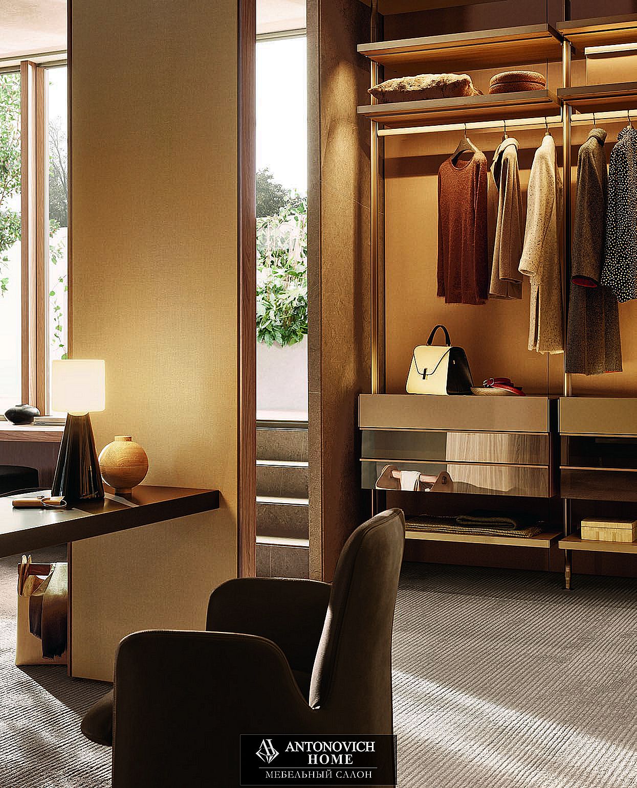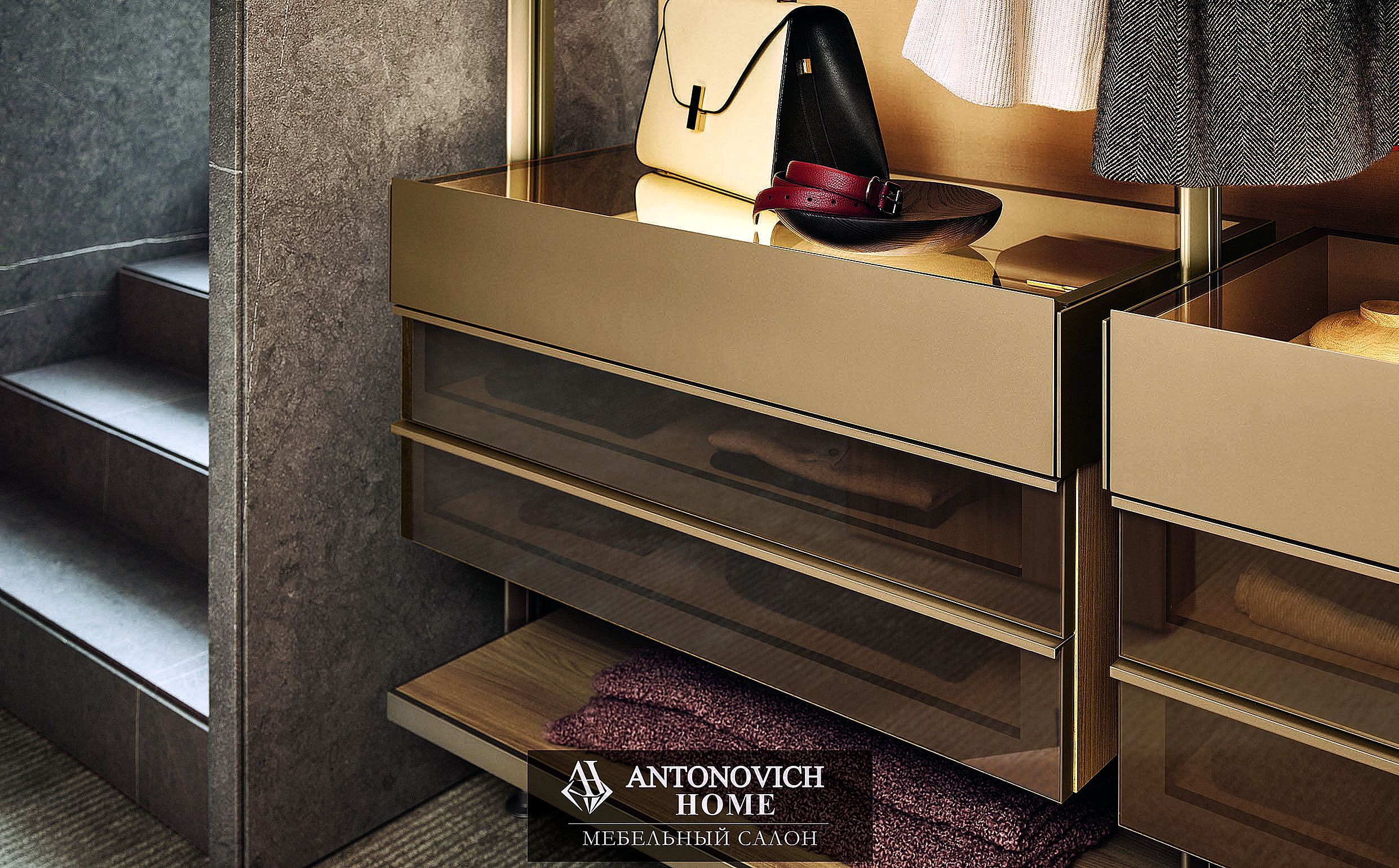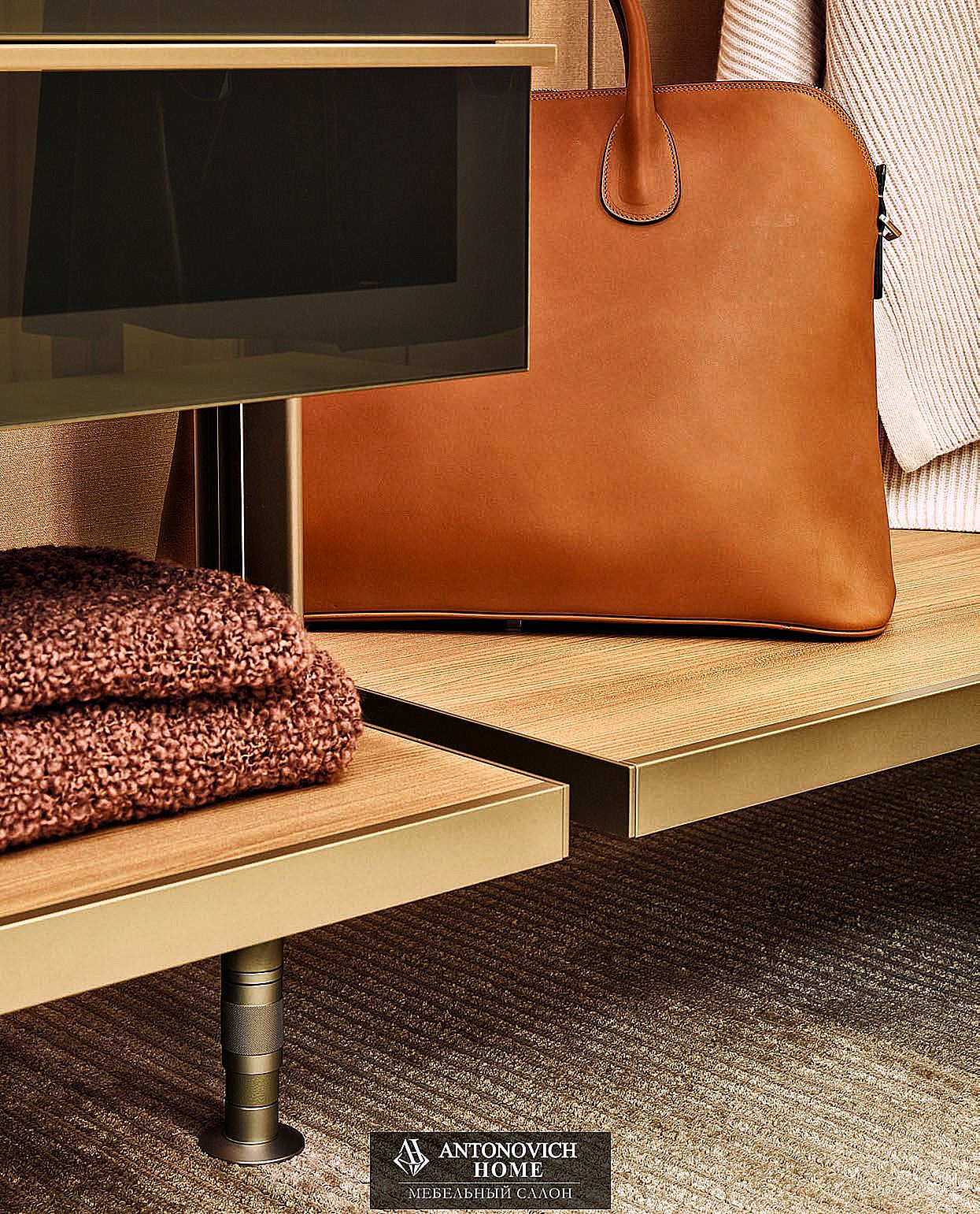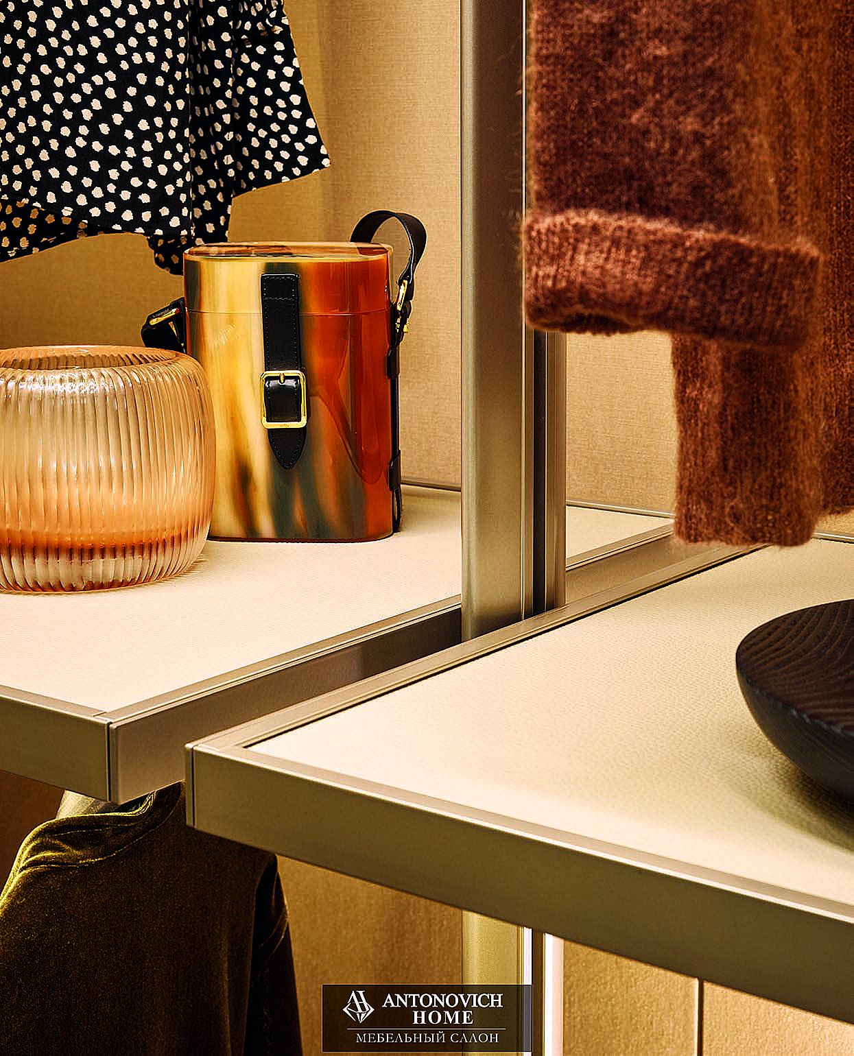 Полки, комоды и различные функциональные аксессуары крепятся к алюминиевым стойкам в отделке цвета Шампань или Ардезия.
