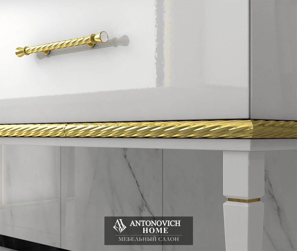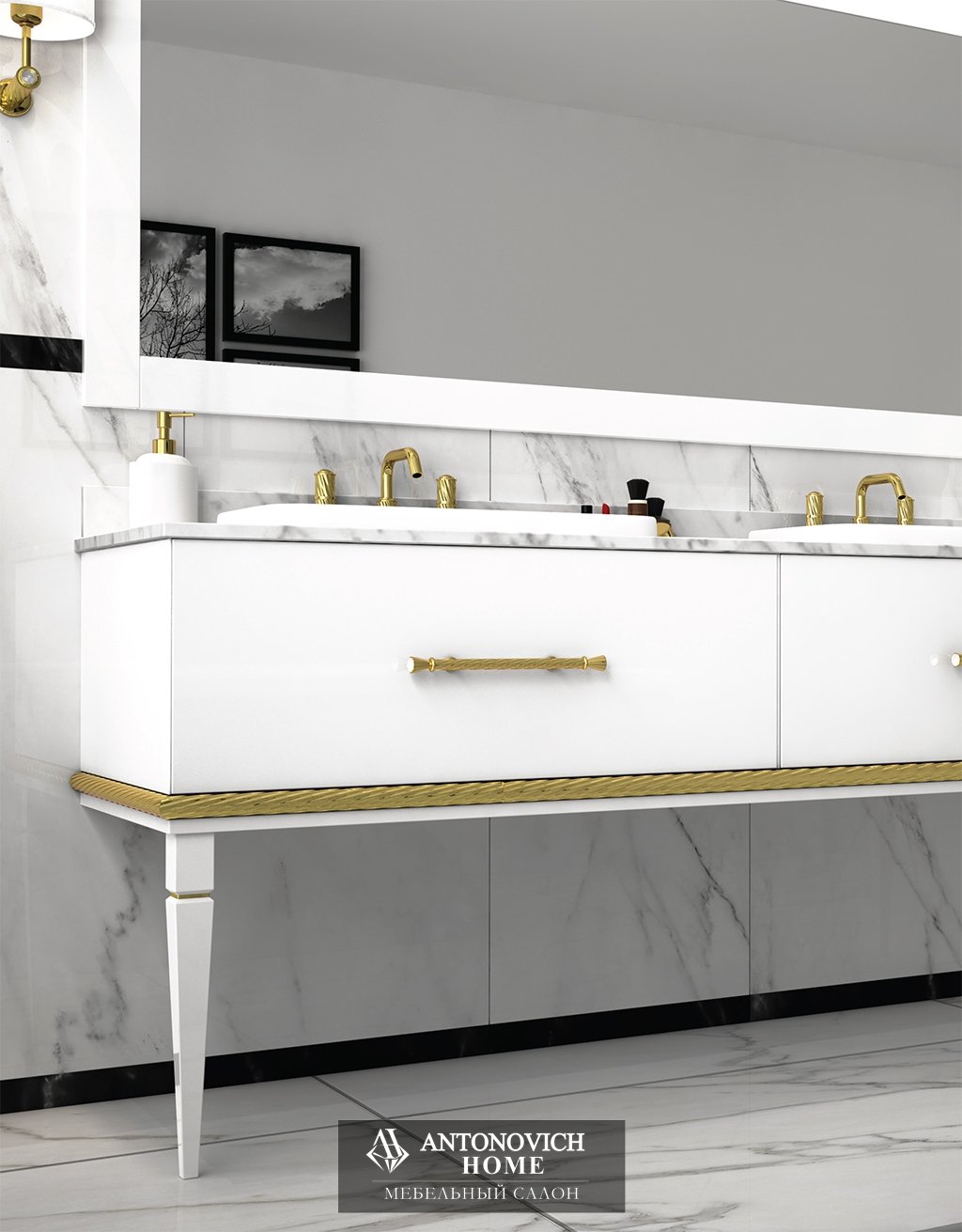 Тумба в отделке Brillante. Латунный ремешок, сечение Torciglione, цвет золото. Cтолешница и раковина в мраморе Bianco Carrara | Д 183 Ш 56 В 83 |