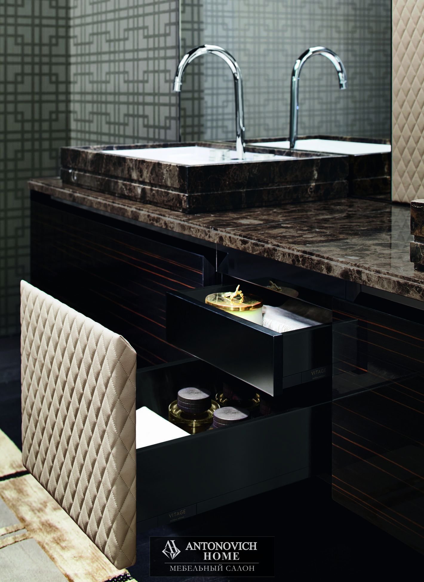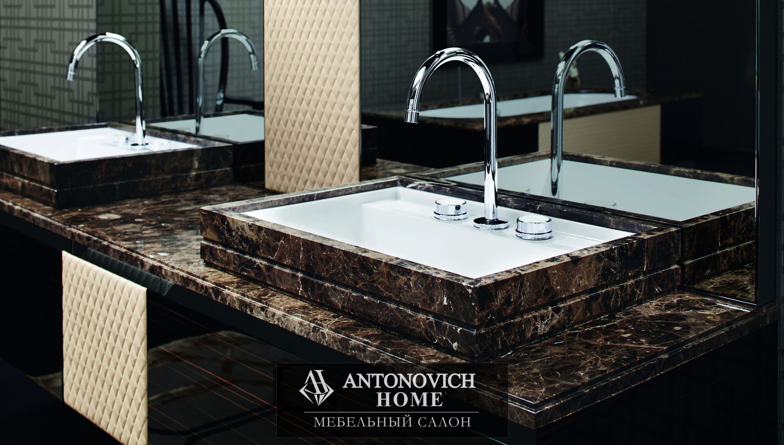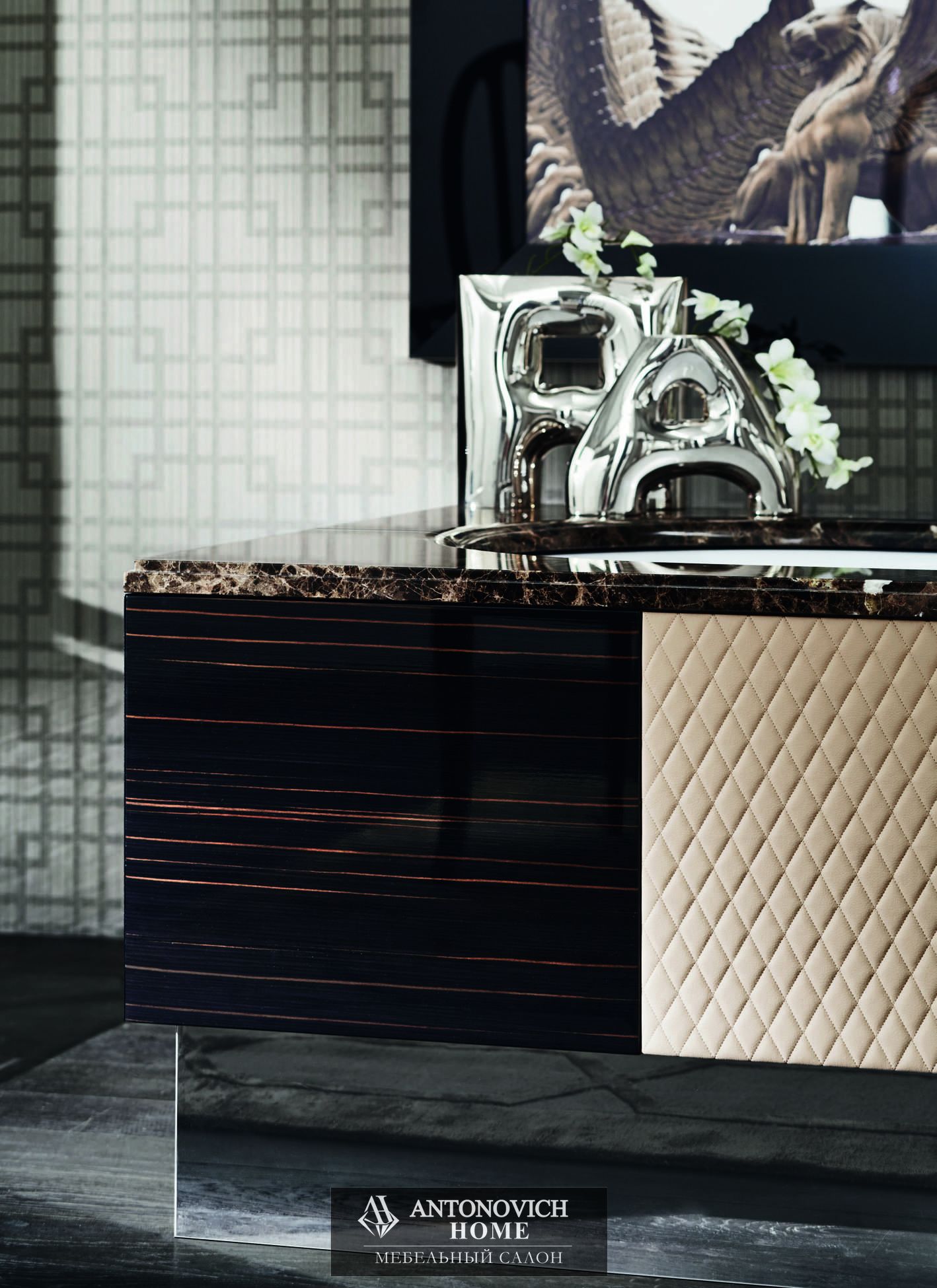 Основание для раковины с верхним углублением, боковины и створки из глянцевого эбенового дерева, передняя центральная часть из стеганой экологической кожи crema. Блестящая мраморная столешница emperador, раковины Boston 65 минеральный мрамор, снаружи блестящий мрамор emperador.