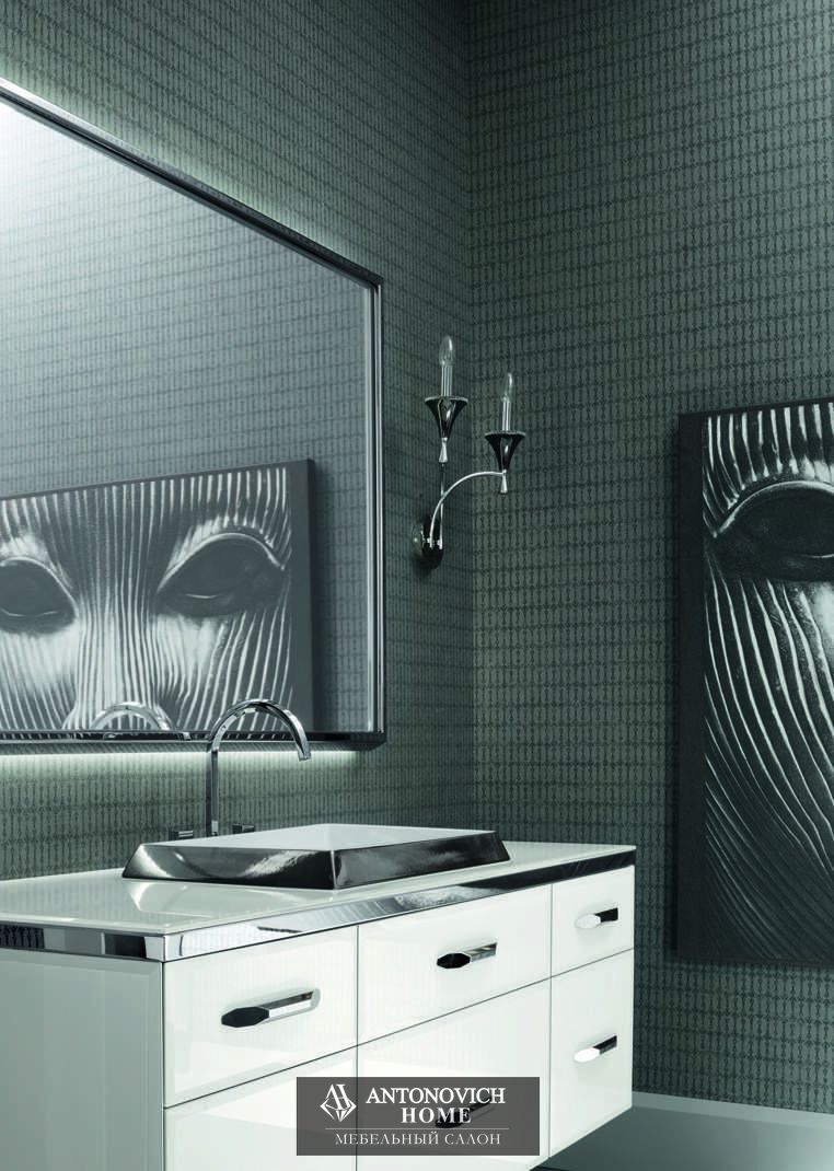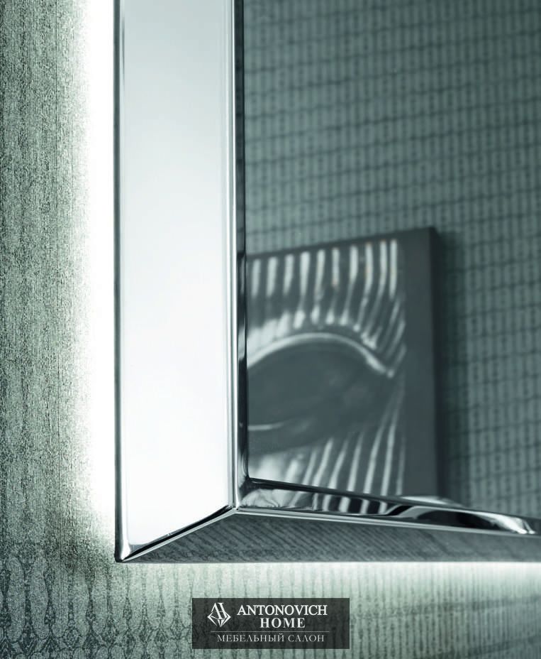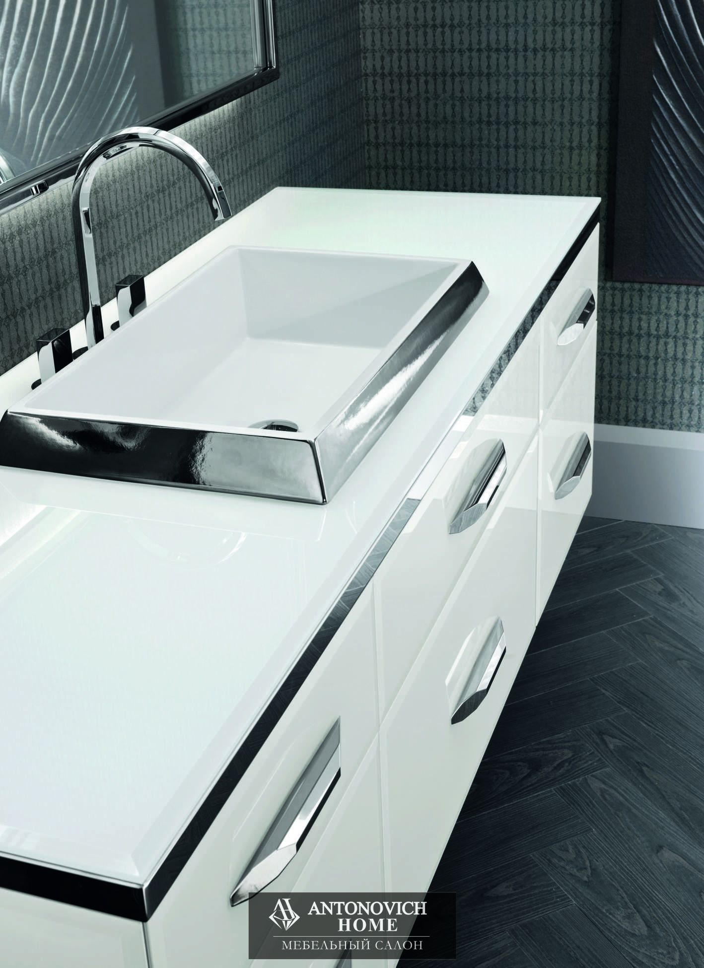 Основание раковины стекло extrachiaro bianco со скошенным краем, профиль столешницы из полираванной стали. Раковина Diamond керамика, наружная часть платина. Зеркало Diamond с диодной подсветкой, рама из блестящей стали.