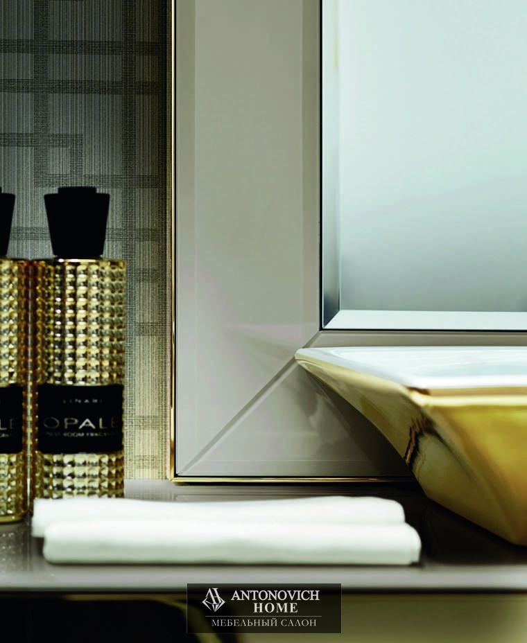 Основание раковины из стекла extrachiaro mandorla со скошенным краем. Профиль столешницы и ножки с золотой отделкой. Раковина Nizza из керамики, наружная часть золото. Зеркало Ginevra, рама из стекла extrachiaro mandorla, профиль с золотой отделкой.