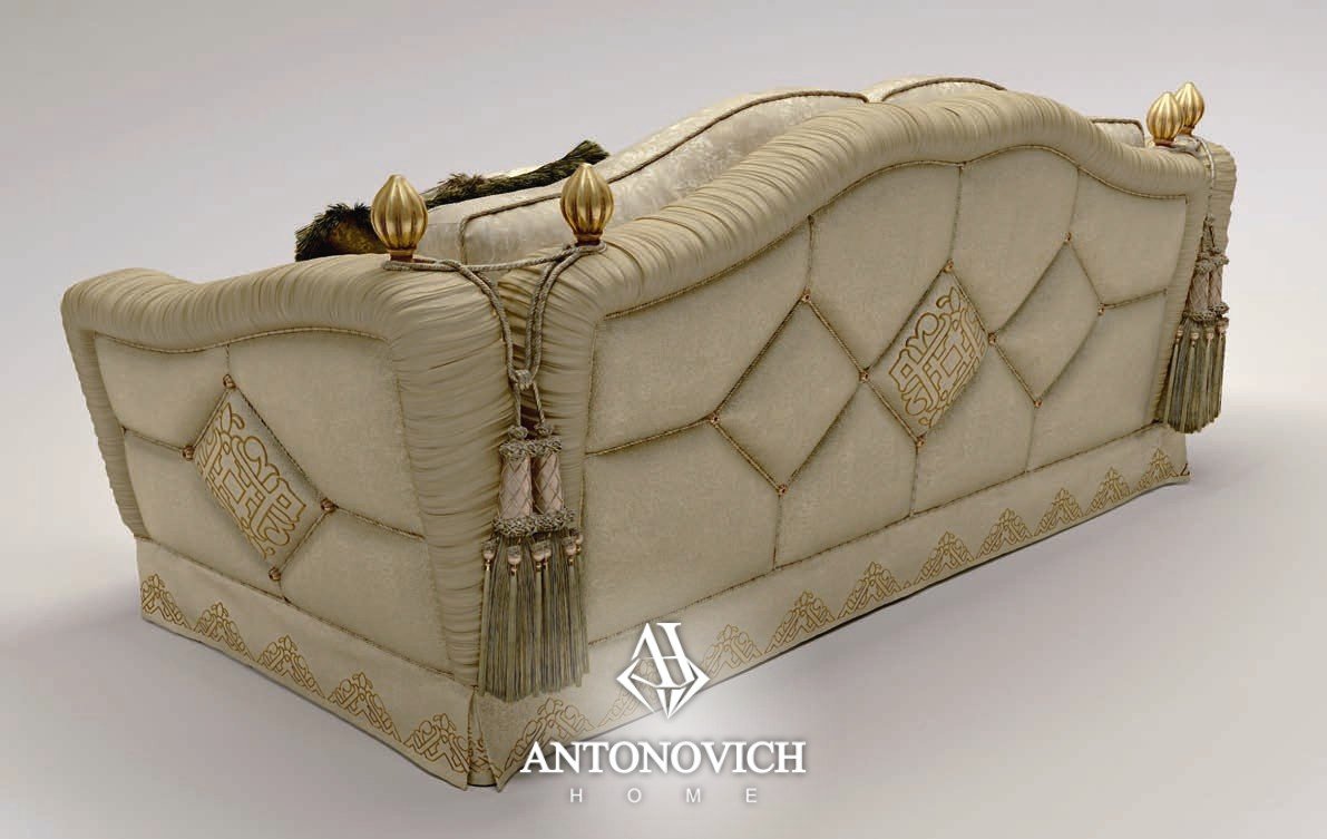Роскошный диван Achille компании BRUNO ZAMPA имеет фигурные спинку и подлокотники, на латунные султанчики наброшены великолепные кисти.