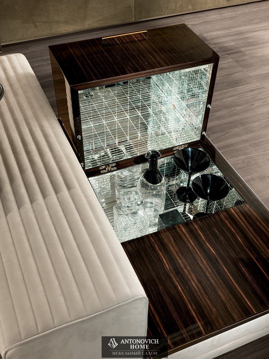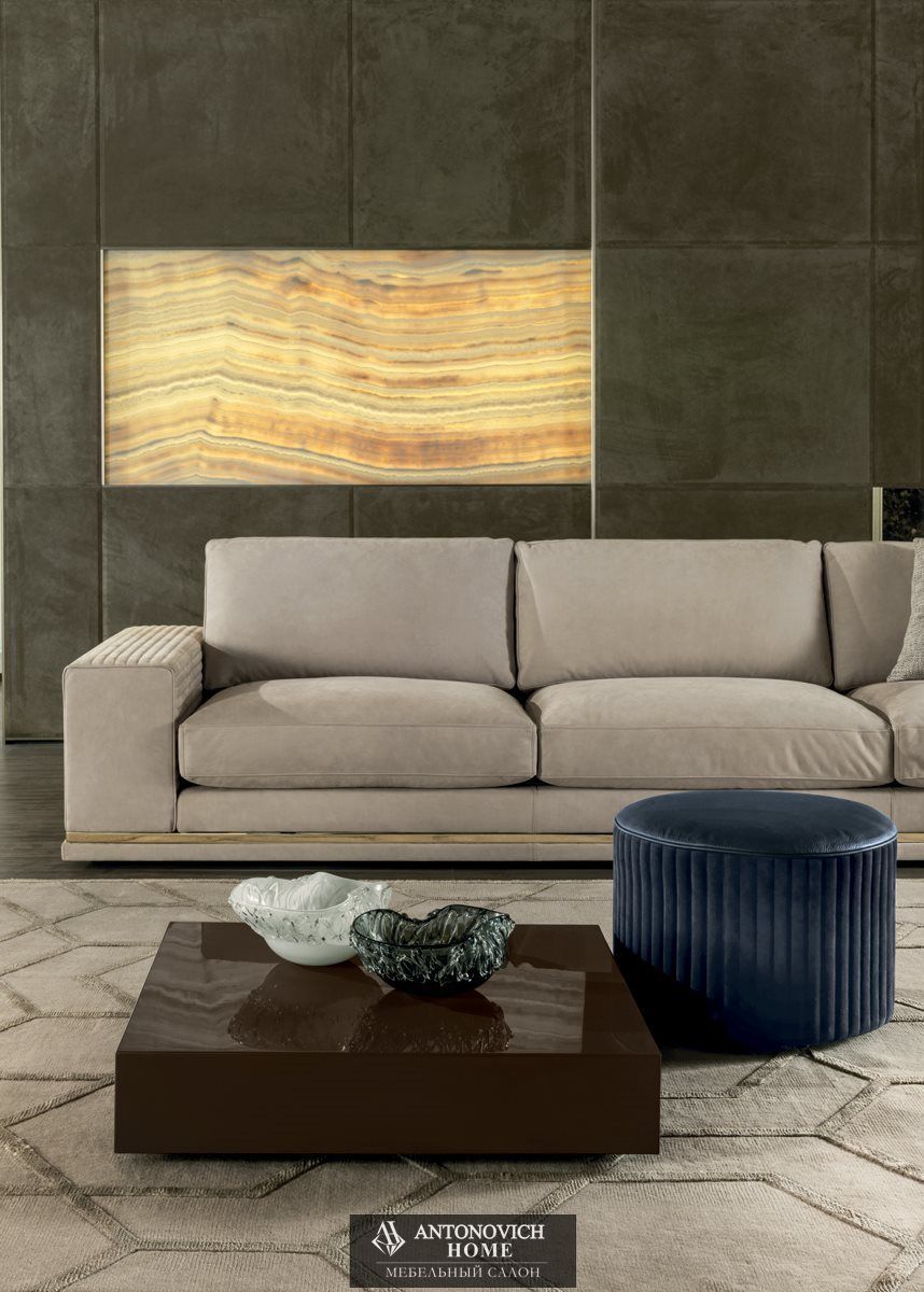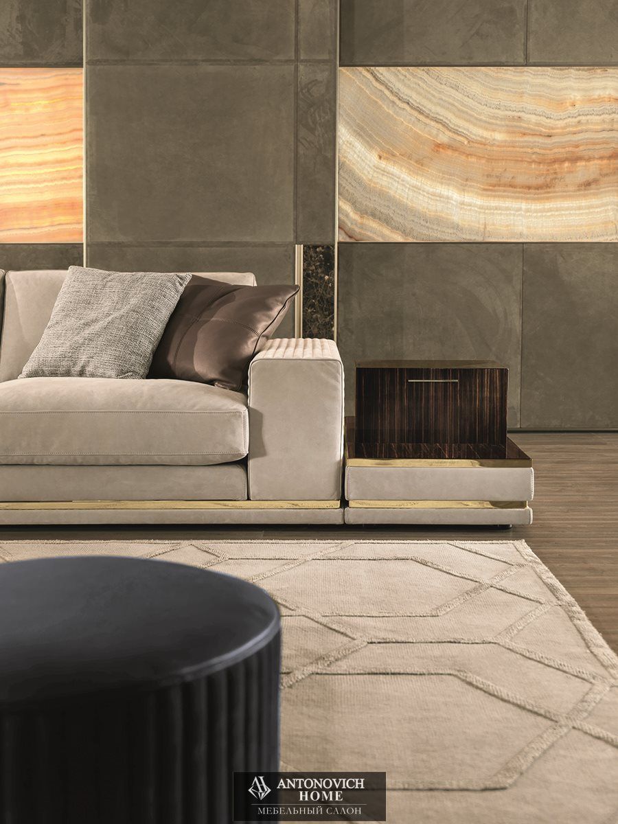 Для коллекции Cohen итальянской фабрики характерны два типа подлокотников: высокий мягкий с простежкой в виде полос или низкий металлический с отделкой по каталогу, со вспомогательными поверхностями из оникса с диммируемой подсветкой или мрамора.