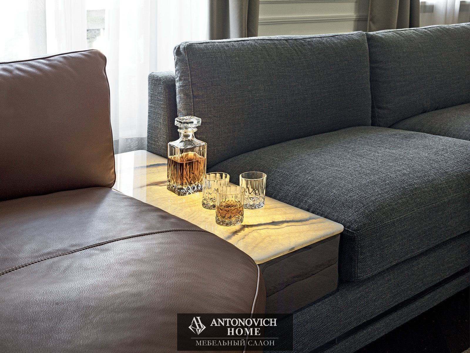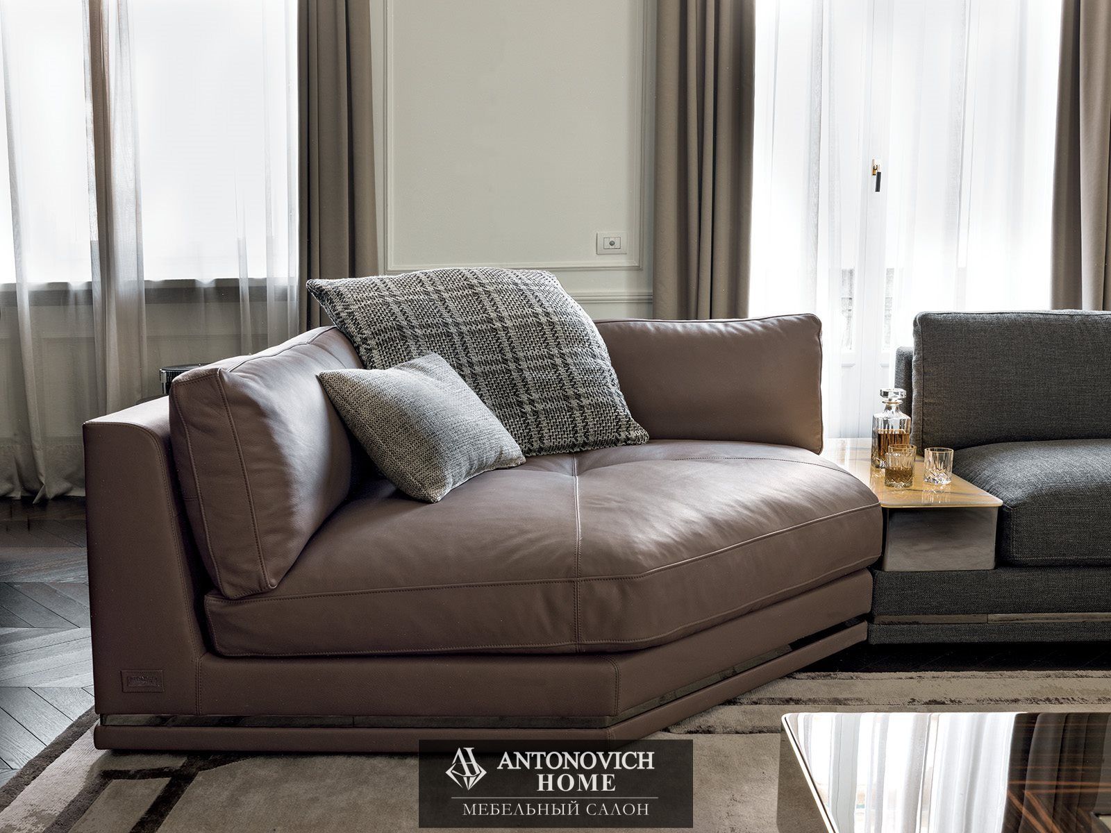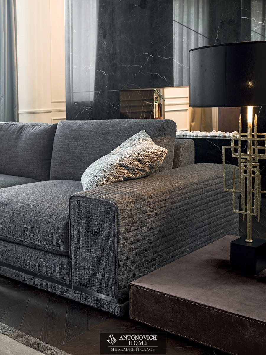 Для коллекции Cohen итальянской фабрики характерны два типа подлокотников: высокий мягкий с простежкой в виде полос или низкий металлический с отделкой по каталогу, со вспомогательными поверхностями из оникса с диммируемой подсветкой или мрамора.