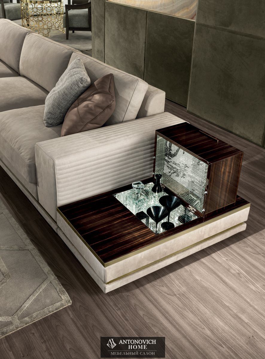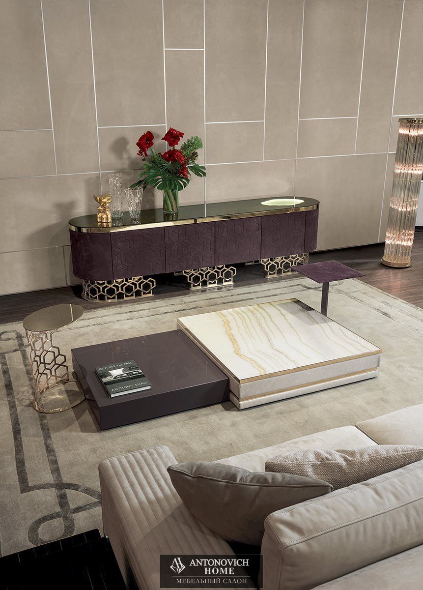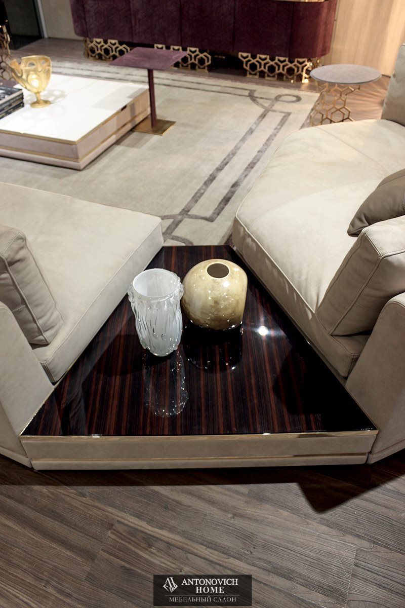Коллекцию дополняют различные типы столиков: с обивкой из кожи или ткани, с дереянными столешницами из мрамора или зеркала в цветовой гамме по каталогу, с возможностью установки удобной барной ниши или ниши для предметов с откидным механизмом открытия для прямоугольного элемента.
