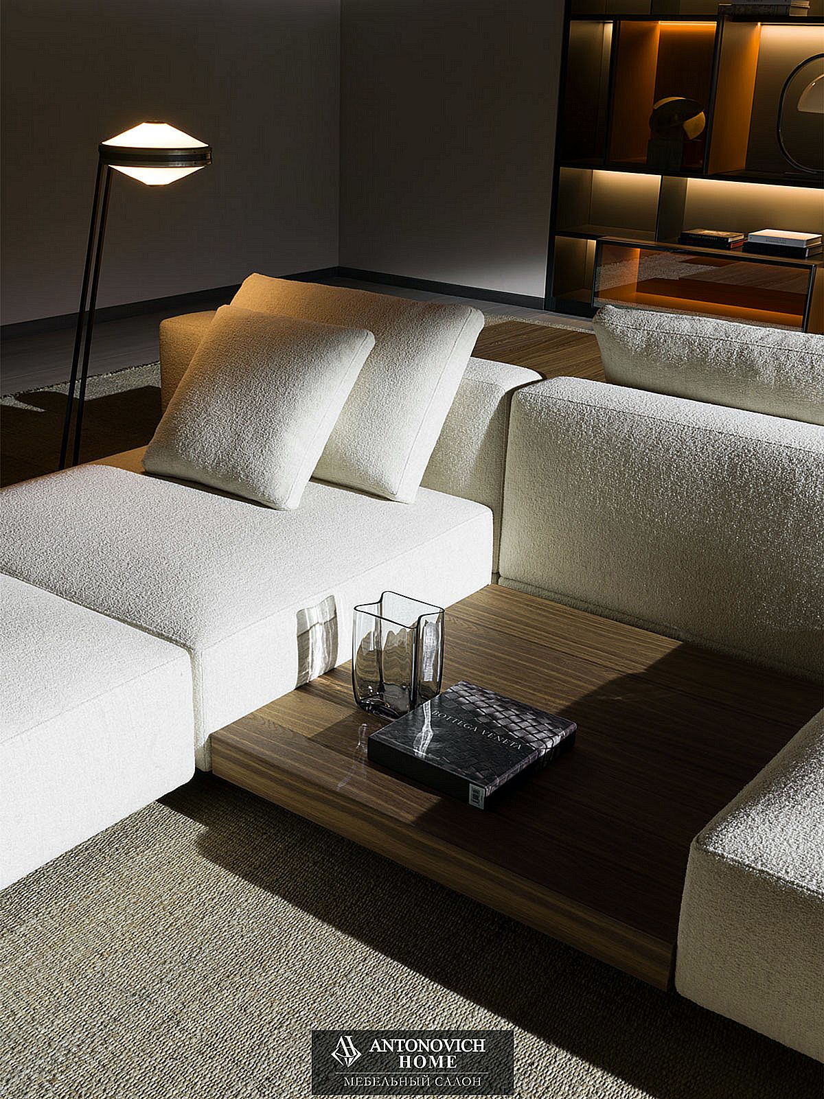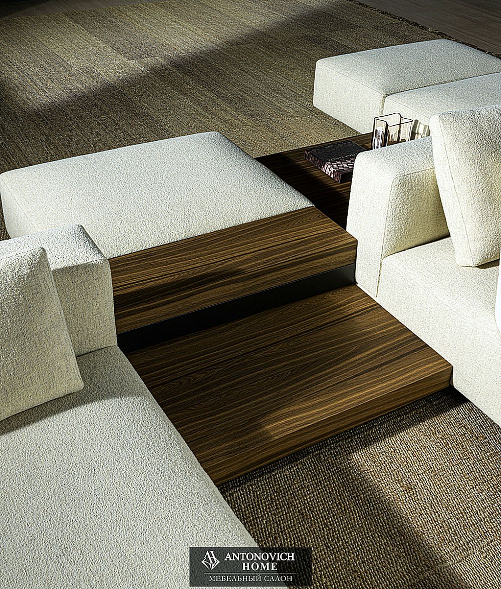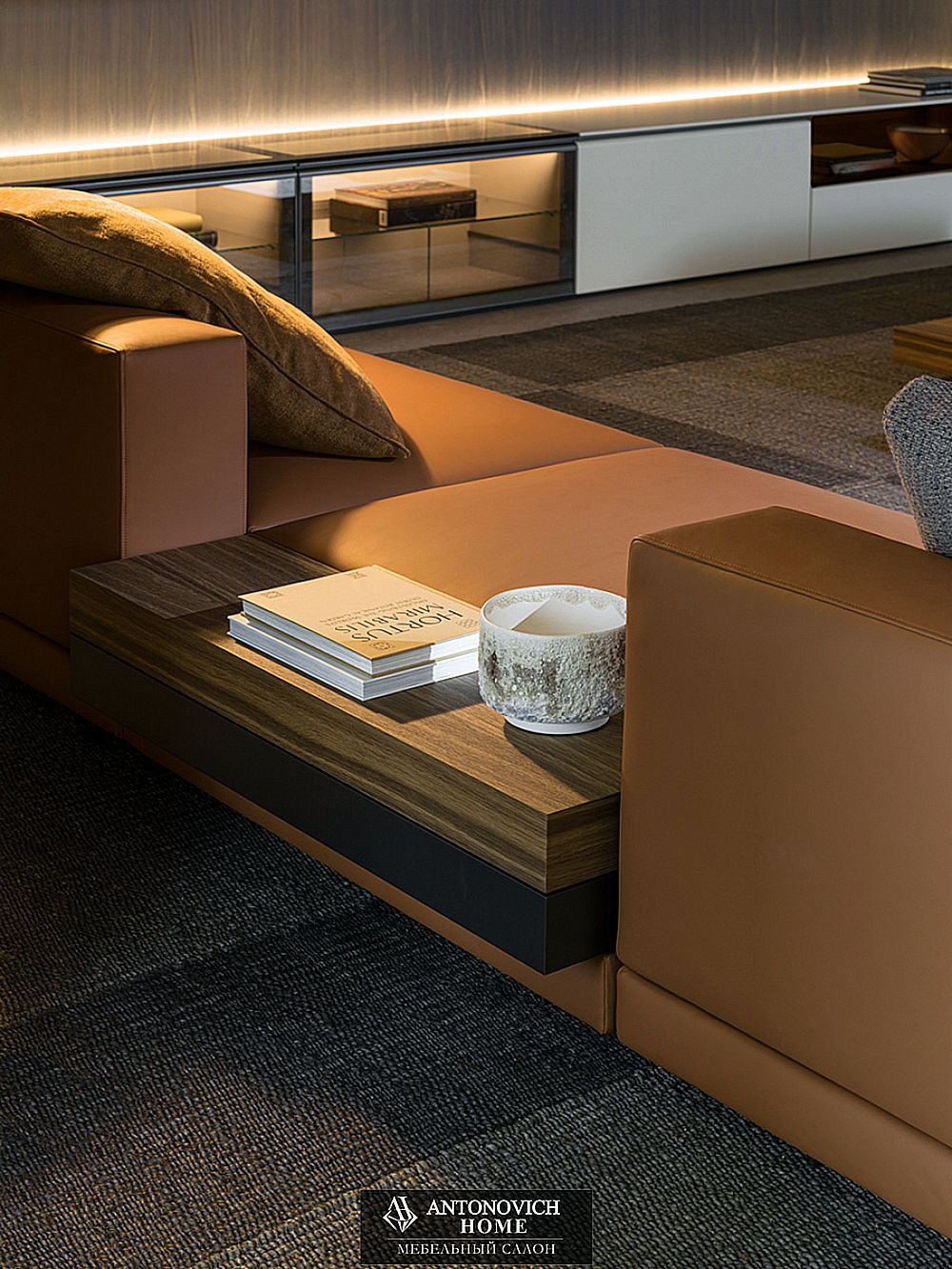 Модульная система отличается концевым модулем, который может быть обит тканью или кожей, со спинками и низкими и высокими подлокотниками, украшенными деревянными или лакированными ящиками для хранения.