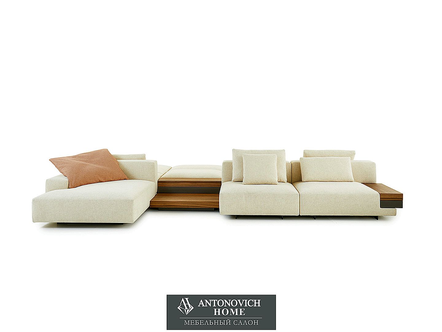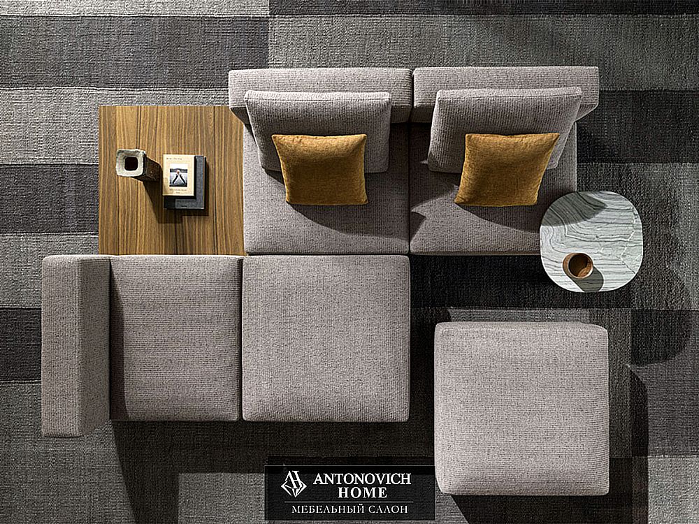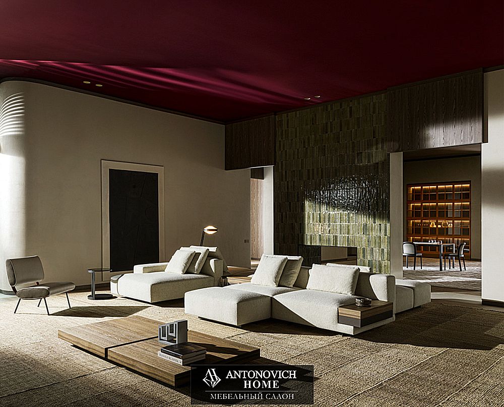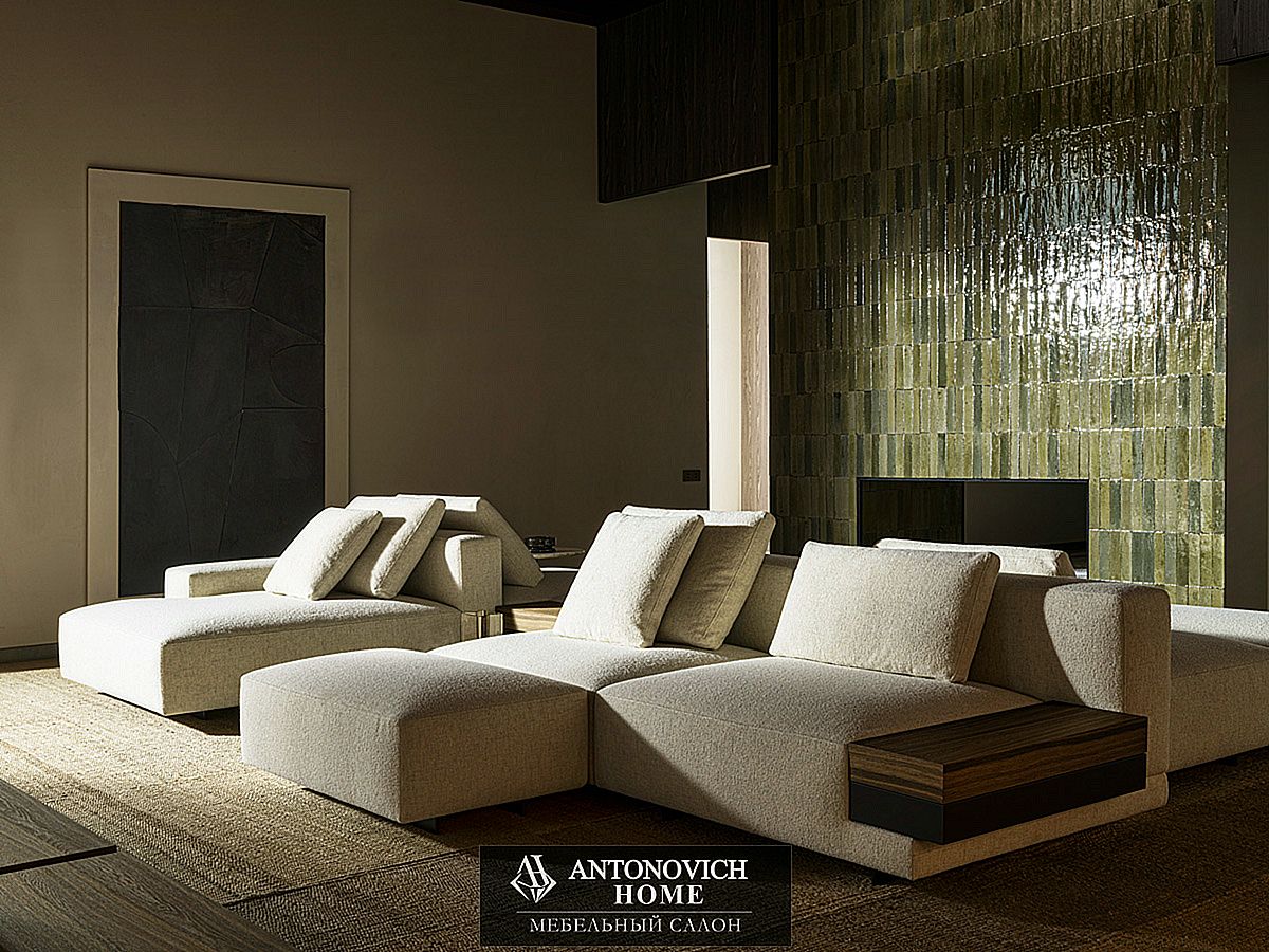 Модульная система отличается концевым модулем, который может быть обит тканью или кожей, со спинками и низкими и высокими подлокотниками, украшенными деревянными или лакированными ящиками для хранения.