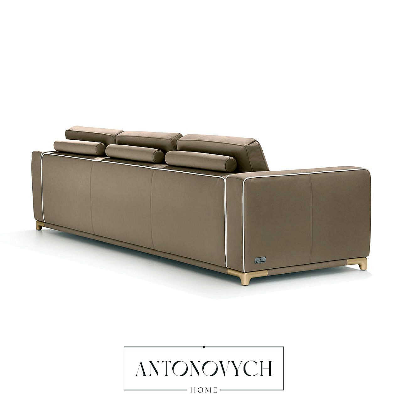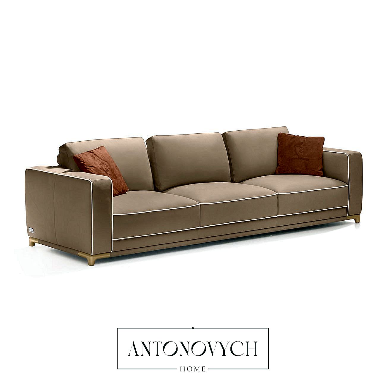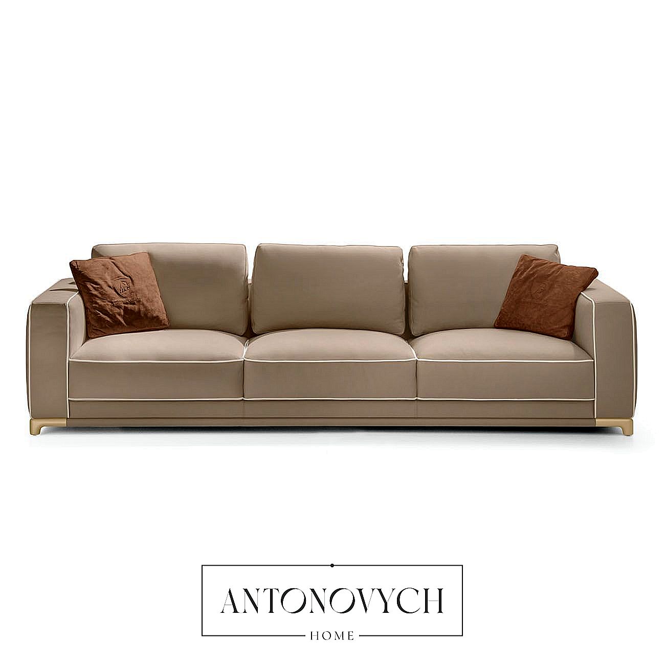 Весь диван TL-99 в коже Nobu col. Сеппия, окантовка из кожи Nobu цв. Panna, основание обито кожей Nobu цв. Сеппия с лакированными ножками цв. Бледное золото.