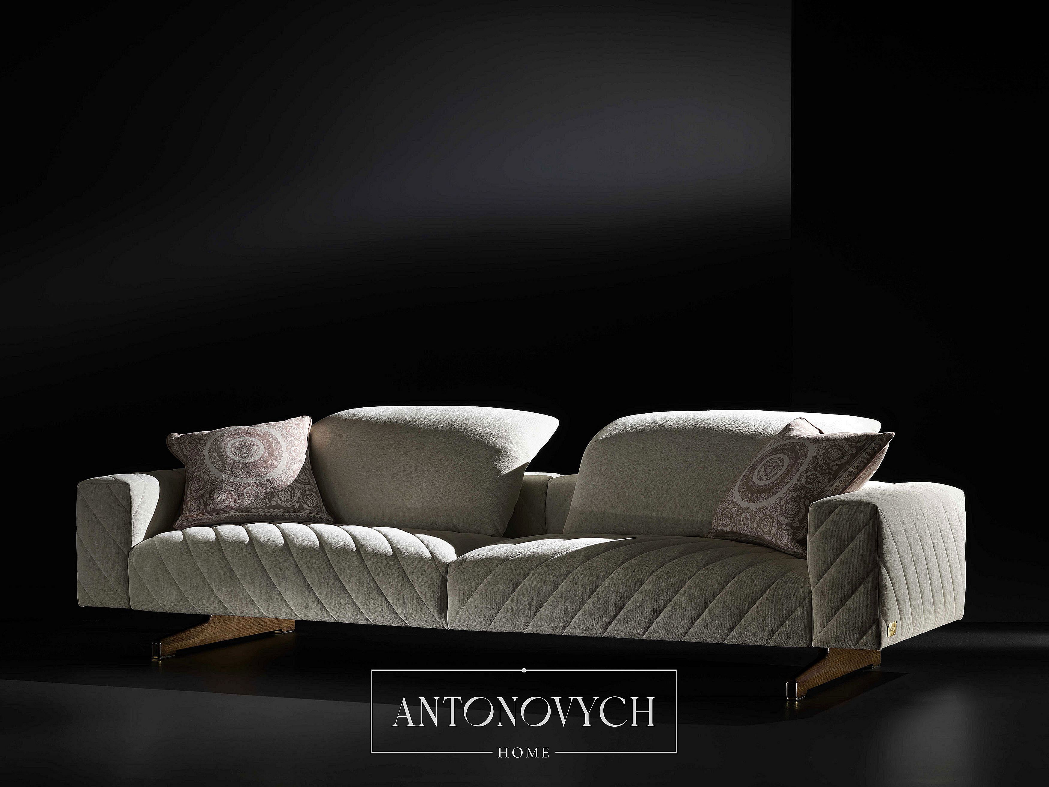 Диван Discovery с современным узором в елочку доступен в ткани или коже. Версаче V визуально ссылается. Подушки служат как спинками, так и удобными подушками. Диванная версия