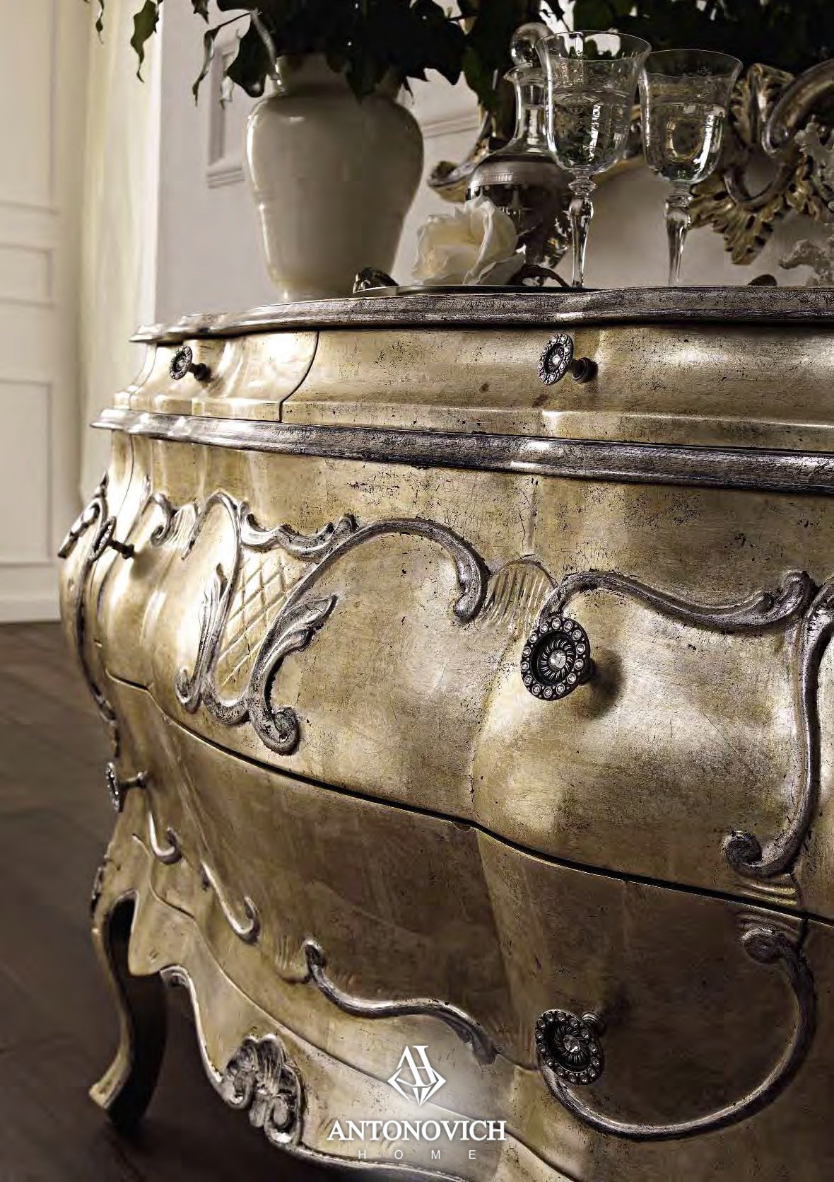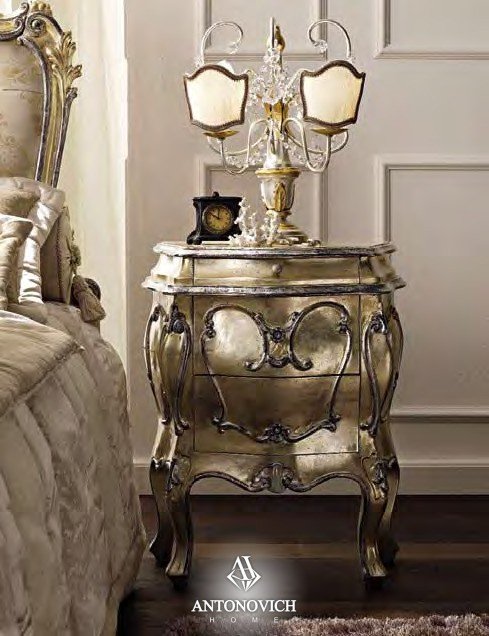 Мастера обработали предметы мебели текстурированным лаком с золотыми и серебряными окрасами, которые расставляют яркие и роскошные акценты.