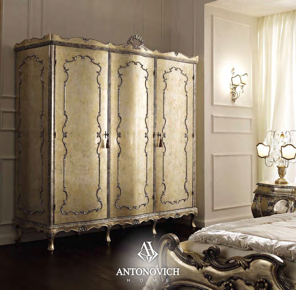 Andrea Fanfani мебель для спальни La notte — это нежная акварельная роспись, ласкающая посеребренный гипс, подчеркивает интригующие переливы гладкой полировки. Мягкий бархат ласкает руки, наводящие порядок в ящиках.