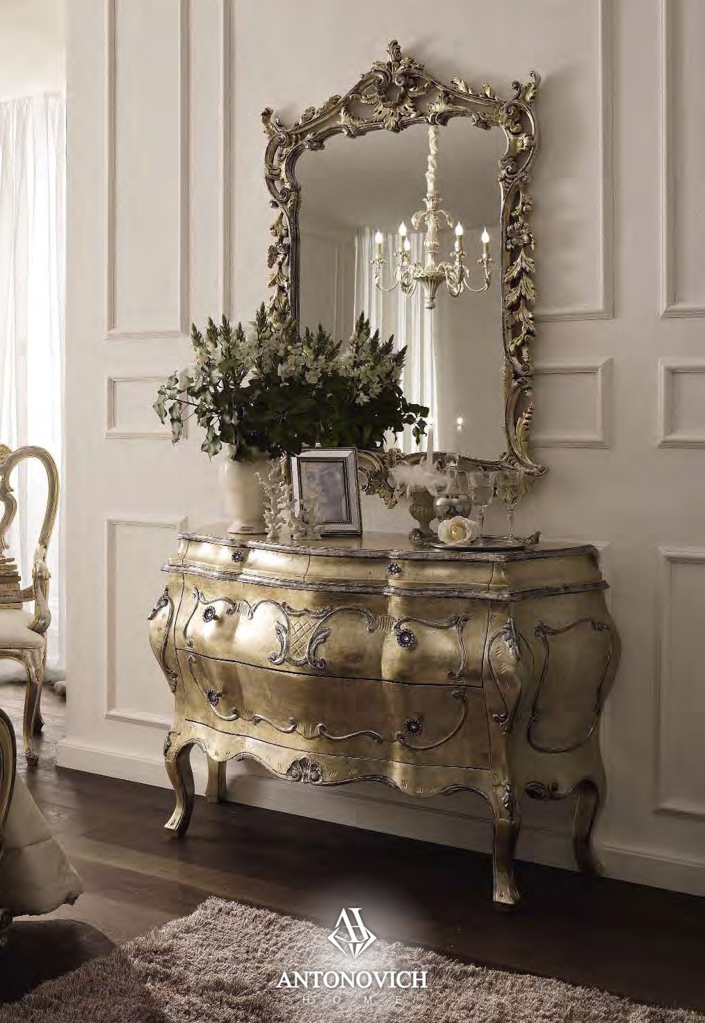 Мастера обработали предметы мебели текстурированным лаком с золотыми и серебряными окрасами, которые расставляют яркие и роскошные акценты.