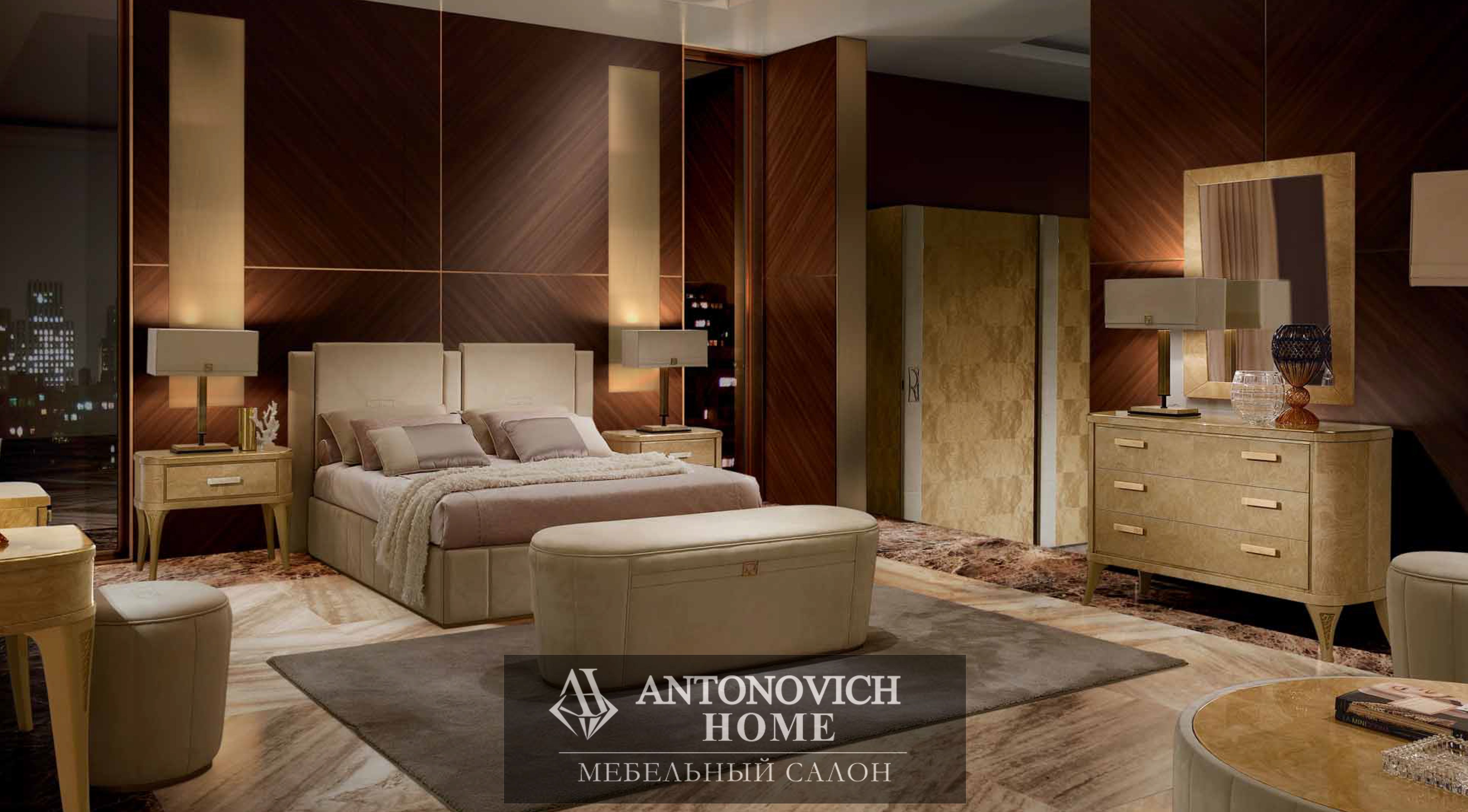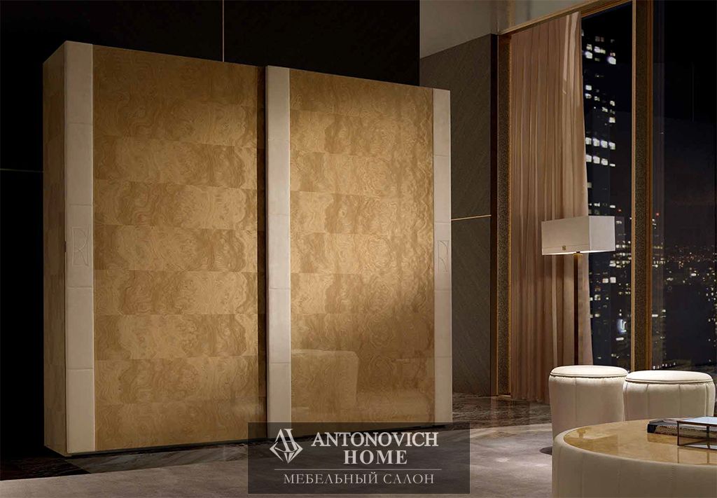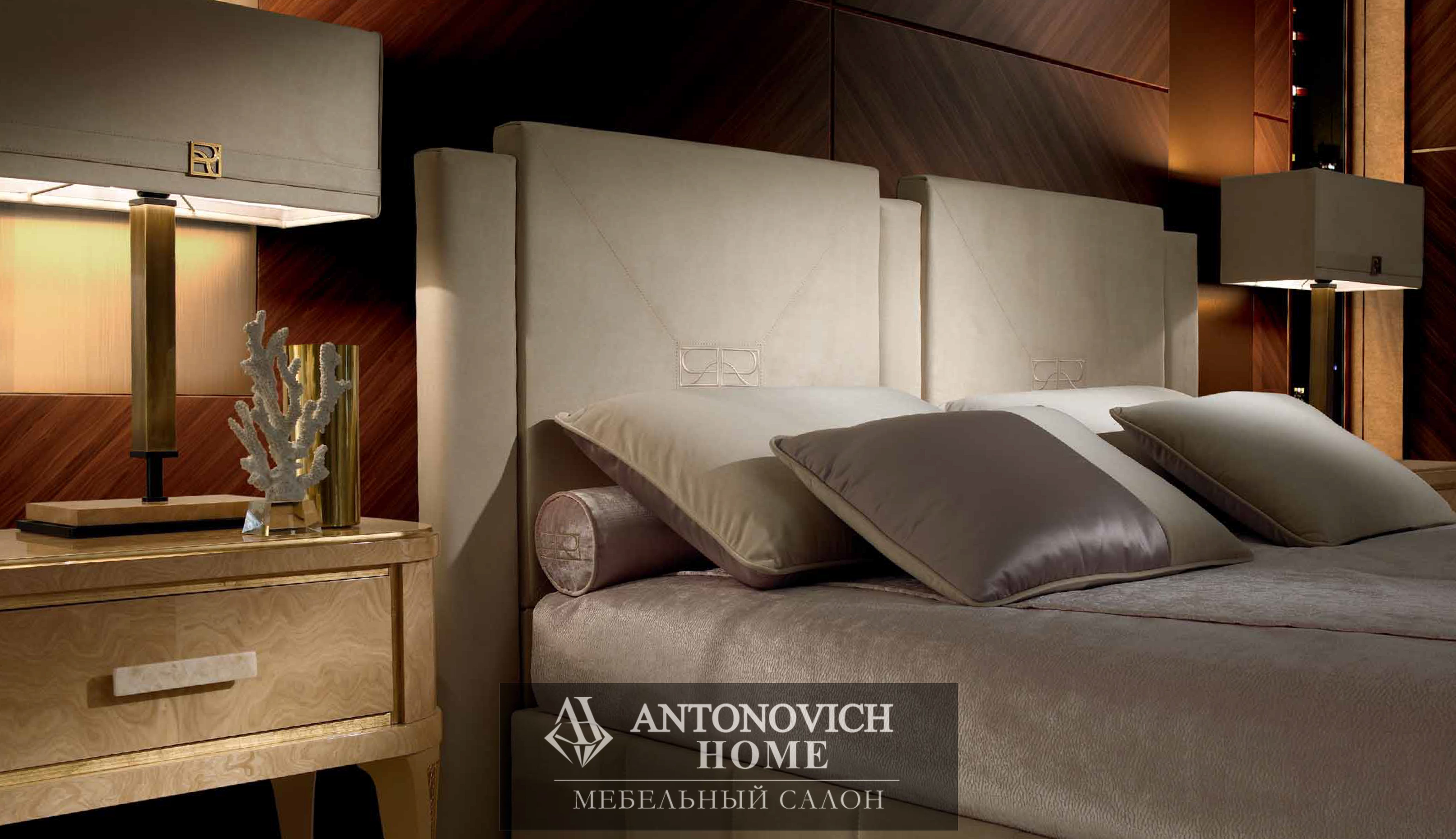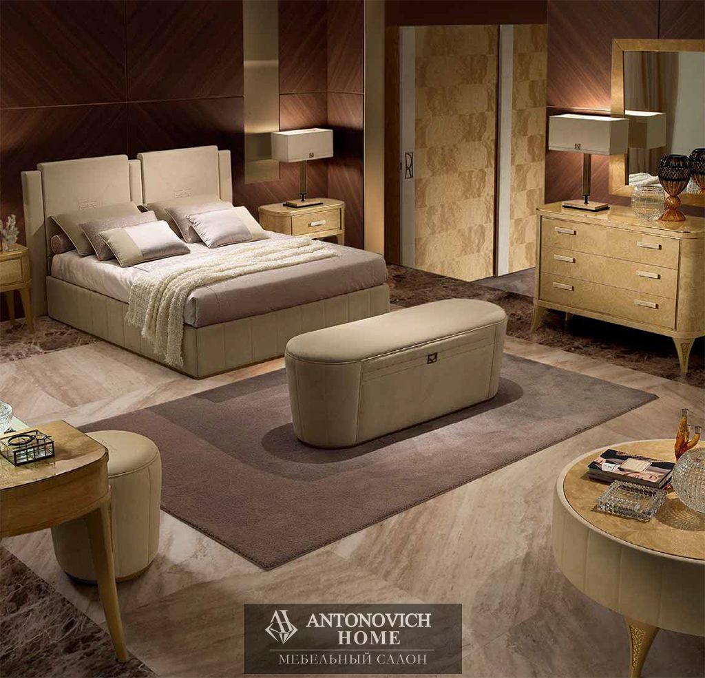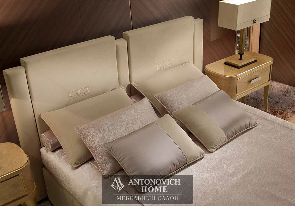 Изголовье кровати, обтянутое нежным нубуком и украшенное фирменной монограммой коллекции, представляет собой яркий образец того, как можно искусно сочетать величественность и комфорт.