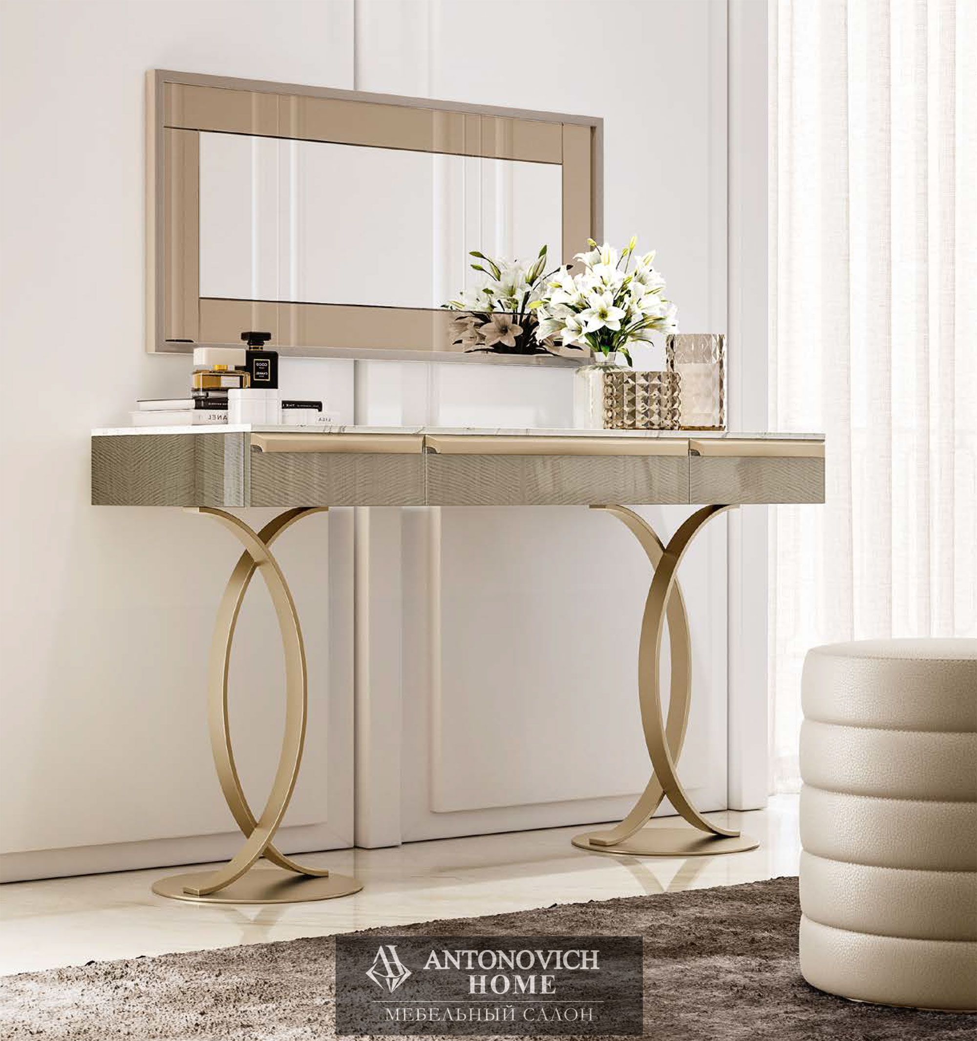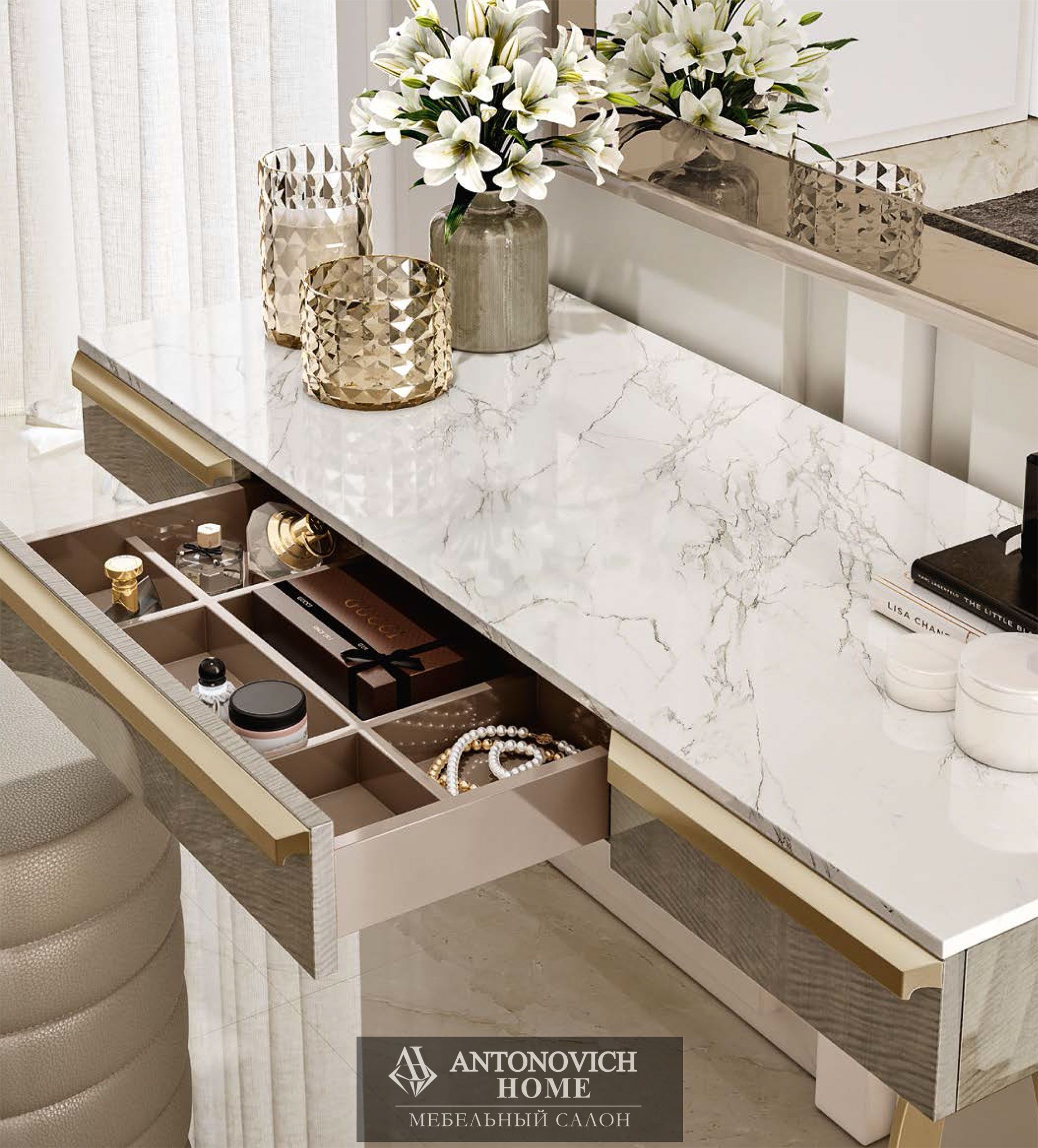 Важность возможности приятно провести время, восстановить свое пространство, найти свой размер в спальной зоне благодаря таким элементам, как туалетный столик, в его легкой и изящной версии благодаря арочным металлическим ножкам и с тонкой мраморной столешницей.