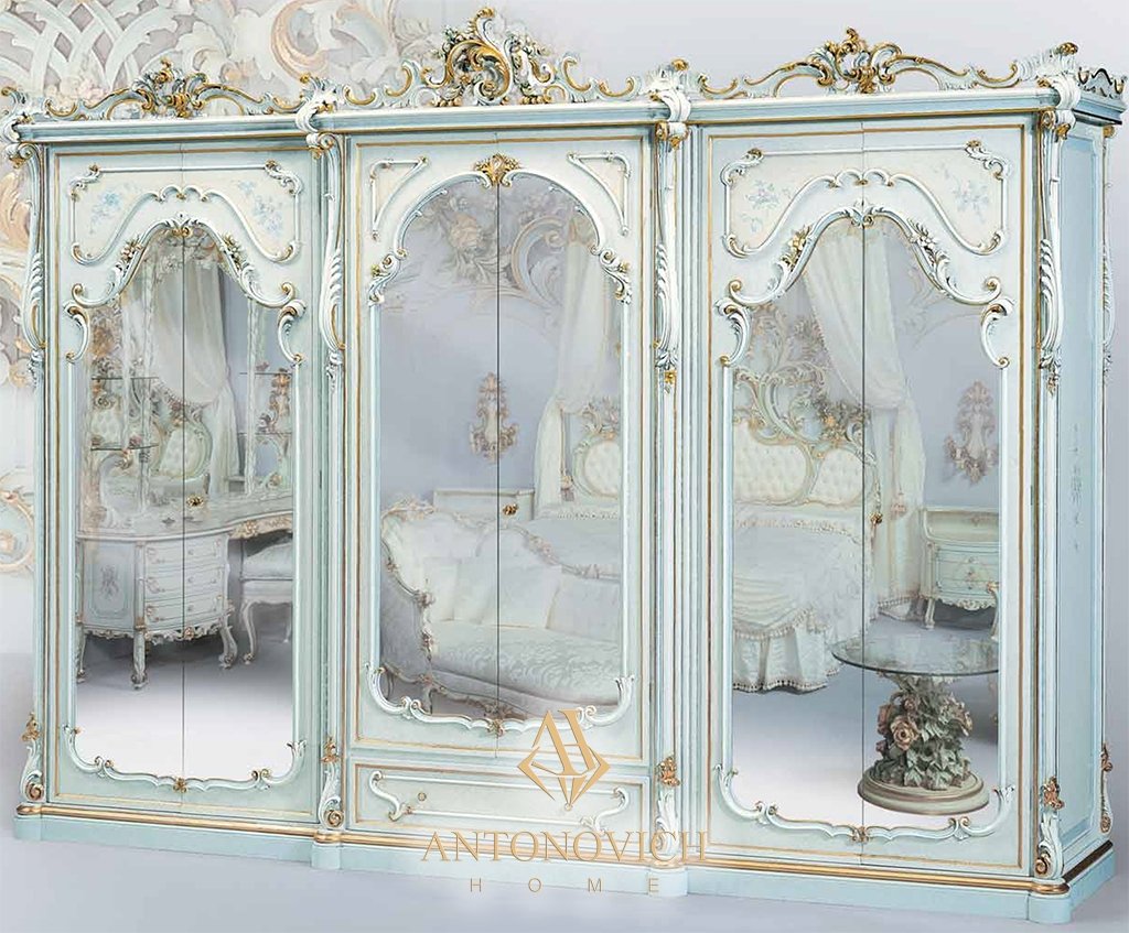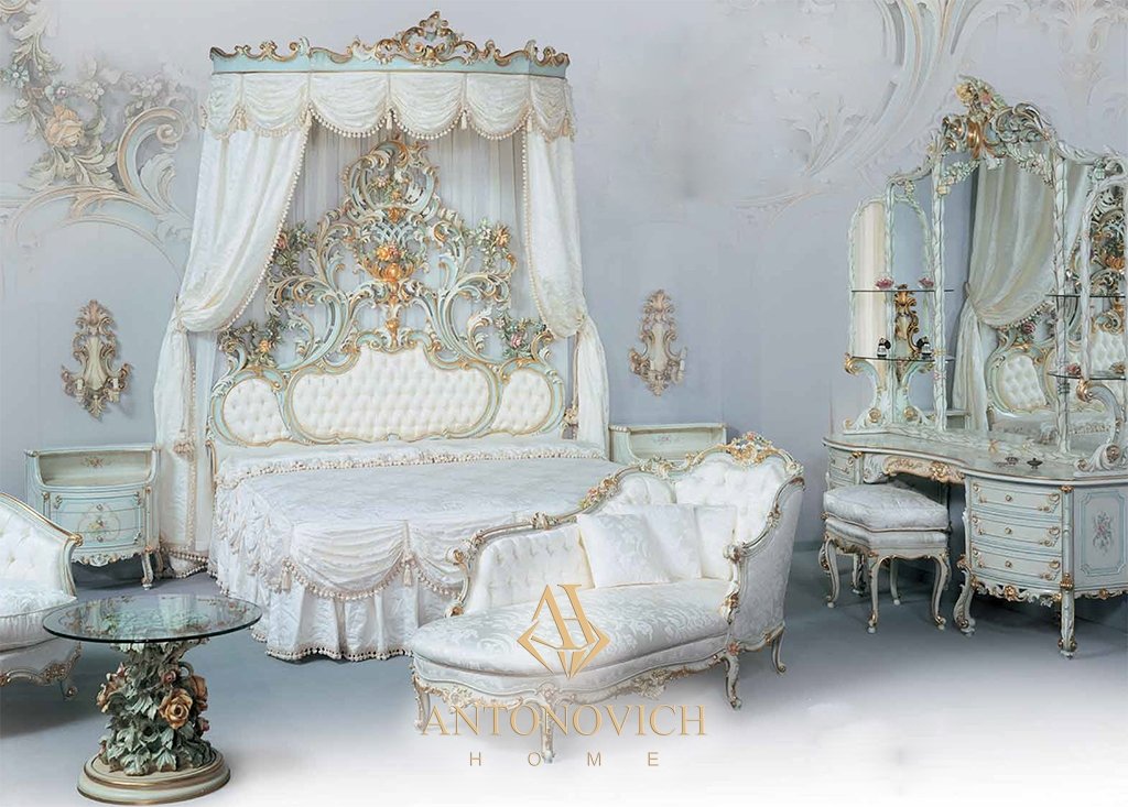 Мебель для спальни представлена в широком выборе отделки, декорирована резным декором вручную, инкрустацией и позолотой, некоторые элементы выполнены из бронзы и мрамора.
