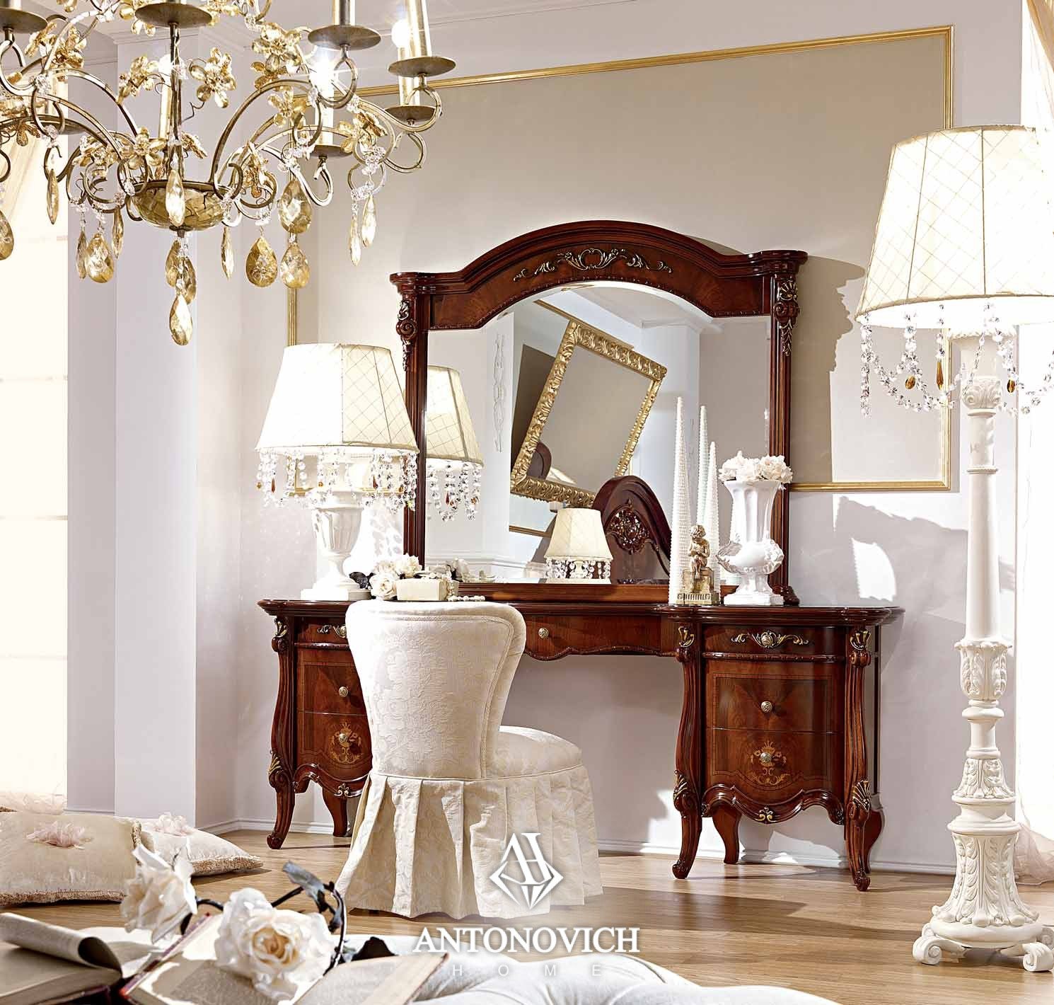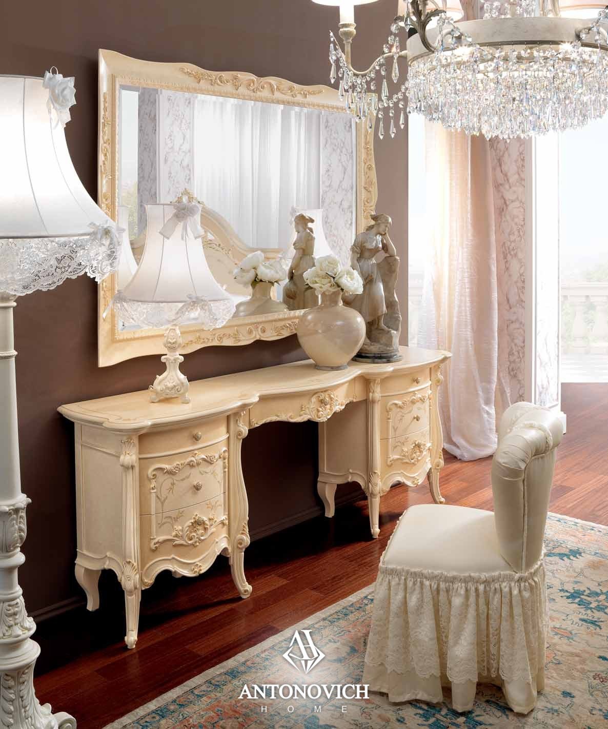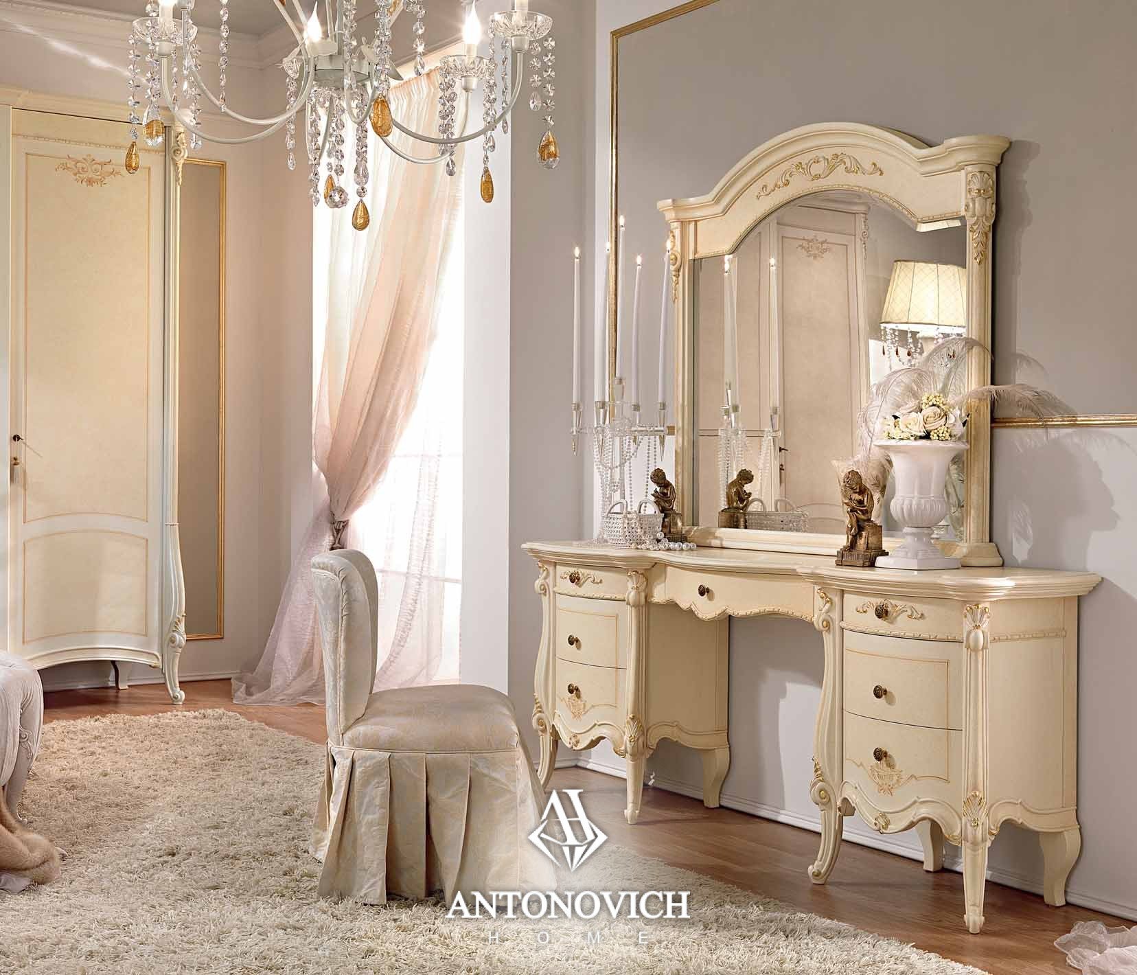 В коллекцию мебели для спальни Prestige, Prestige Plus входят: кровать king с изножьем, тумба прикроватная, скамейка, туалетный столик, зеркало, кресло, комод, пуф, шкаф 4-х дверный, кровать с мягким изголовьем Zefiro.