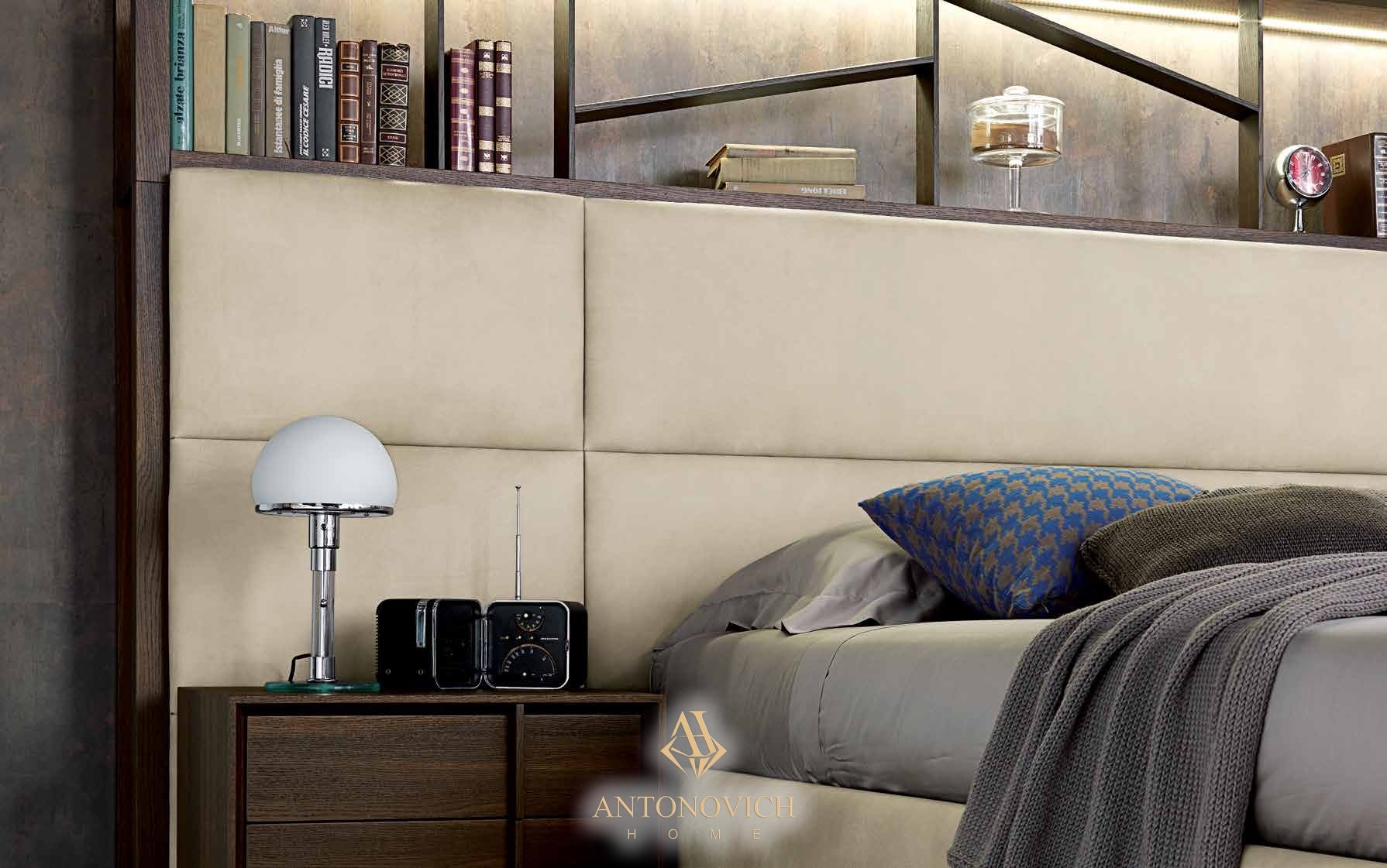 Кровать Bookcase: Настоящая скульптура из дерева, выполненная из стоек и декоративных диагональных реек, а в две большие полки встроены подсветки LED с индивидуальными выключателями. Изголовье кровати может быть выполнено в различных отделках: ткани, натуральной коже, искусственной коже.