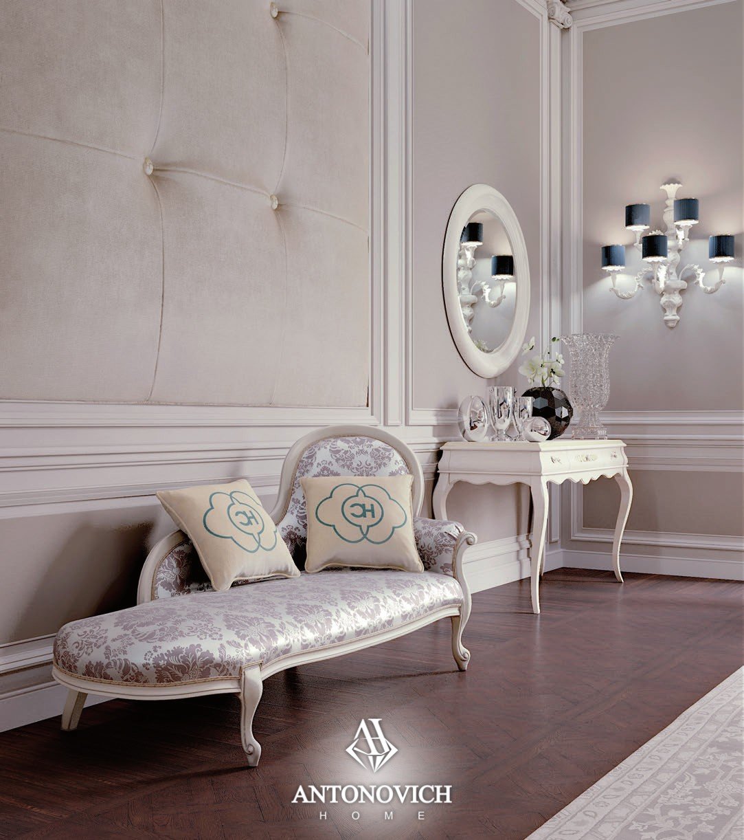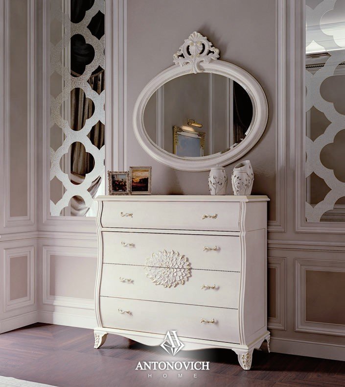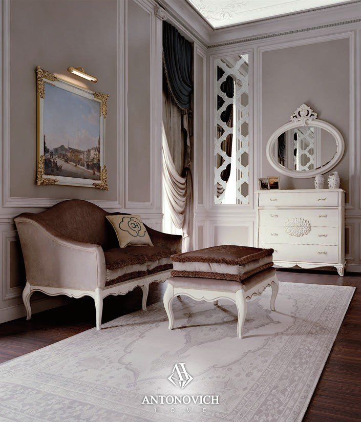 В коллекцию мебели для спальни входят: кровать, прикроватная тумбочка, кушетка, кресло, зеркало, пуф, шкаф, диван.