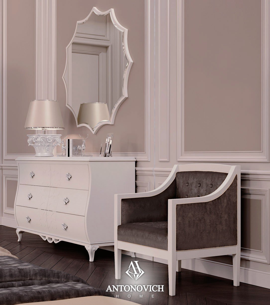 В коллекцию мебели для спальни входят: кровать, прикроватная тумбочка, кушетка, кресло, зеркало, пуф, комод, комод высокий, туалетный столик.